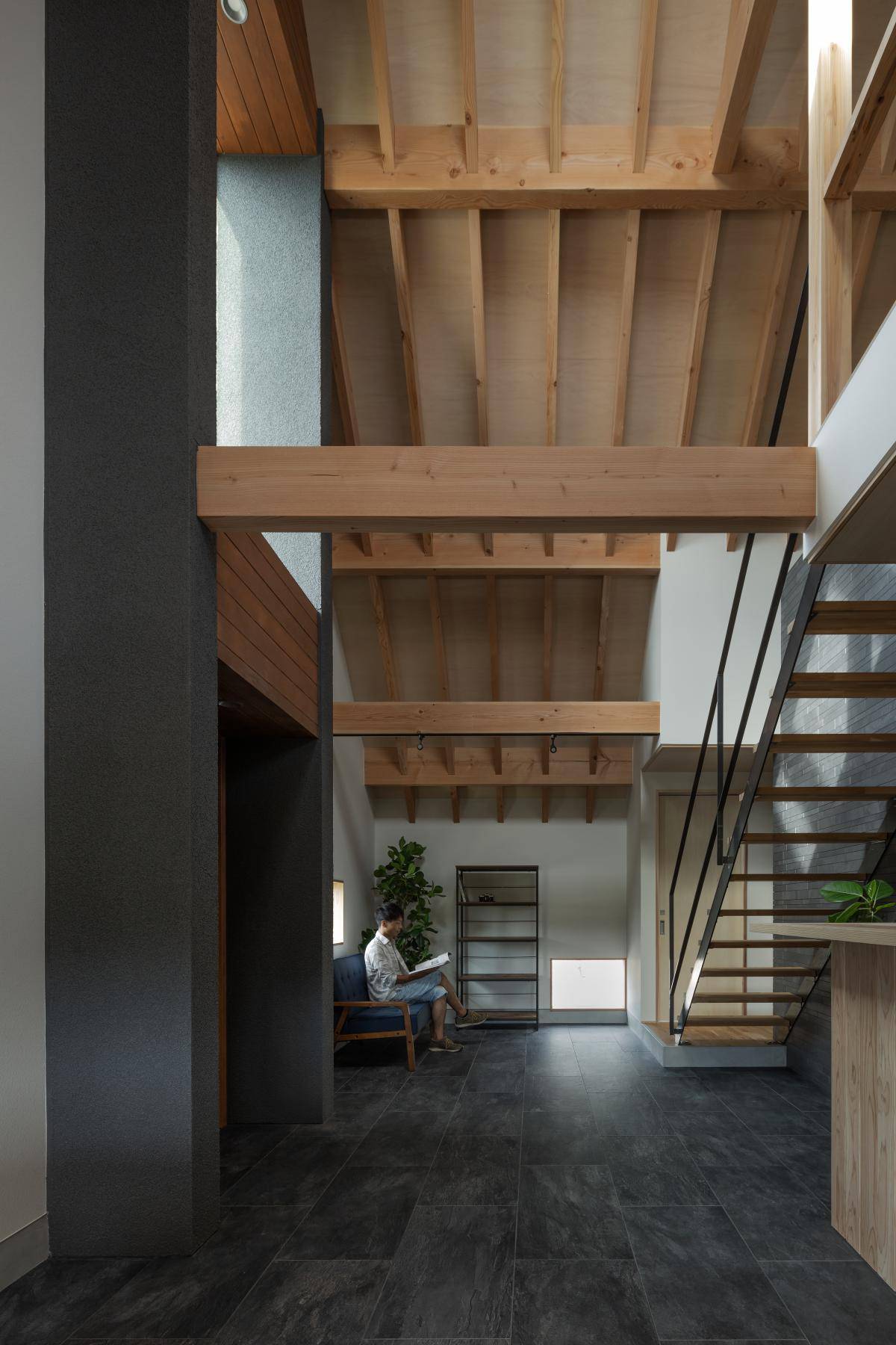 本プロジェクトはT字路の突当りで三方道路に囲まれた街のアイコンとなる立地に計画された住宅です。クライアントはこの住まいで将来小さな喫茶店もしたいという夢を持っておられました。そこで山小屋の喫茶店のような三角屋根のボリュームを2つ創り出しそこにプライベートな空間と半パブリックな空間を落とし込みその2つを緩やかに繋げる住まいを計画しました。