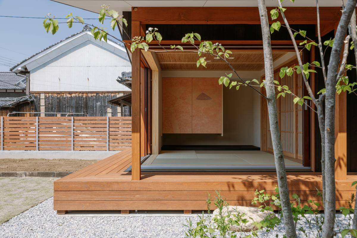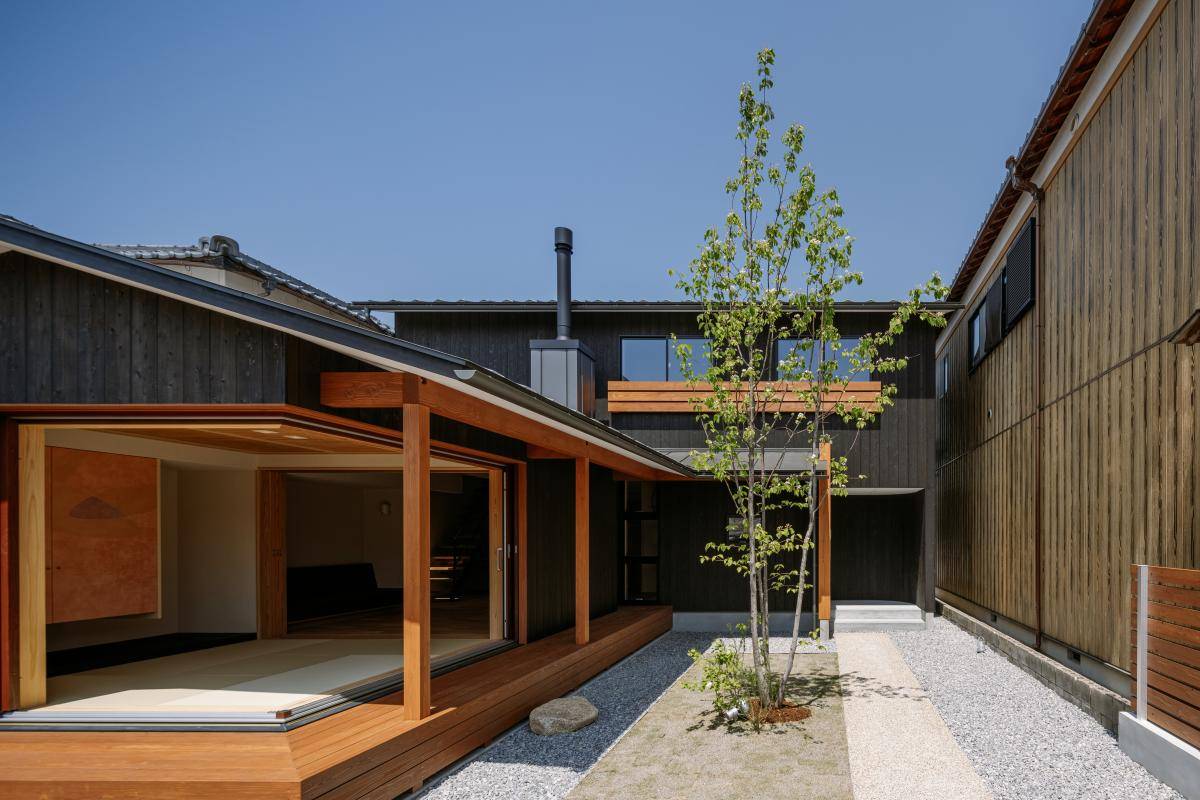 そこで本計画では建物自体を南に向かってL型に配置し、それを囲むように中間領域としての縁側と外部の中庭を設けました。また、縁側に対しL型のフルオープンの木製窓を設けることで内部と外部を緩やかに繋ぎ、間に軒下空間の縁側を設けることで中間領域としての心地よい居場所を創り出しました。