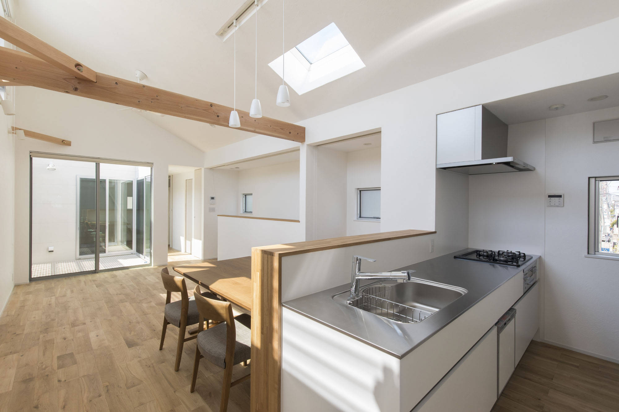 敷地の周囲を隣家に囲まれた閉鎖的な環境で、中庭や高窓を活用して日差しの降り注ぐシンプルモダン住宅を計画しました。建物中央に1~2階までの吹き抜けの中庭を設け、日差しを1階まで導いています。2階はハイサイド窓を南側に大きく配置して、プライバシーを確保した上で日差しを室内に取り込めるようにしました。外観は白いフラットサイディングと杉板で和モダン調のシンプルモダン住宅としました。
