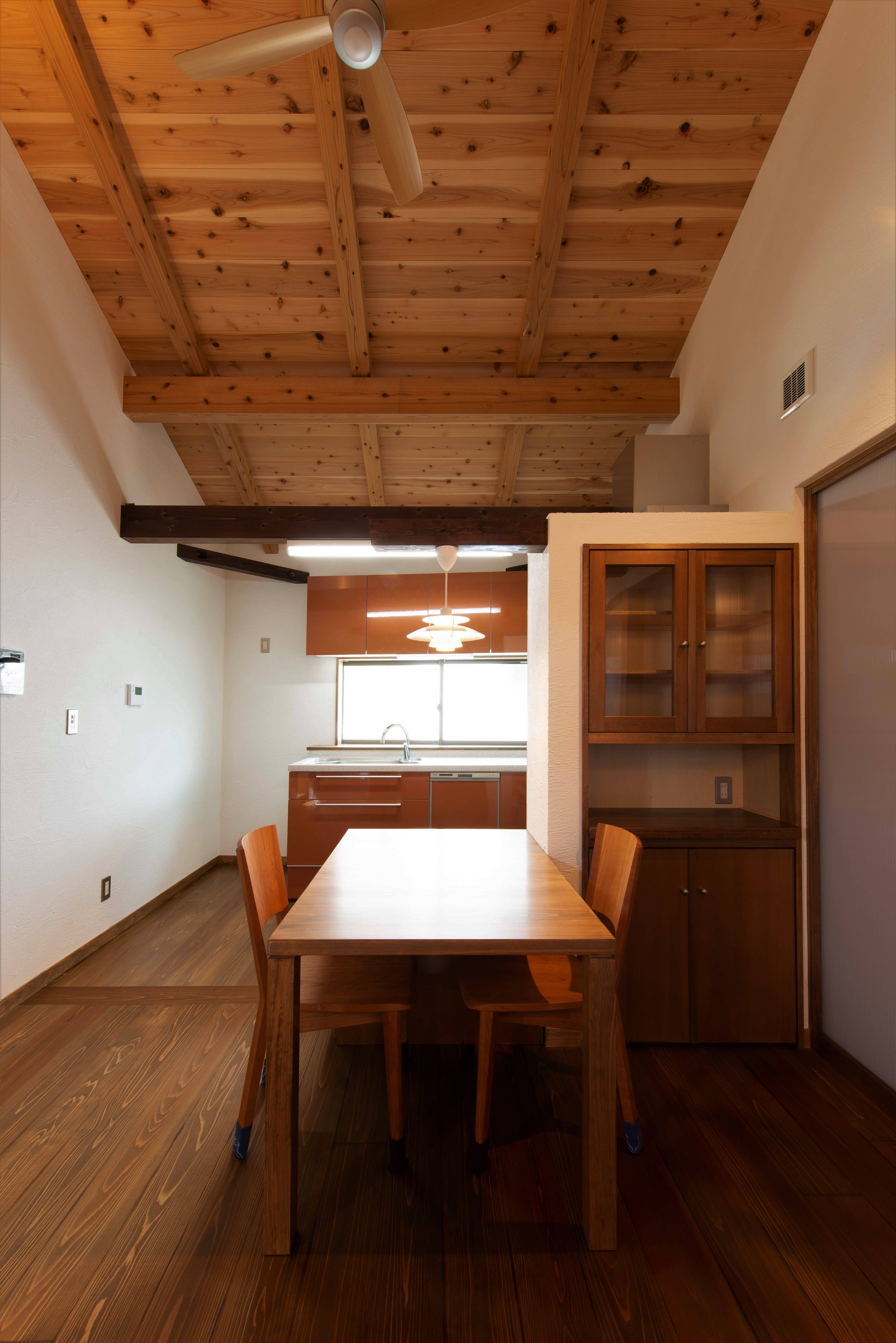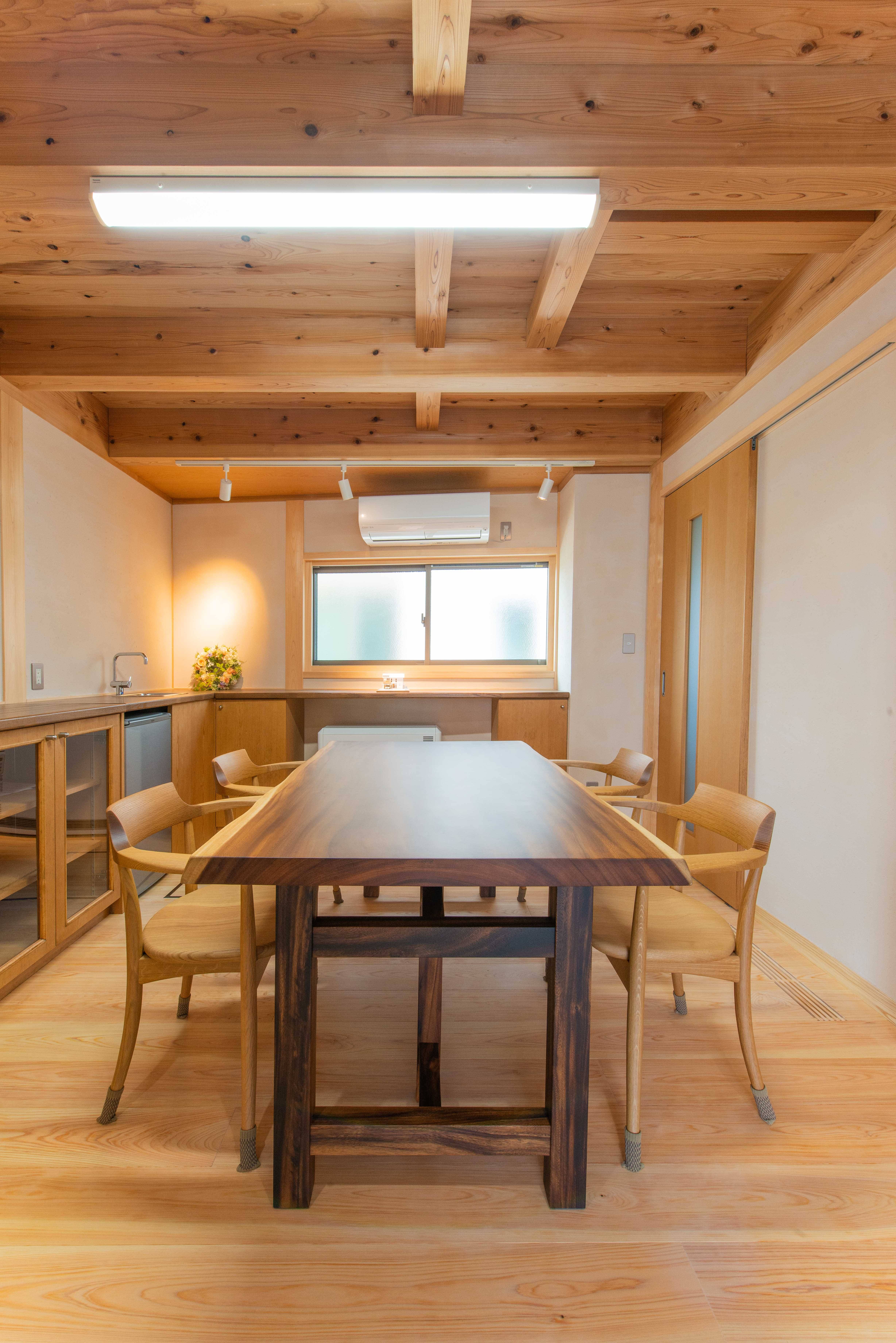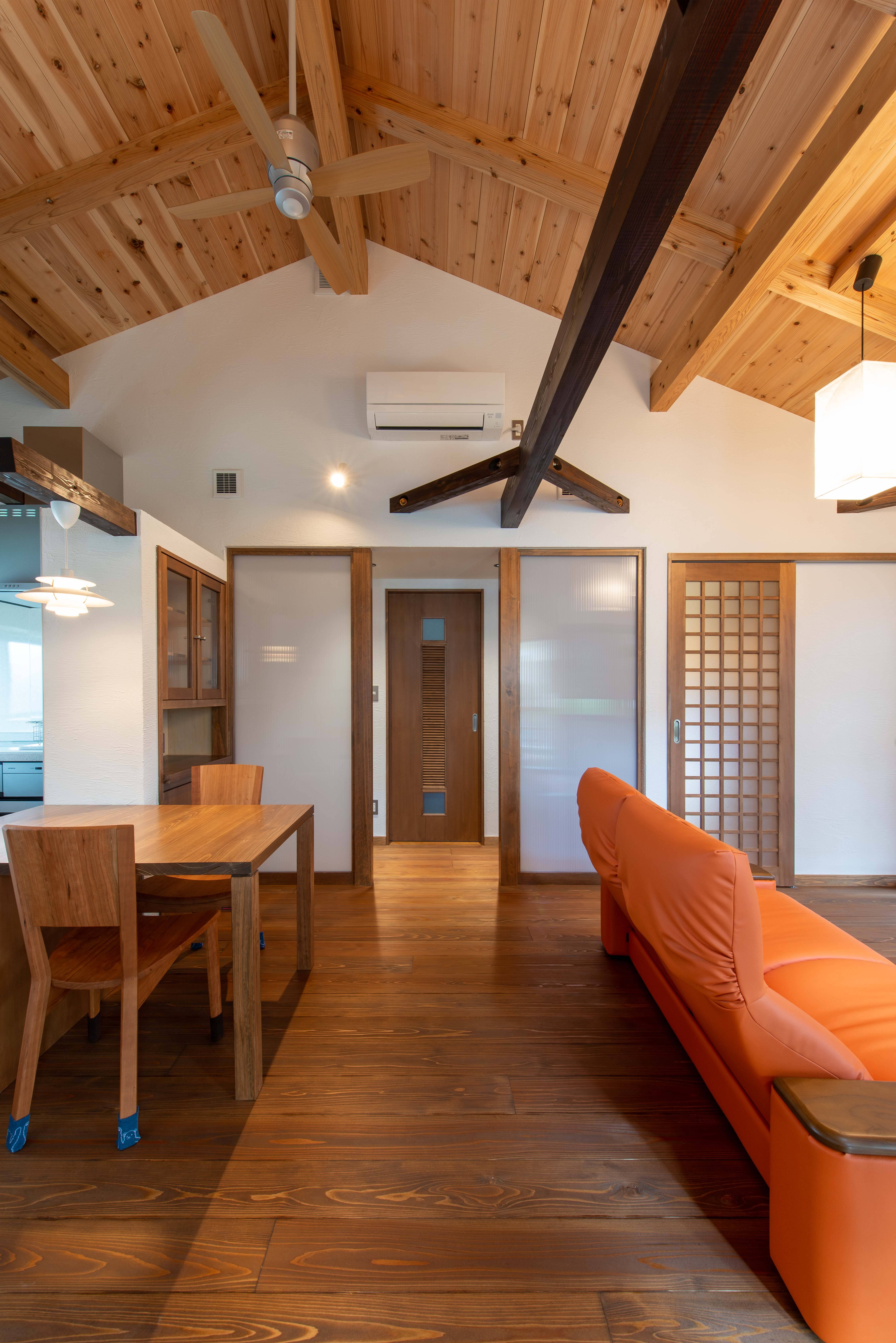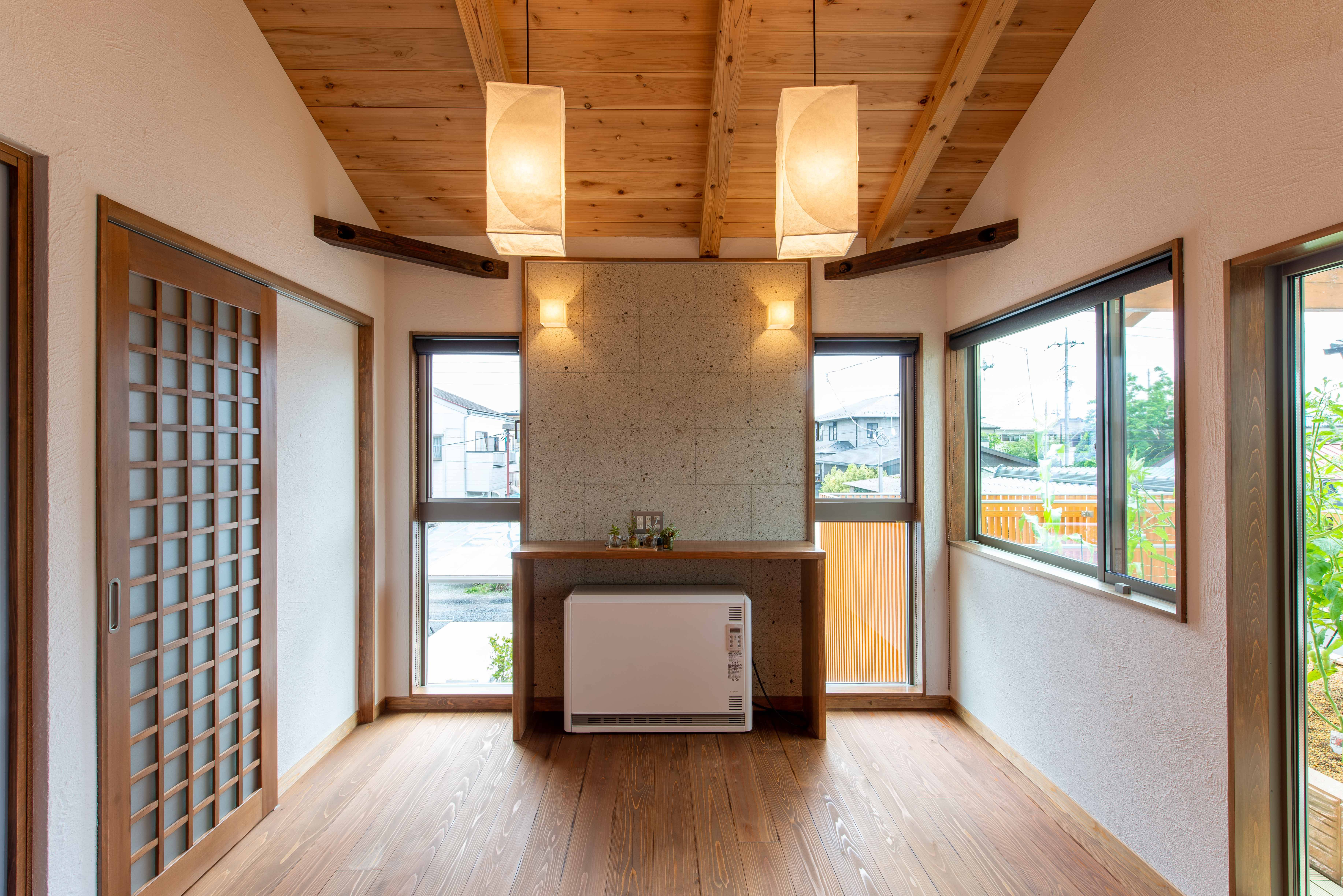 1階は真壁造り(しんかべづくり=壁から柱の表面が見える造り)となっており、趣のある木の温もりに癒される空間となっています。2階は一見洋風な雰囲気ですが、天井を見上げれば梁や屋根下地が現しとなっており、和を感じることができる和モダンな空間となっています。