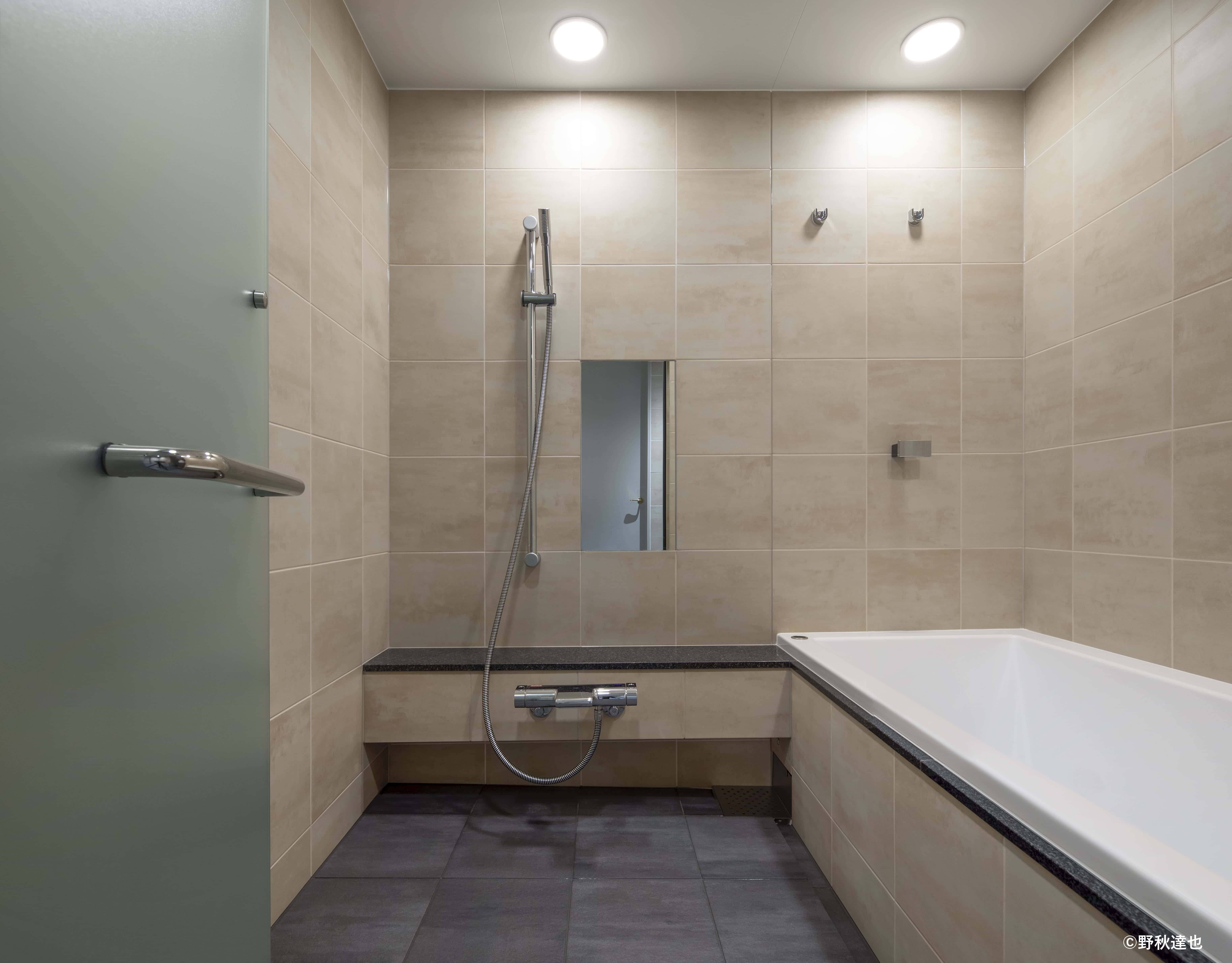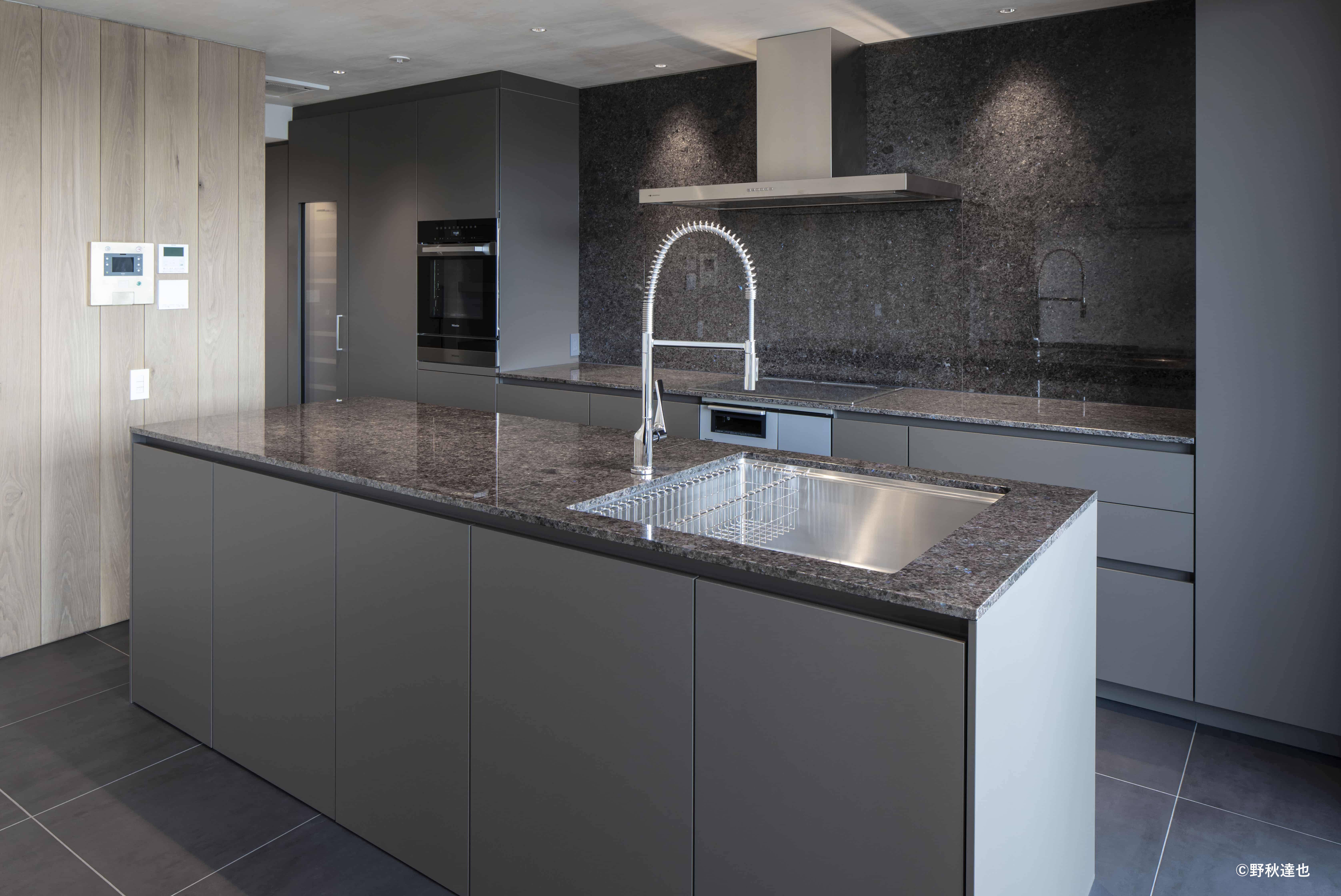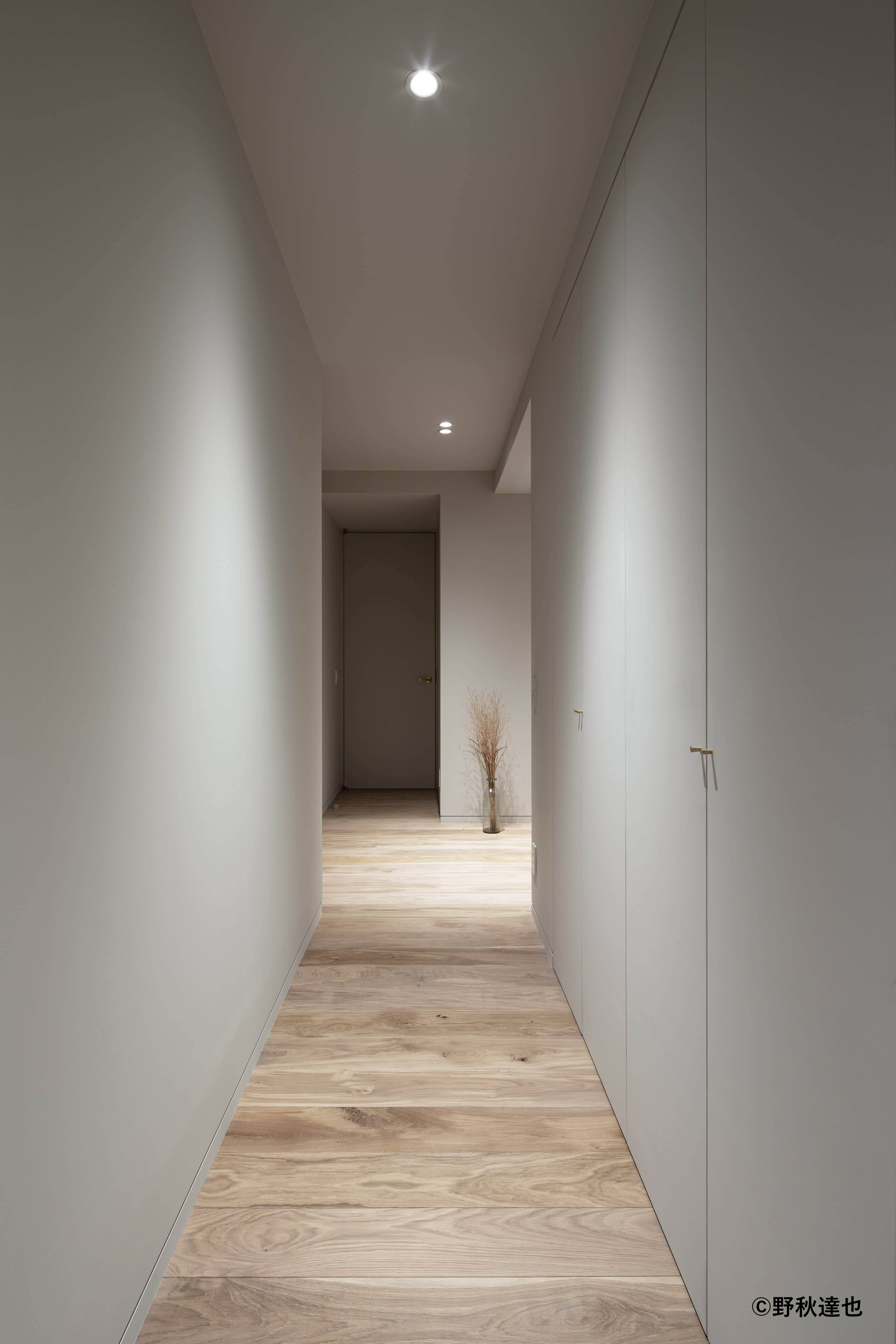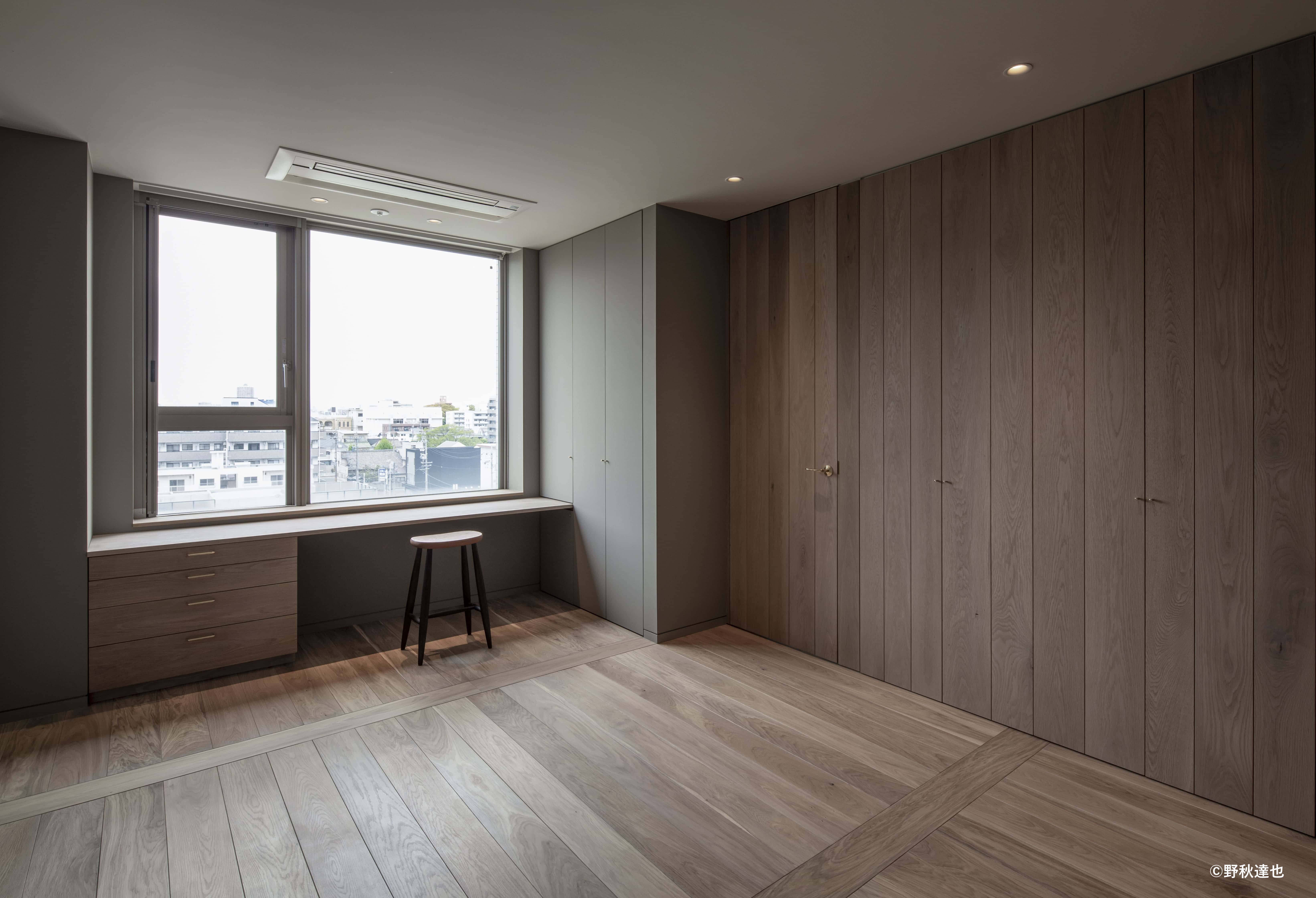 インテリアの基本構成は床をオーク無垢材のフローリング、壁・天井は塗装仕上げとし、その壁の随所に床から天井までいっぱいのオーク無垢材の小幅板が現れる。LDKのある主室は黒いタイルの床に、壁・天井は寒水入りの漆喰塗り、出入口や家具扉を含む長手一面の壁はオーク無垢材が7m以上連続し、キッチン側の壁はワークトップに合わせた御影石としており、各面に異素材が対峙する。