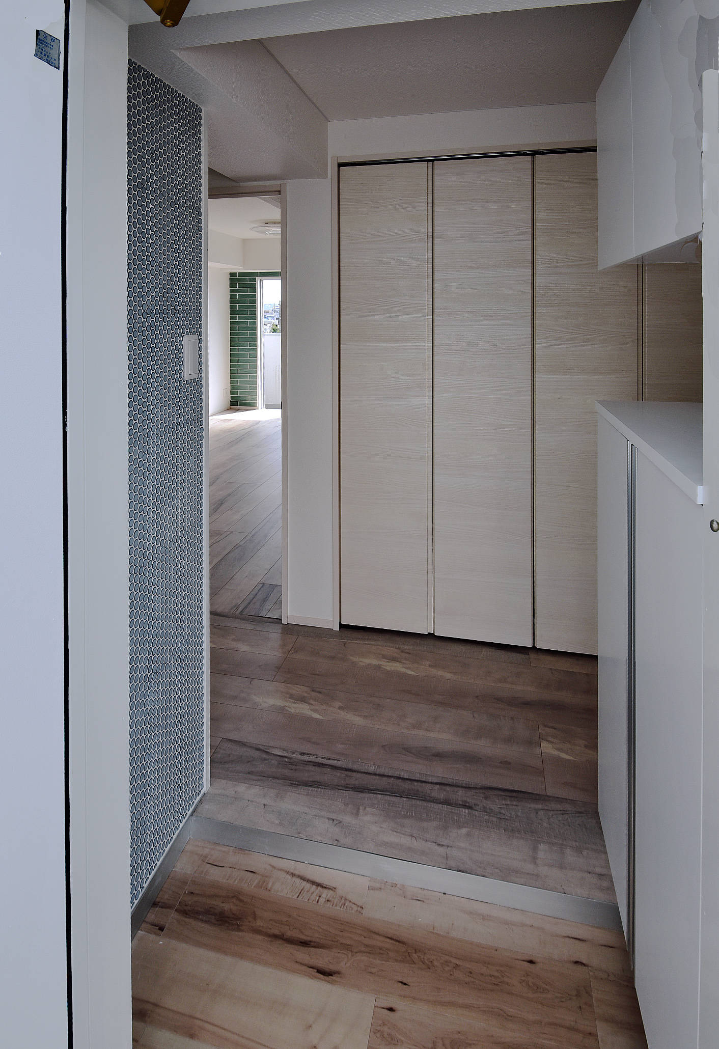 マリンブルーのモザイクタイルを貼った玄関ホール