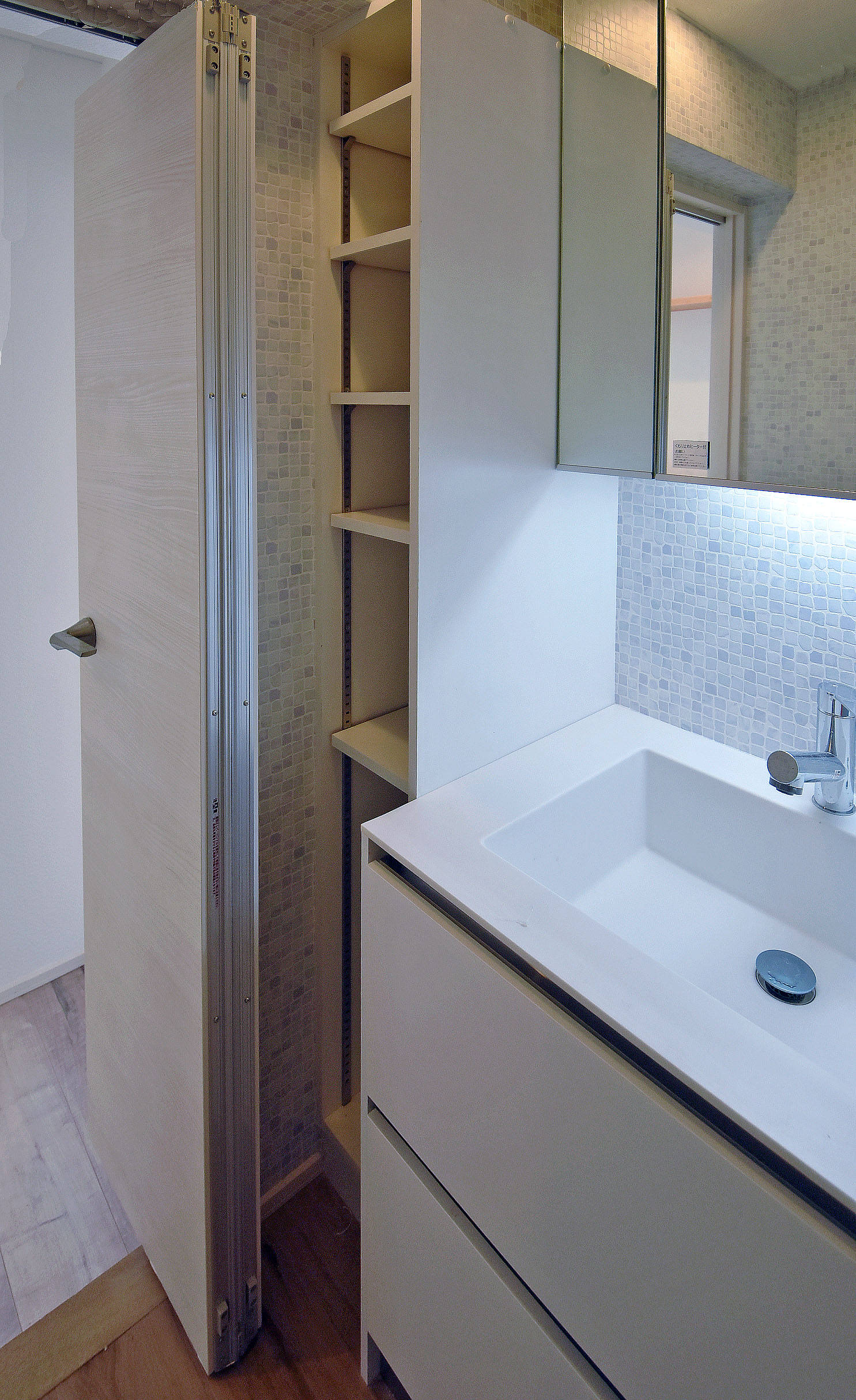 おしゃれな照明をセットした洗面化粧台、可動棚も便利