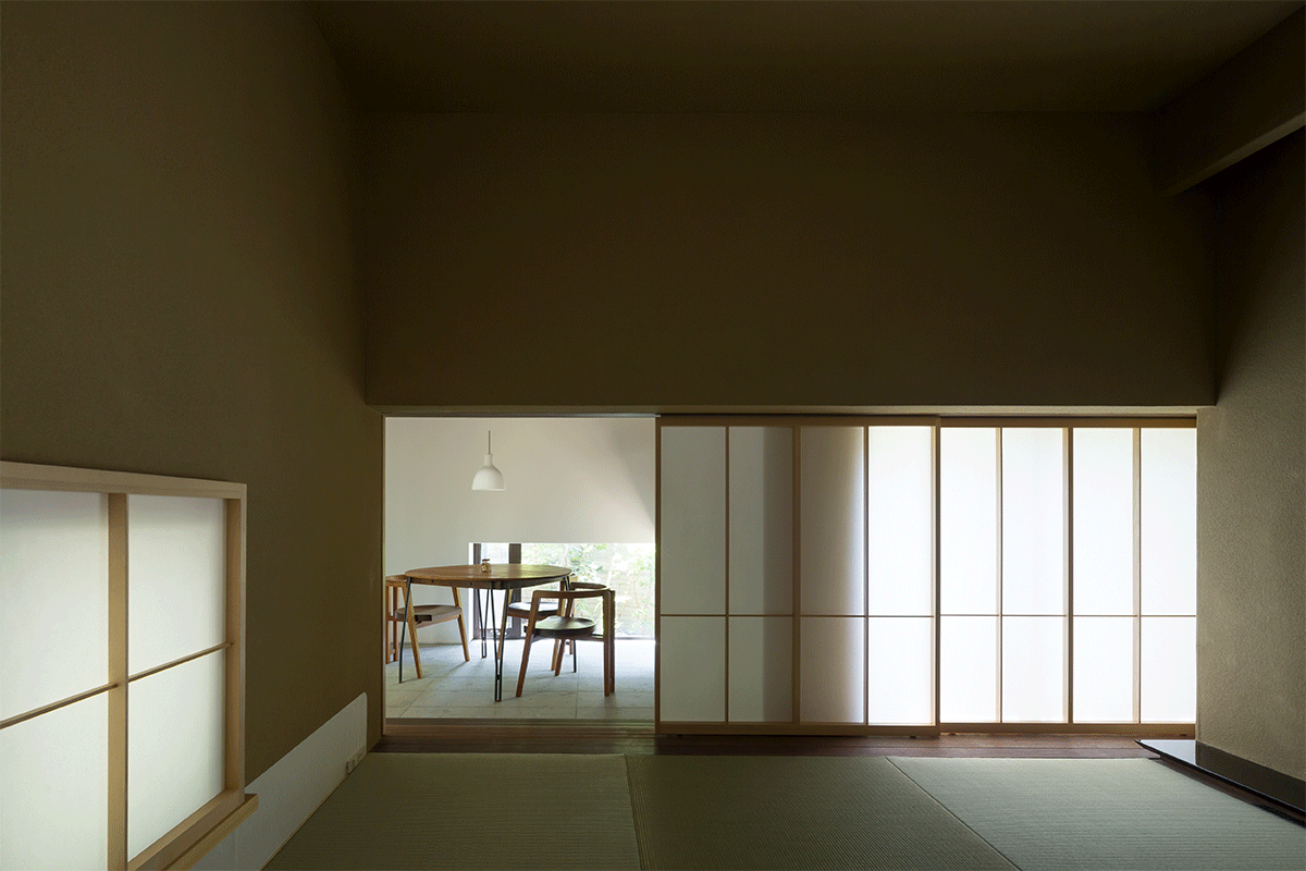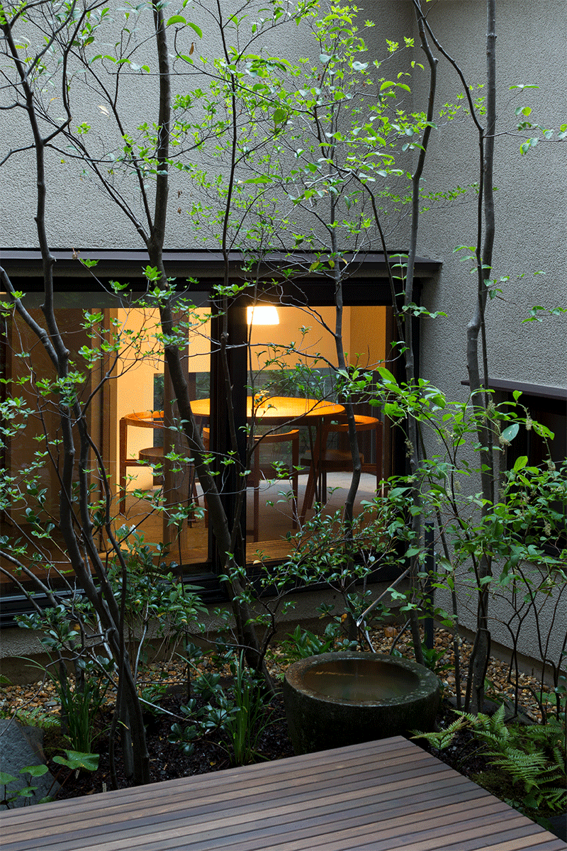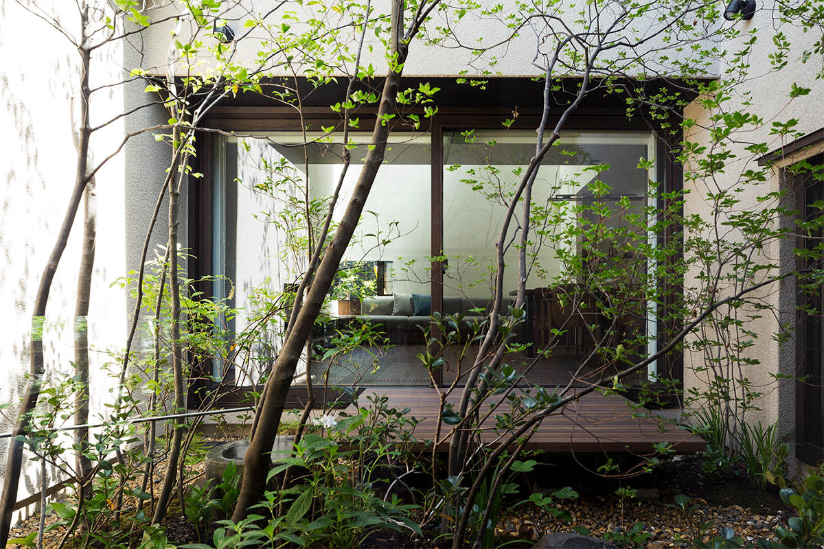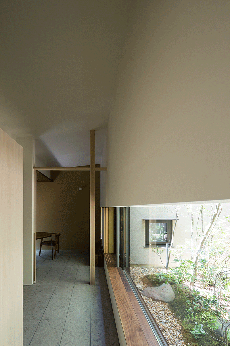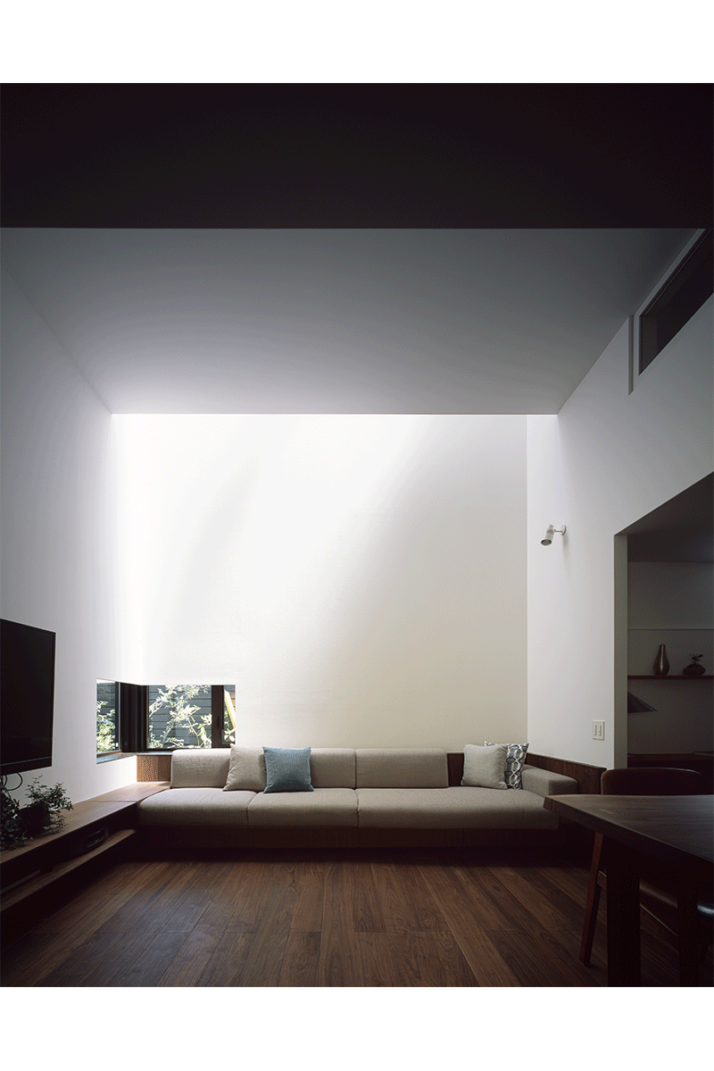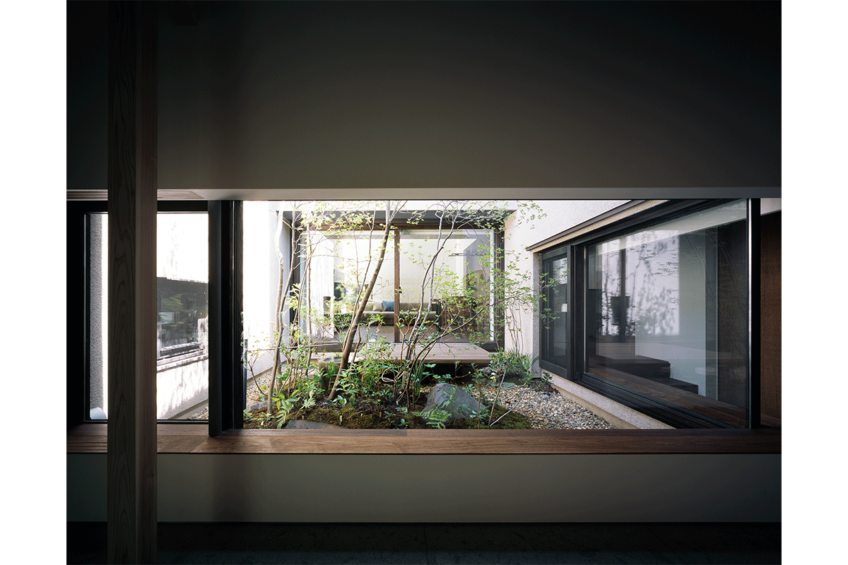 街中の住まいにおいて、取り込む風景や光は断片的なものになりパノラマ的な全体像は見えませんが、そのトリミングされた部分だからこそ、その先のイメージは倍増され内外は広がりを得て解け合い、限られたスペースに多様で豊かな光を呼び込みます。あちこちに家族の居場所があり「小さな自然」や「奥行き」「陰翳」を感じて暮らす住まいになりました。