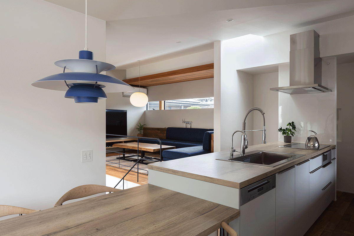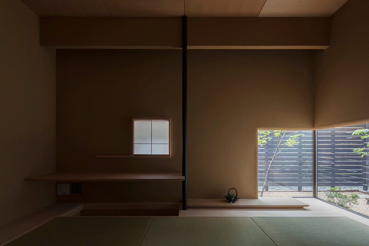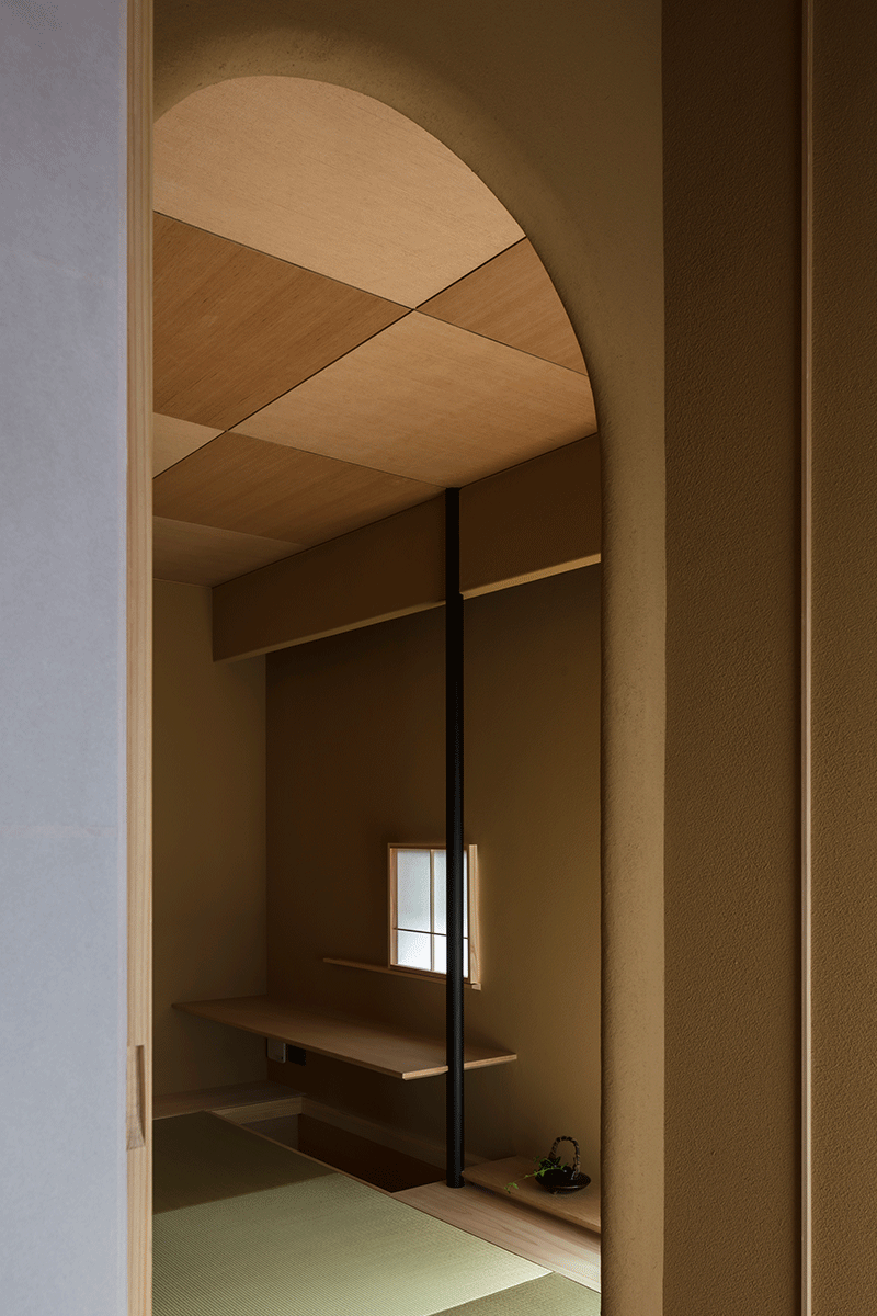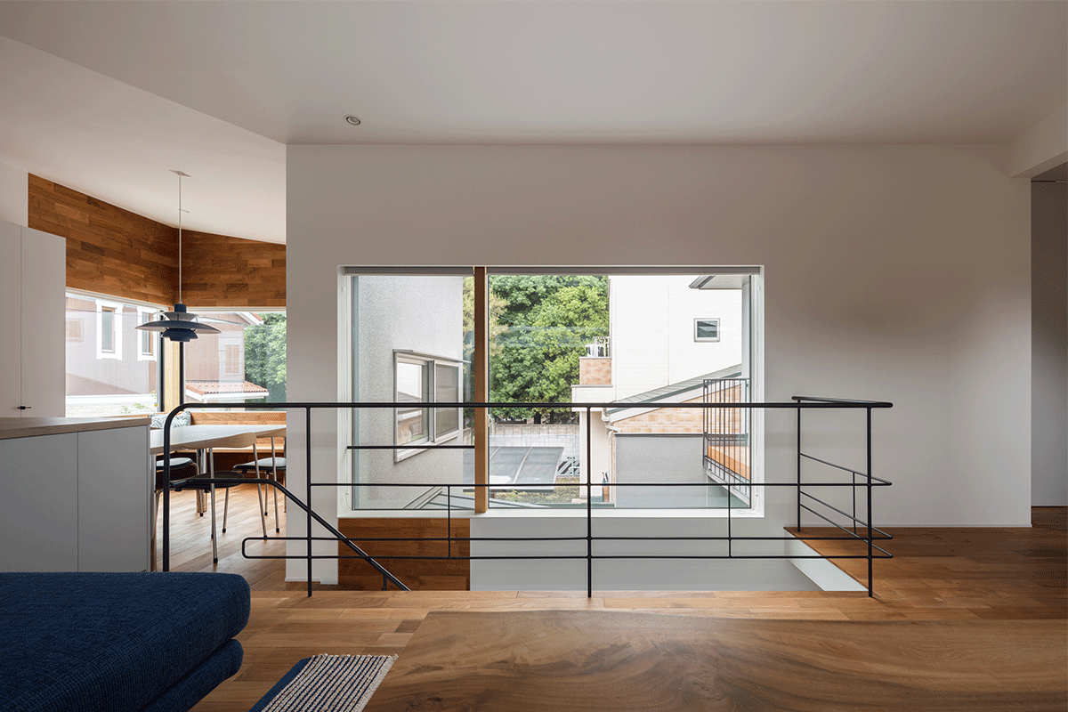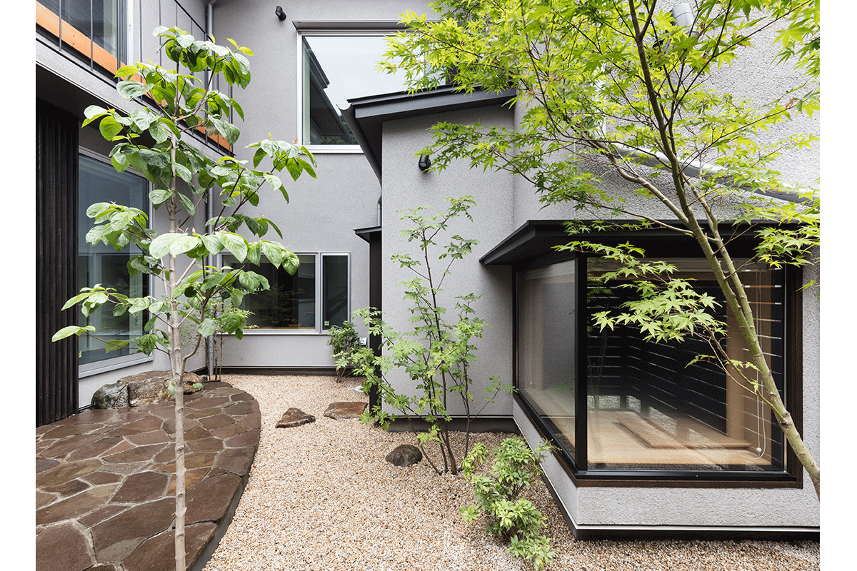 一階は中庭を囲み、玄関、書斎、和室、洗面、バスルームを配し、どこに居ても緑が望めるようにしました。和室は、心を静める空間装置として自然石敷きの内露地を通ってアプローチします。天井高を抑えた和室は、客間や書斎にもなる深い陰影のある場所です。一転2階は光に溢れた家族の居場所で、コの字型のスキップフロアにLDKと寝室、子供室があります。どこに居ても、中庭の緑や公園の借景など、大小の窓から刻々と変化する光と季節が室内に導かれています。心と身体に優しく寄り添う住まいを目指し、質感・手触りなど子供の成長にも大切な感覚的な環境を創ることを強く意識しています。