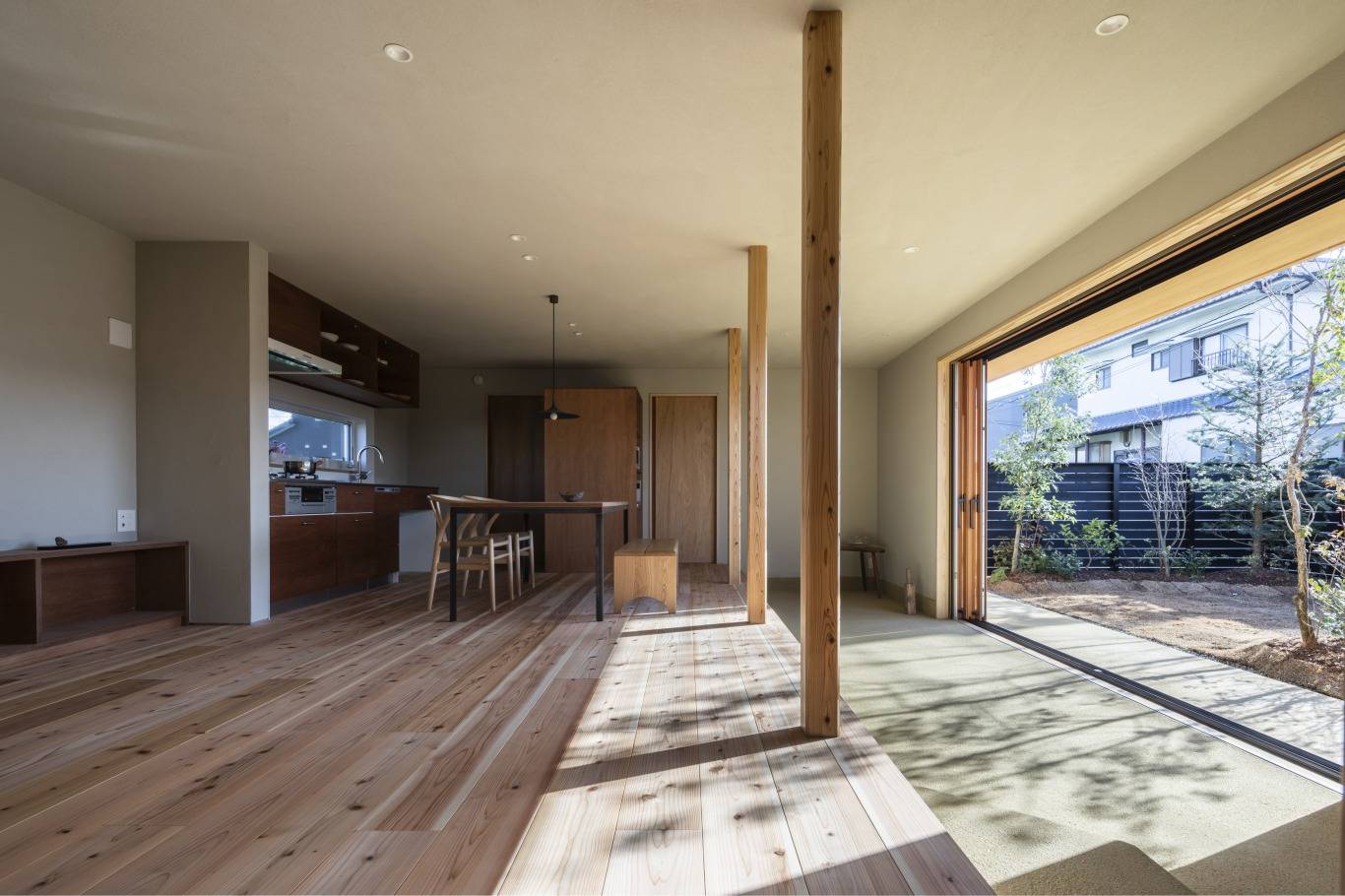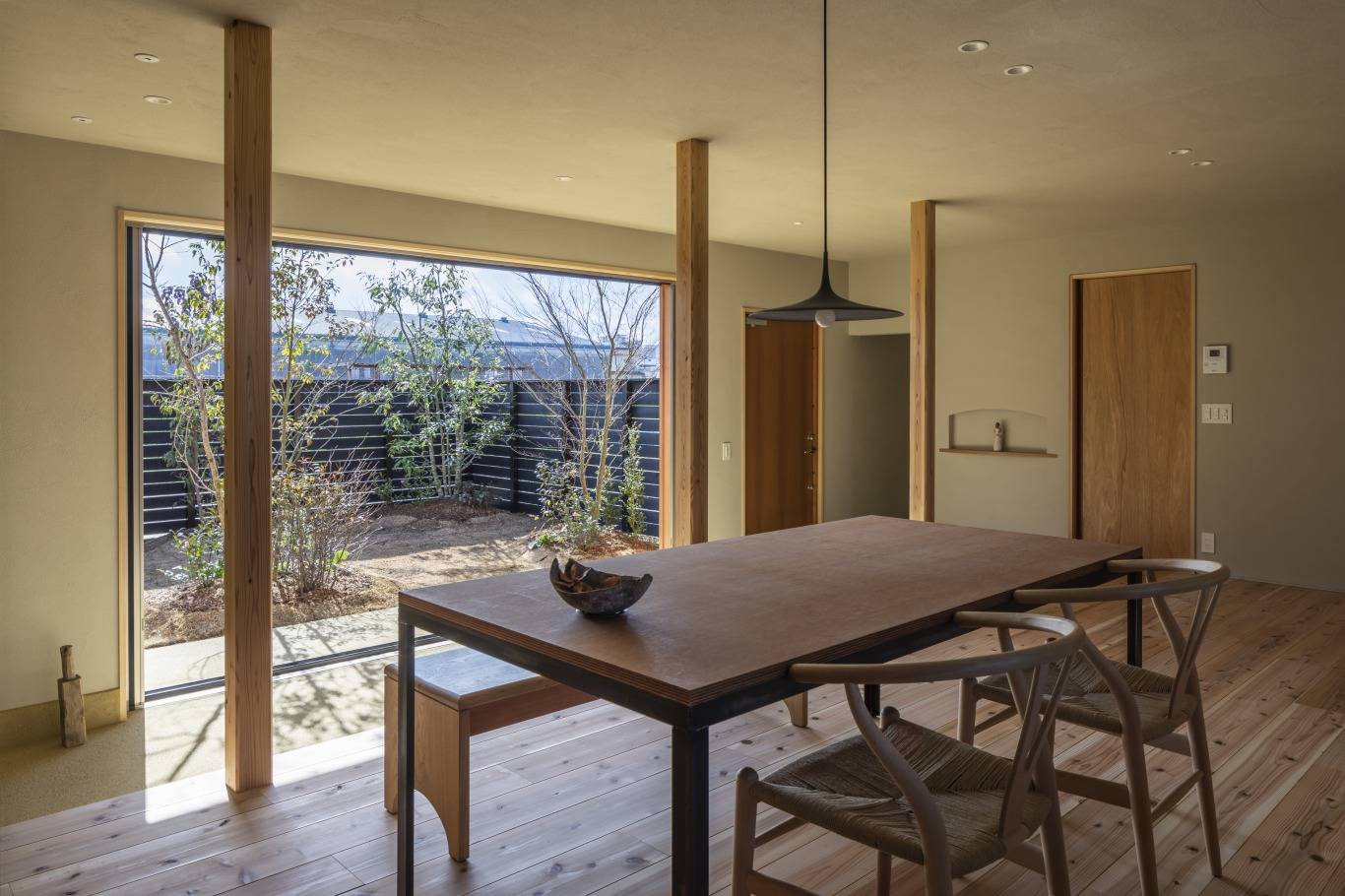 LDKの天井高さは2200mmと低めに抑えることで、水平方向の広がり、節有の杉材の柔らかな質感、土間・庭への連続感に意識が働くようにした。また、土間からの反射光を柔らかく受け止める背景として、壁・天井は糊土の自然な白色(白過ぎない白)で仕上げた。