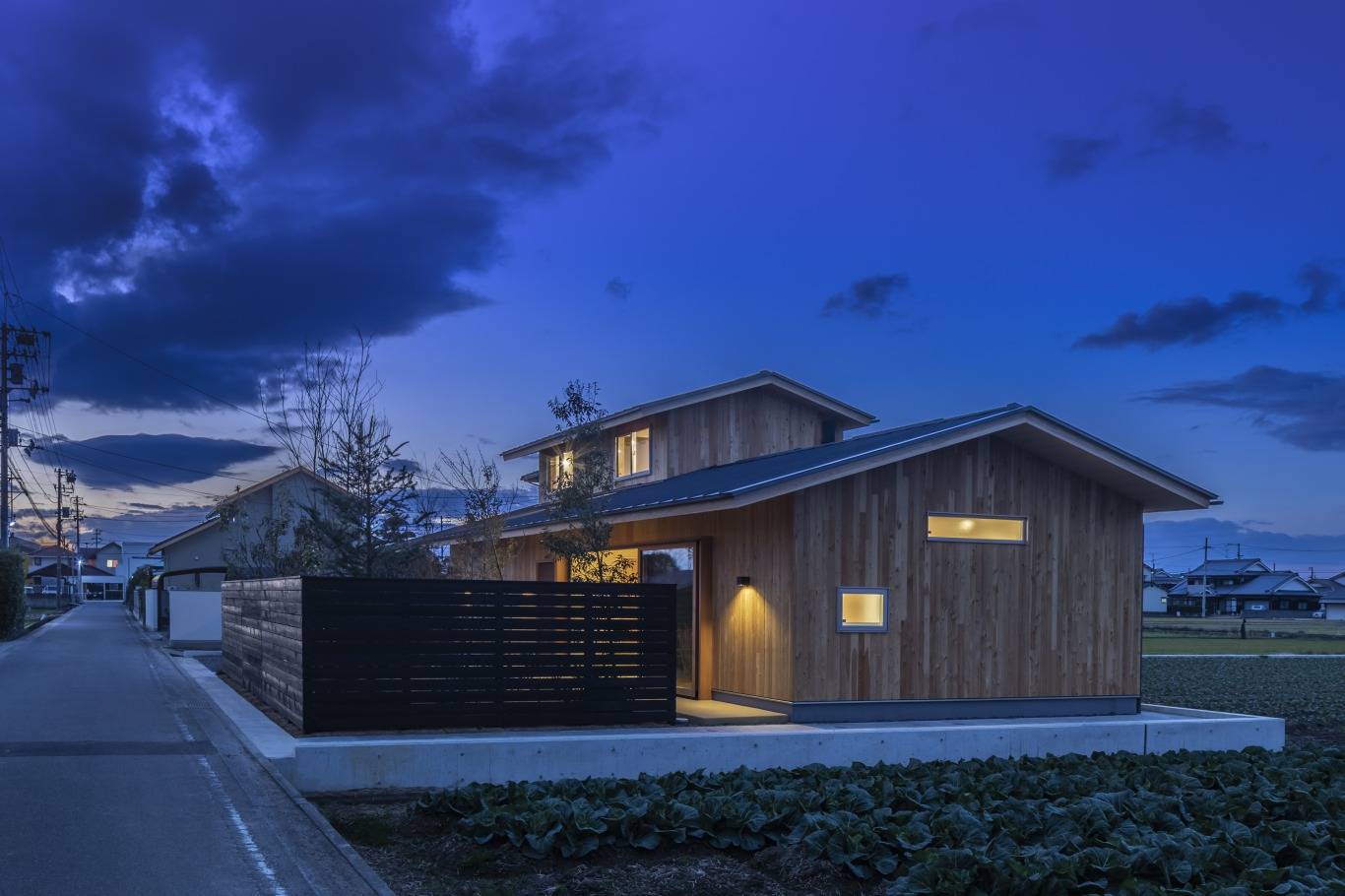 大らかな土間を持つ、ほぼ平屋のような佇まいの農家住宅。敷地の周囲は建主一家の田畑が点在する。軒が深く控えめな佇まいとLDK・土間・庭・畑が地続きに連続するような家を求められた。