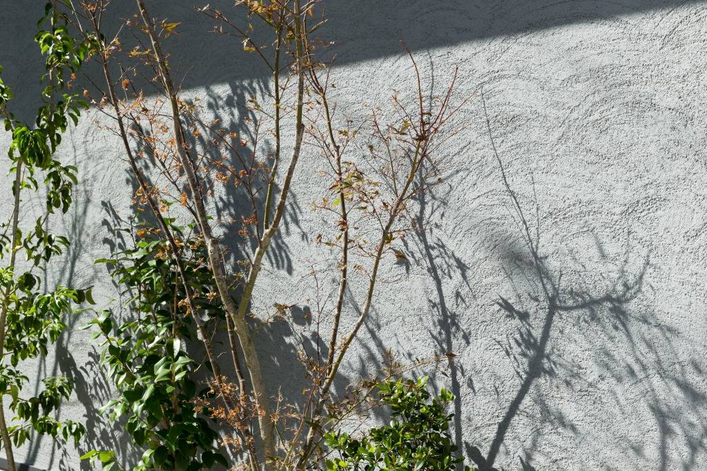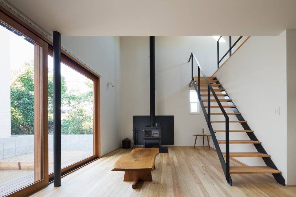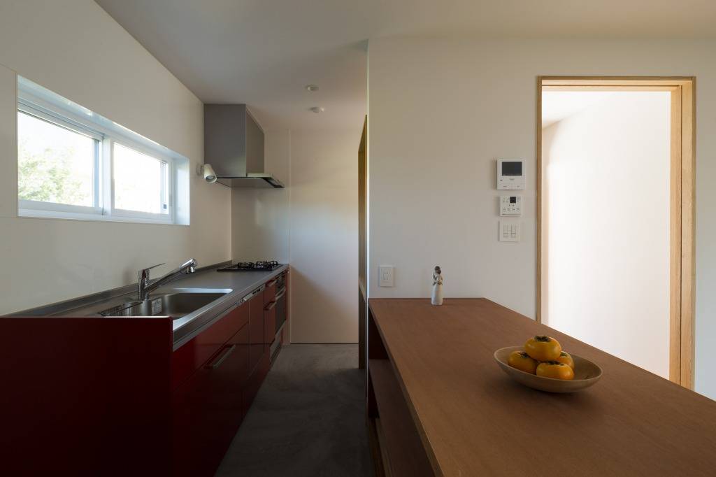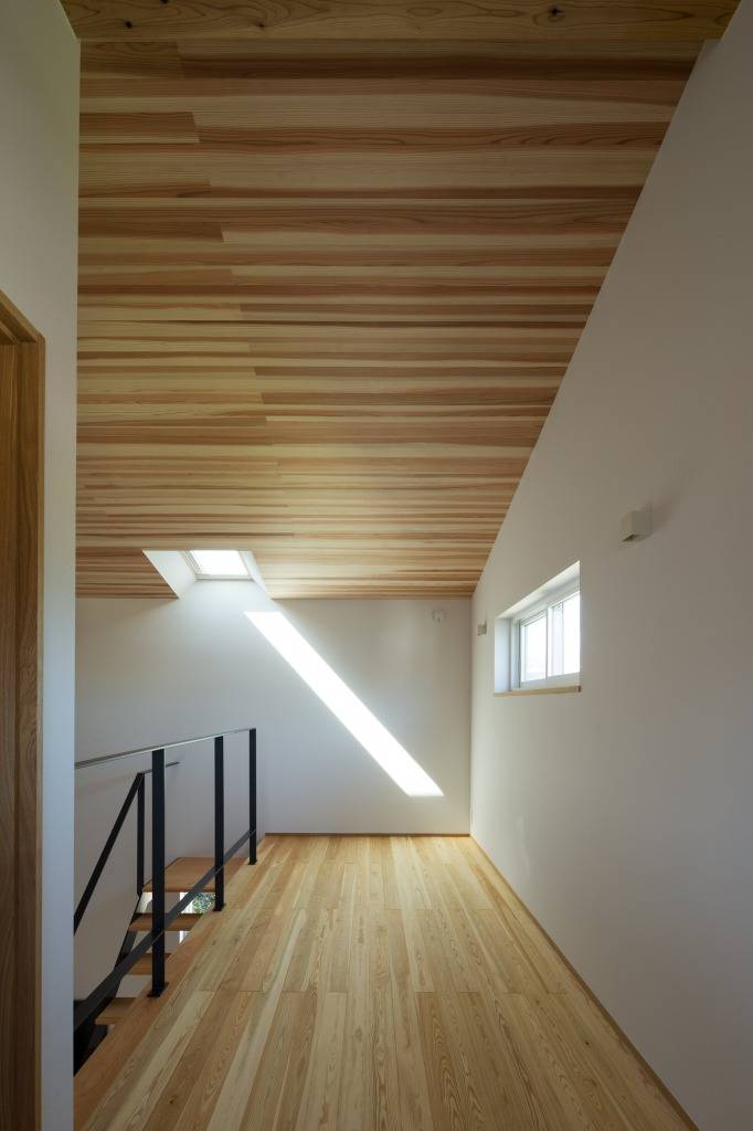 新興分譲地の一番奥まった場所に位置するコンパクトな敷地である。このコンパクトな敷地ながらも、あえて敷地いっぱいに建物を建てず、南側にプライベートな空地を取ることで採光・通風を確保し、外部空間との繋がりを求めた。また、道路に対しては平屋のボリュームで低く構え、玄関先に深い軒下に配置することで、小さな敷地の中でも豊かなアプローチとなるよう計画した。