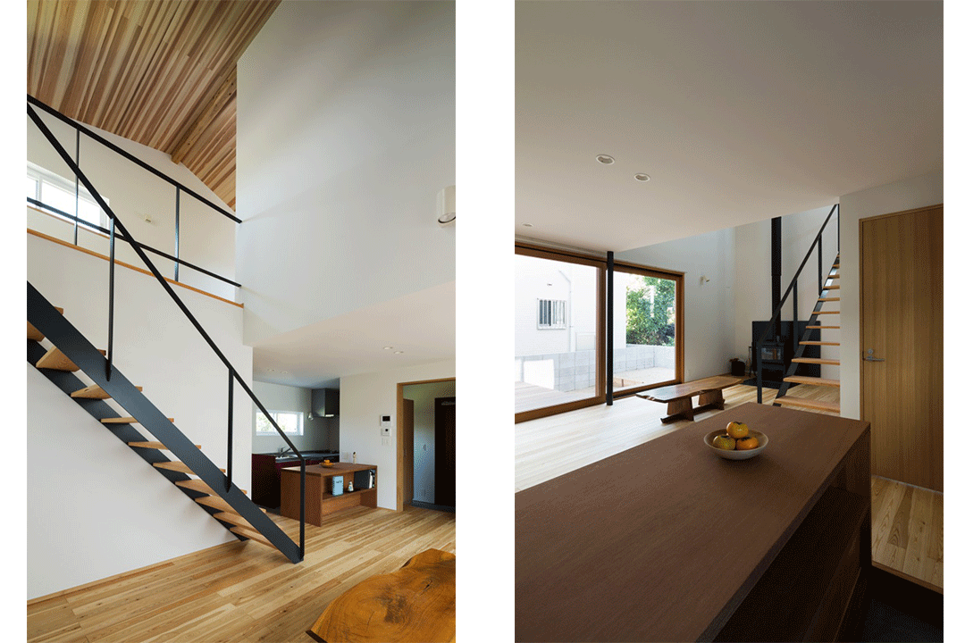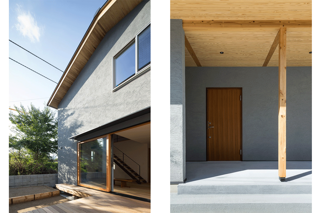 外観も室内も趣味嗜好や主張の強いデザインではなく、人の暮らしに馴染む控えめな佇まいを目指している。吹抜けによる上下の繋がり、リビングからひと続きに広がるデッキ、玄関先の広い軒下空間や2階のフリースペースといった「余白」を取り入れ、数値が示す面積以上に「空間の豊かさ」に重きを置いた。