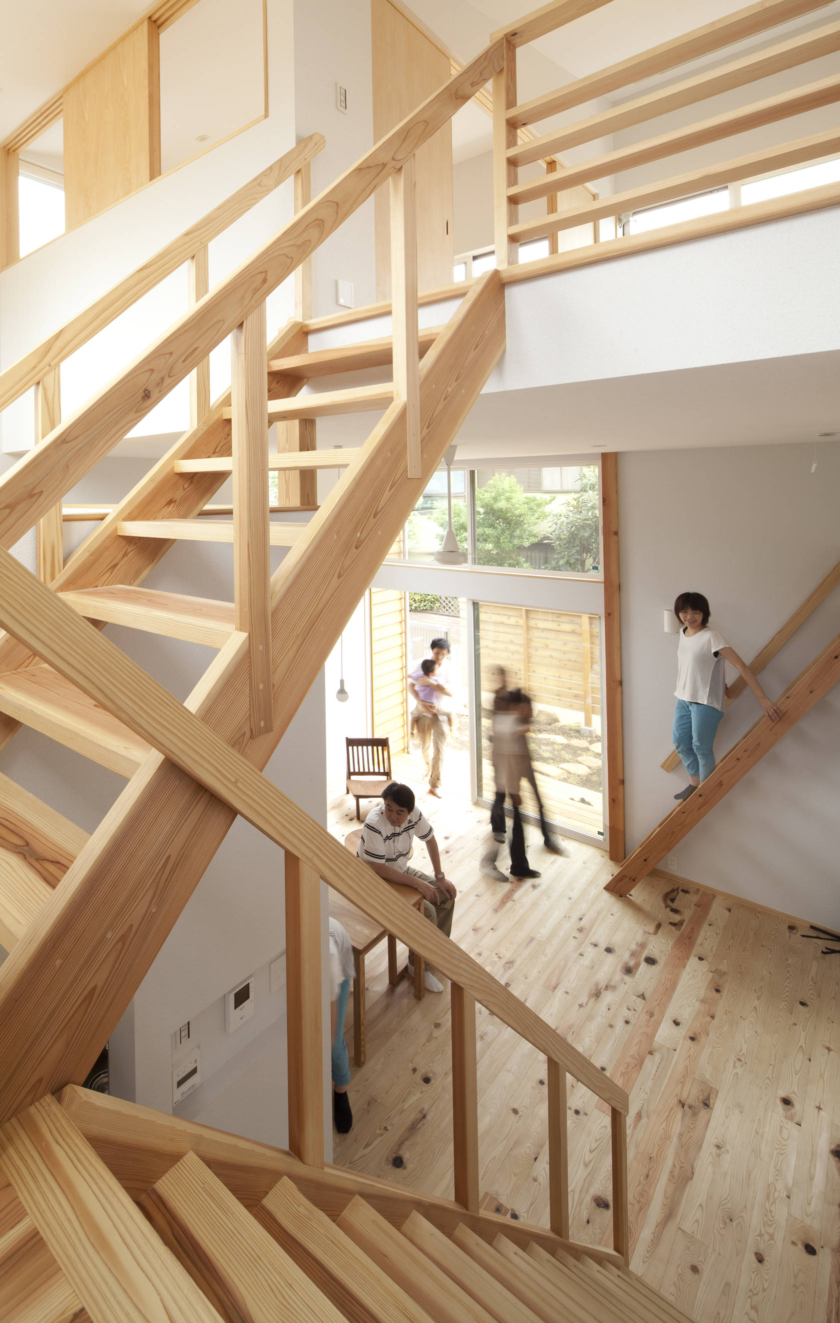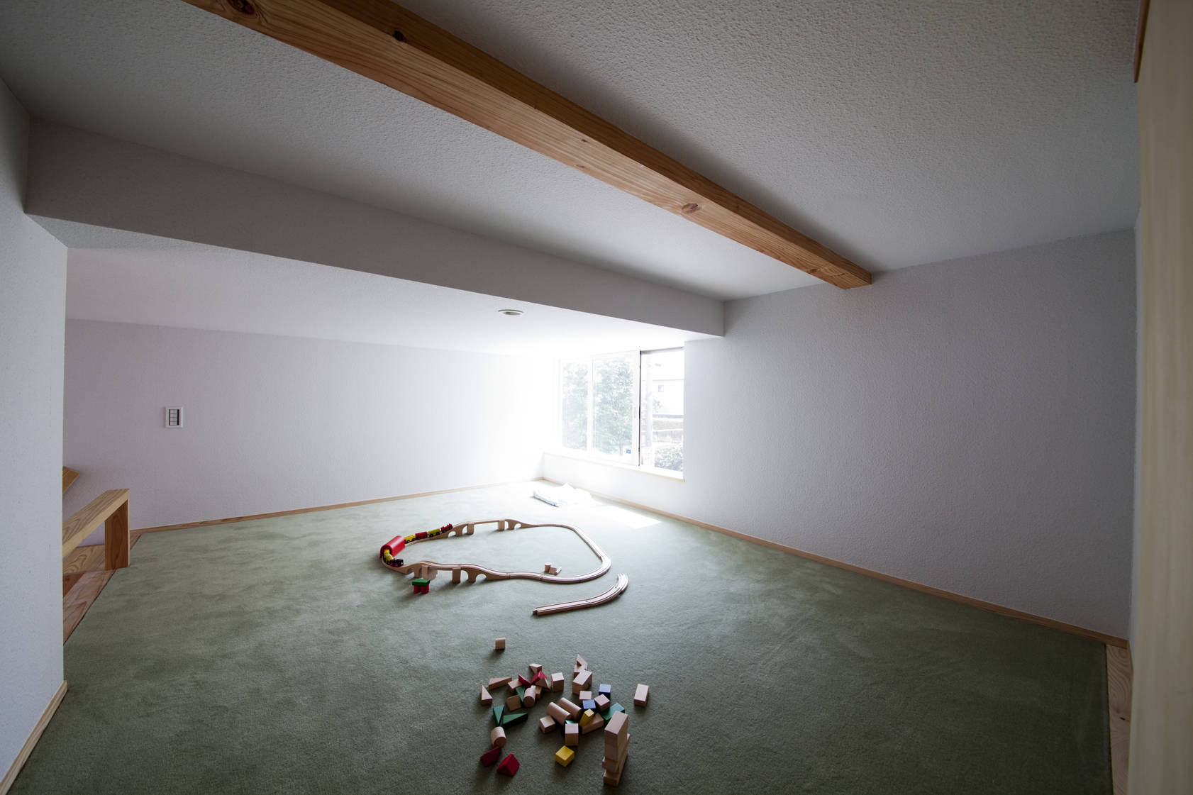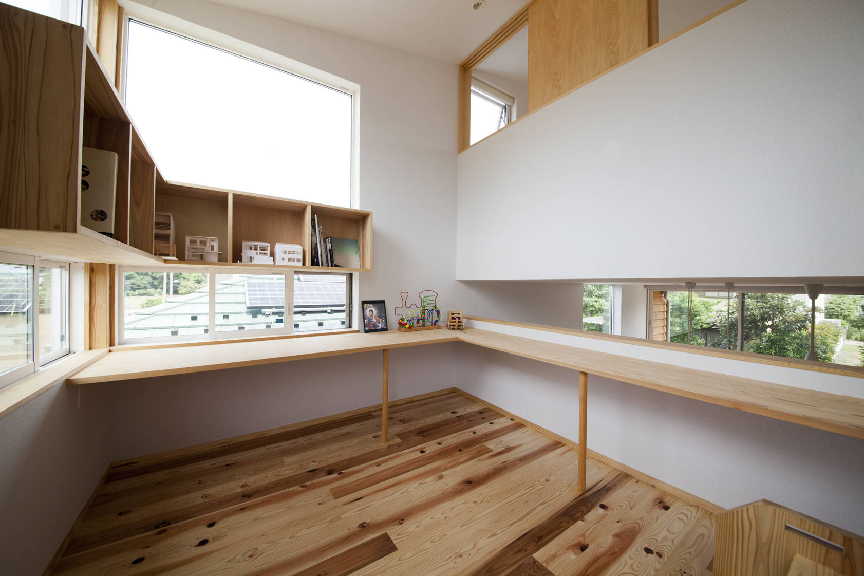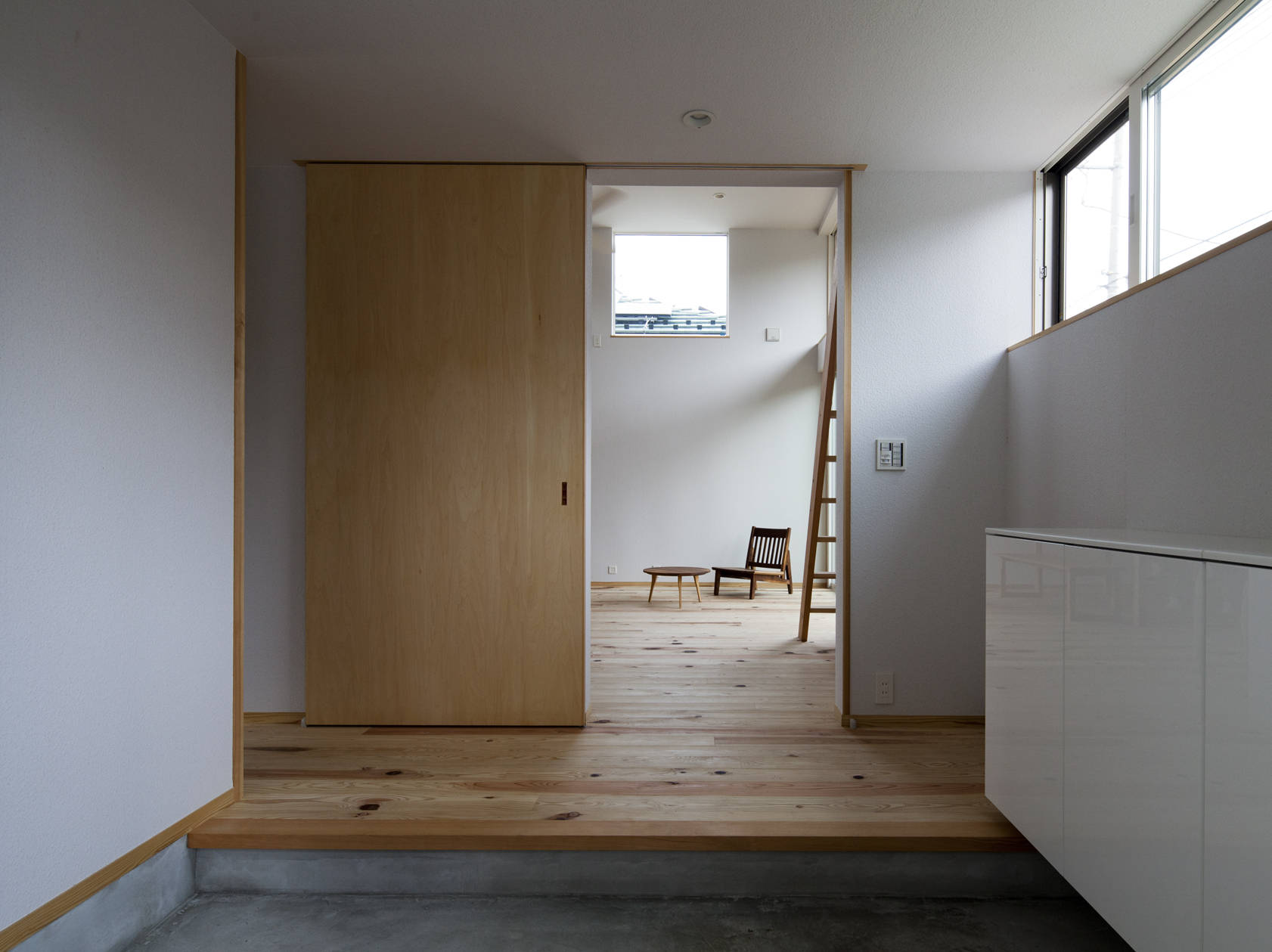 広さへの解決策として、1階と2階の間に中間層を設けてスキップフロアとし、床面積を補うことにした。また、空間構成を工夫した。庭に面するリビング・ダイニングをスキップ層を含んだ天井の高いメインボリュームに設定し、階段・キッチン・玄関・ワークルーム・ロフトといった天井の低いサブボリュームを可能な限りオープンにして接続させる。軸組と壁位置には丁寧な検討が必要となったが、この仕掛けにより、平面的・立体的にひとつながりの空間ができると同時に、光と風が抜けるパッシブな快適さも併せ持つ家となった。県産材の西川杉の活用を構造だけにとどめず、あらゆる仕上材として十分に活用することで、空間が小分けにされず、広がりを保ちながら統一感を持たせることができた。