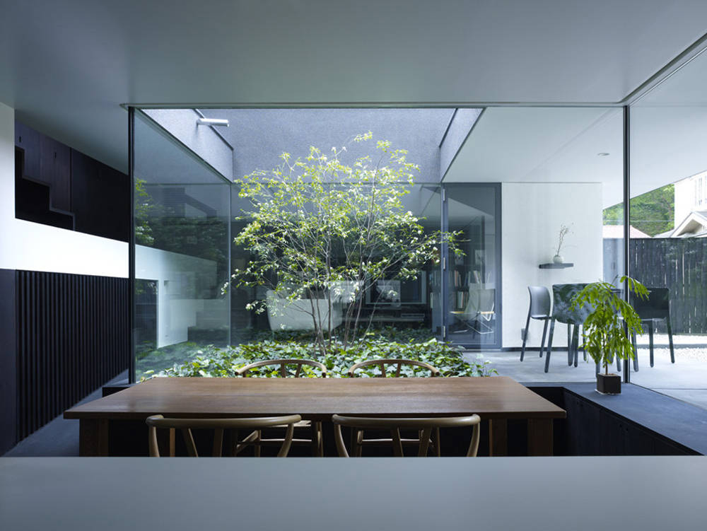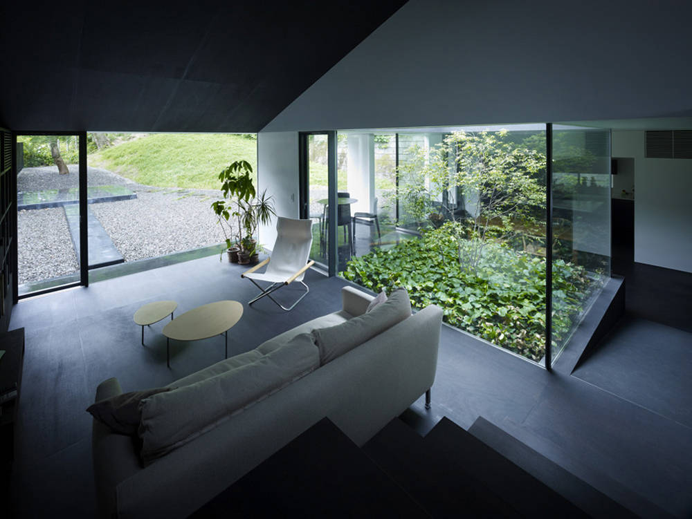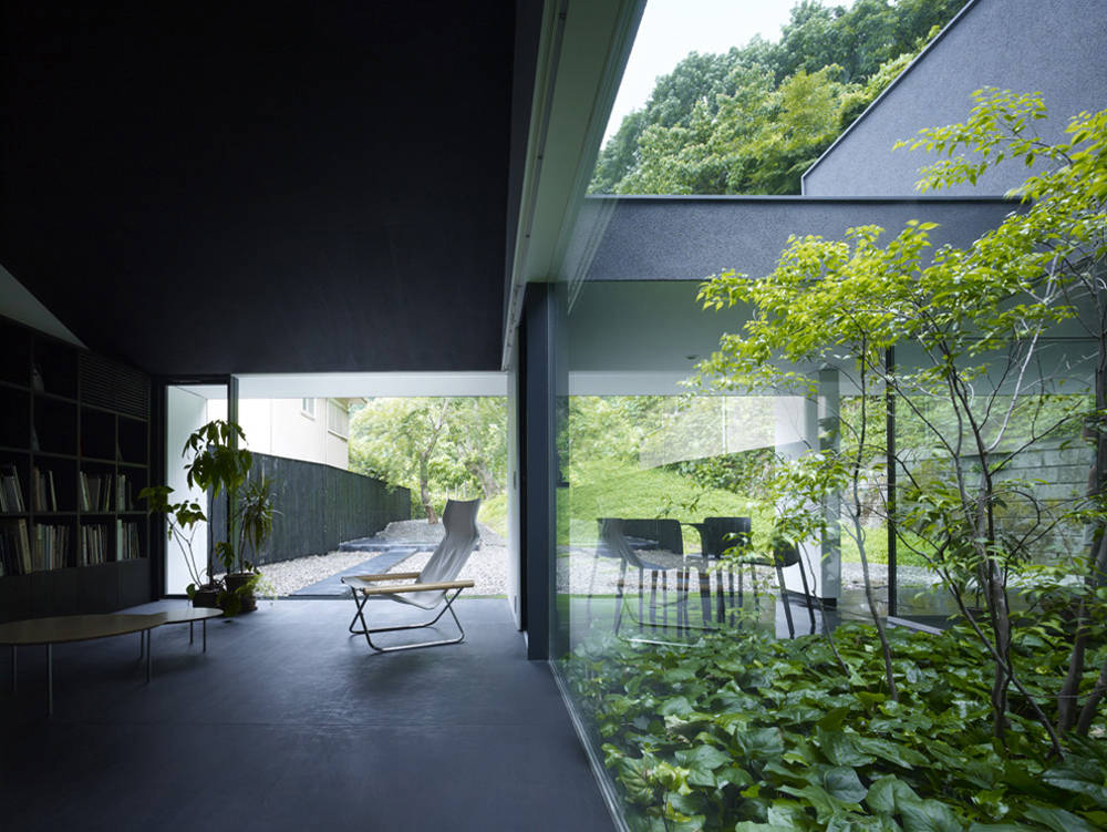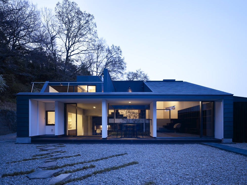 周囲の豊かな自然と完全に囲まれた安心できる内部との間に、いくつもの異なる空間の質をもつレイヤーを設定し、それらがゆるやかにつながっているような状態をつくりたいと考えた。山から連続するように庭に貫入した丘、モミジの木の下のテラス、リビングとダイニングの間の中庭、テラスに飛び出したバスルームなどがそのレイヤーを逸脱することによって領域の境界はあいまいになり、混沌とした状態が生まれている。