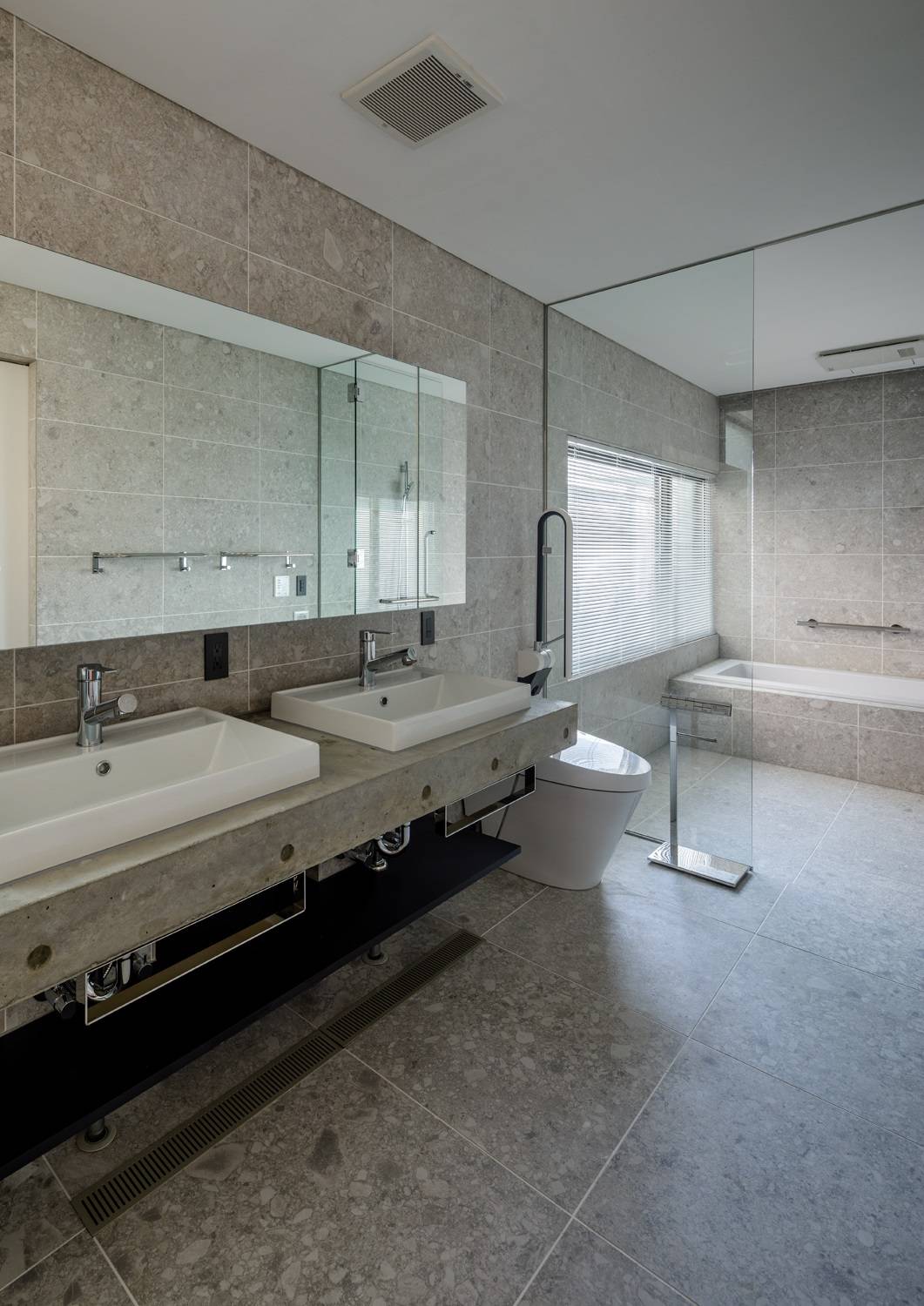床暖房は床下エアコンを利用したアクアレイヤーを全床面に採用。1階RC壁は道路側の杉板RC壁以外は外断熱80mmの硬質ウレタンパネルを纏い、厳しい冬の寒さから解放される空間になっている。