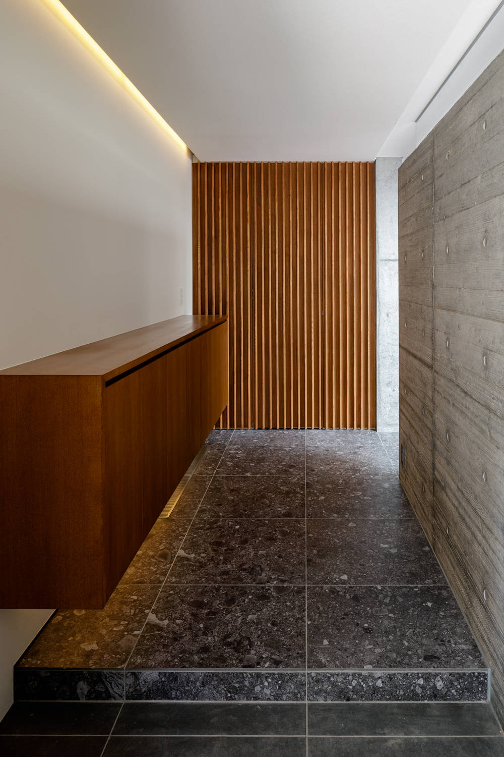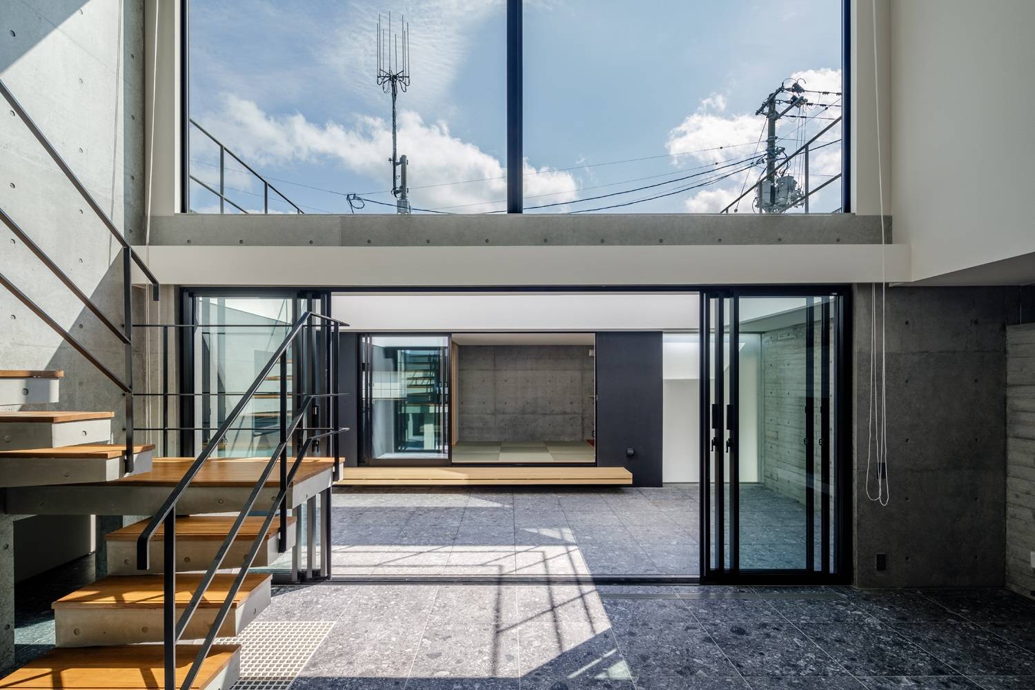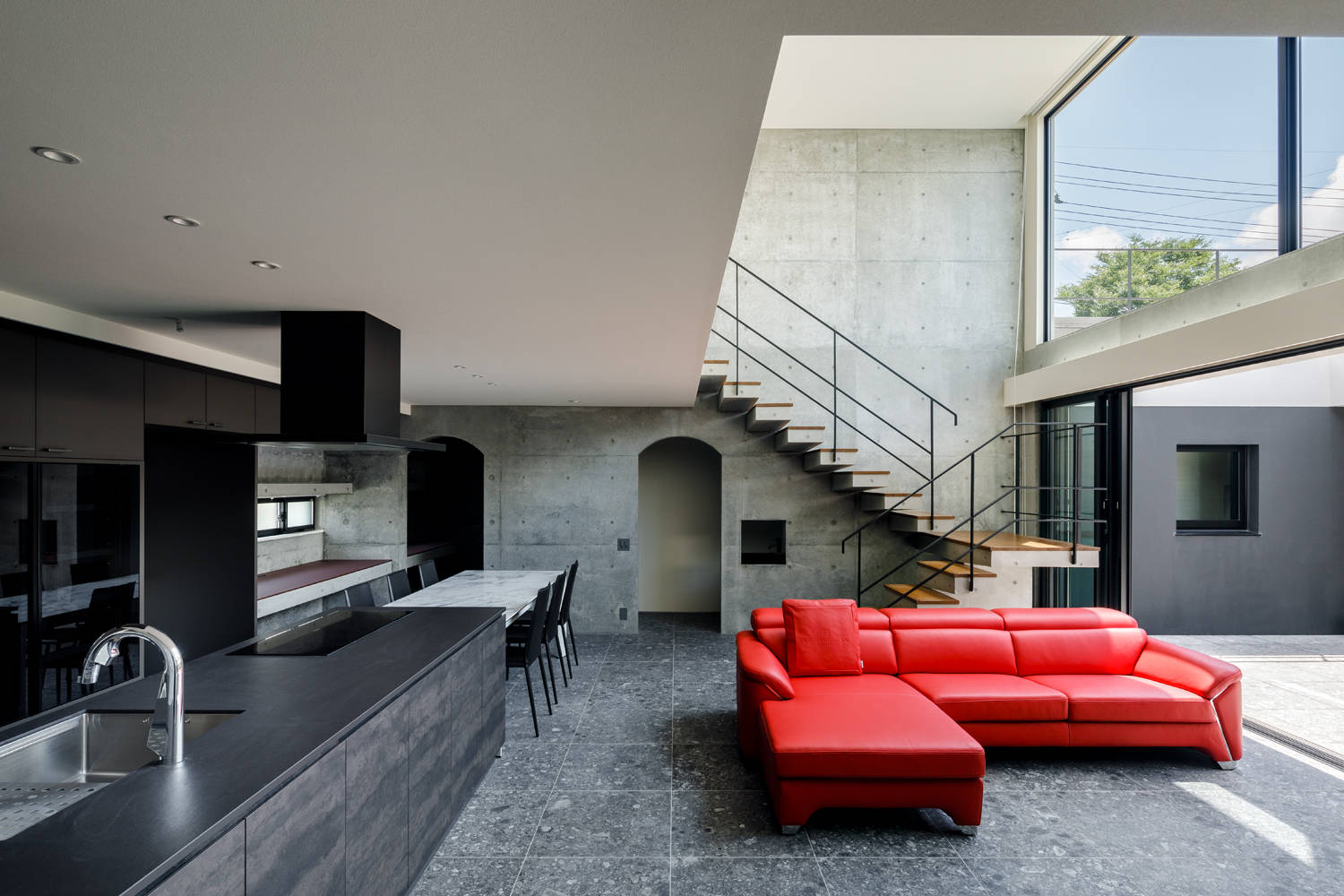 南側に通る幅員3Mの遊歩道から独立した中庭を囲むように配置した間取り。将来的に隠れ家としてカフェを営みたいお母様のご要望からエントランス玄関前に直接中庭へ入れる入り口を設けた。堅牢な杉板型枠のRC壁は2階バルコニーの手摺壁まで伸びる。
