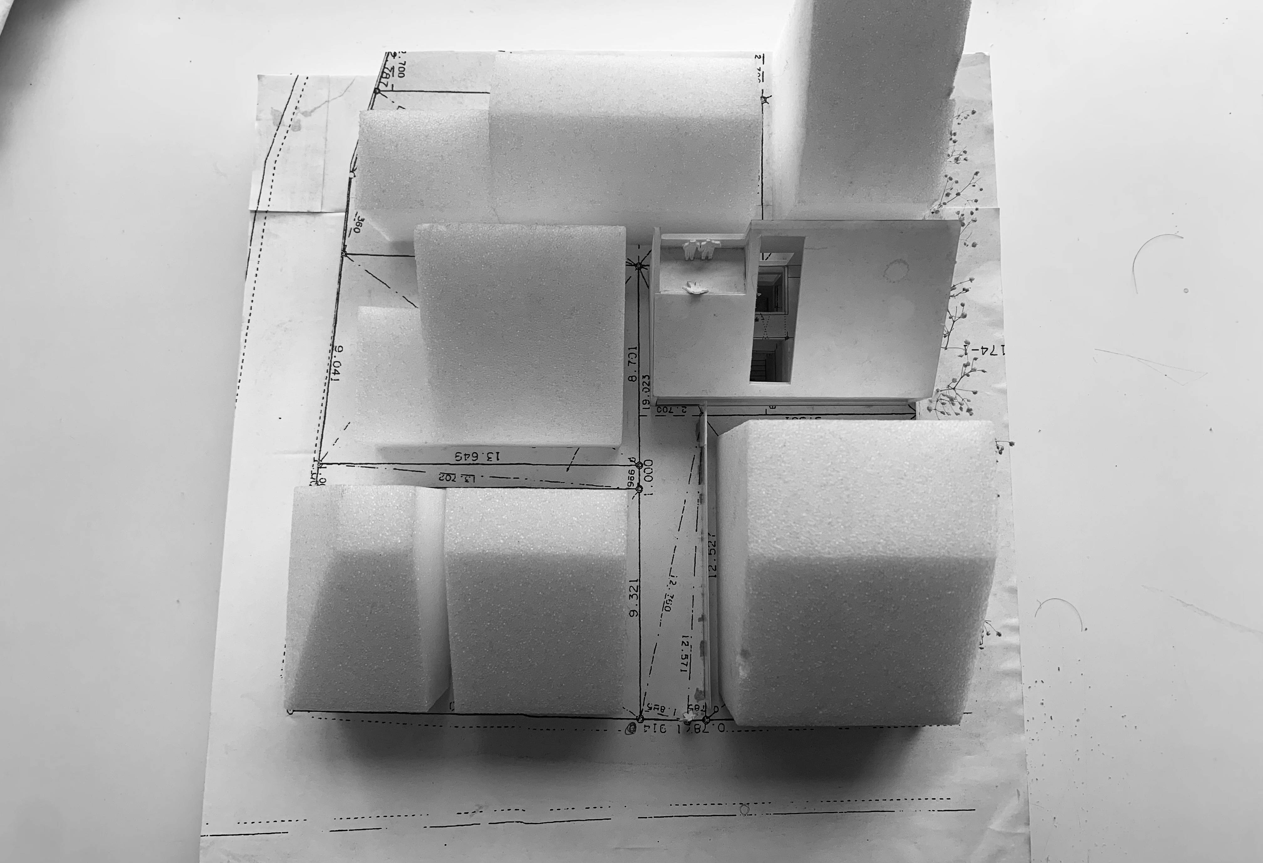 この計画は、東京の典型的な住宅街にある旗竿敷地を手に入れた施主からの相談を受けて始まった。