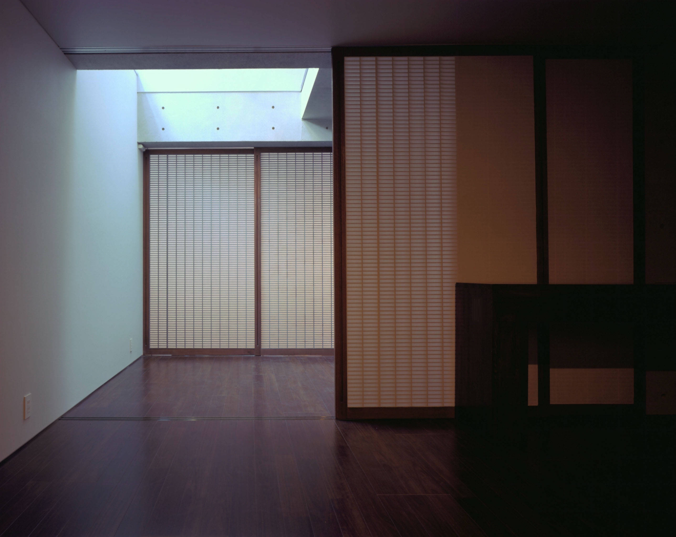 敷地状況は、接道路地沿いにも隣家が迫り、唯一敷地奥に隣接する寺院の境内に向かってのみ開けていたことから、居住空間として快適な空間を実現する為の採光と通気の確保が大きな課題となった。
