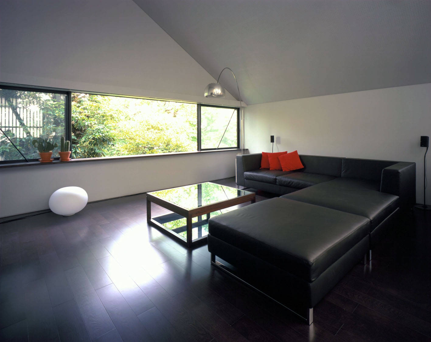 唯一開けている隣接寺院の境内に向けて間口一杯の水平窓をとることで、この住宅の為にデザインした囲炉裏の様な重心の低いソファからは四季折々の樹木の移ろいがワイドスクリーンのように展開し生活に潤いをもたらしている。