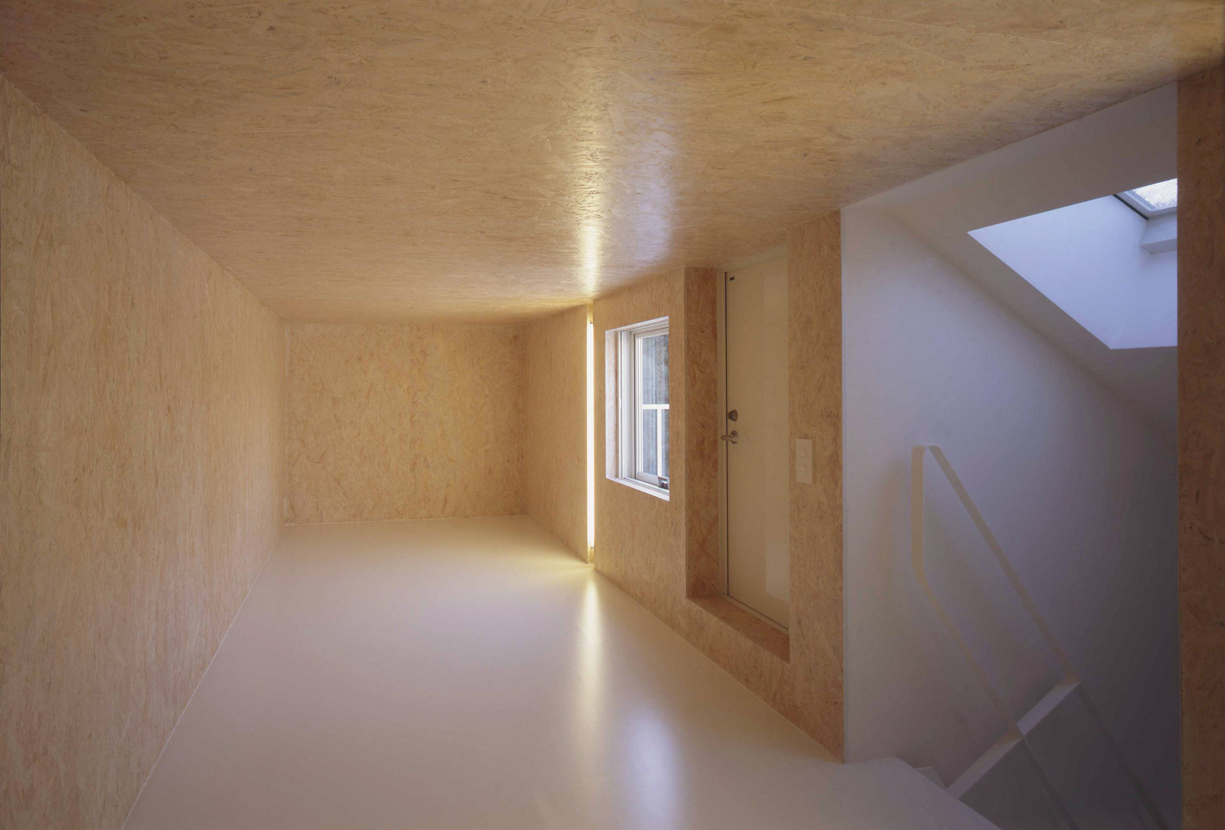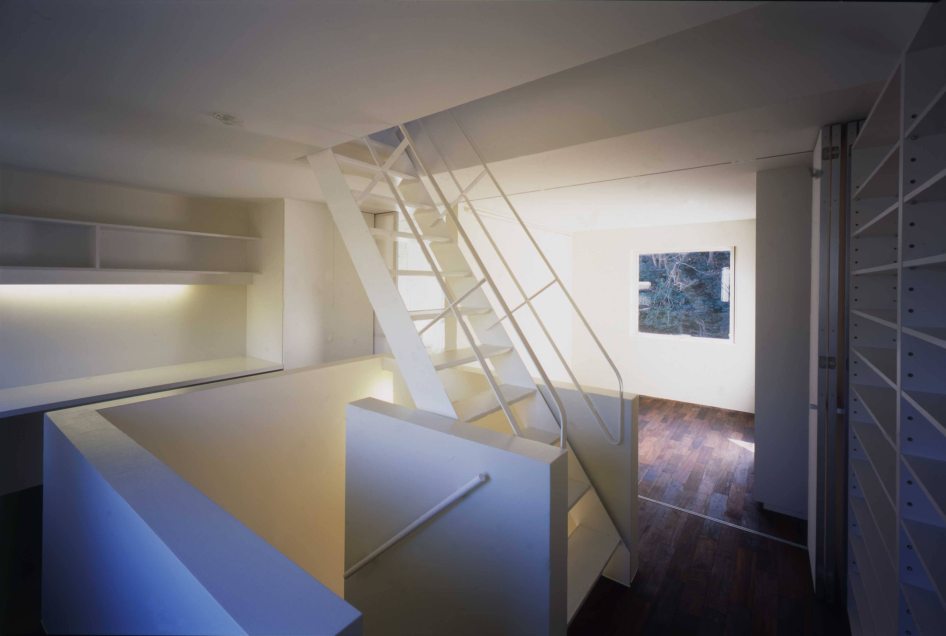 四角い建物の中央付近に階段を偏心させて設け、その階段を中心に空間がドーナッツ状に展開する様にしました。