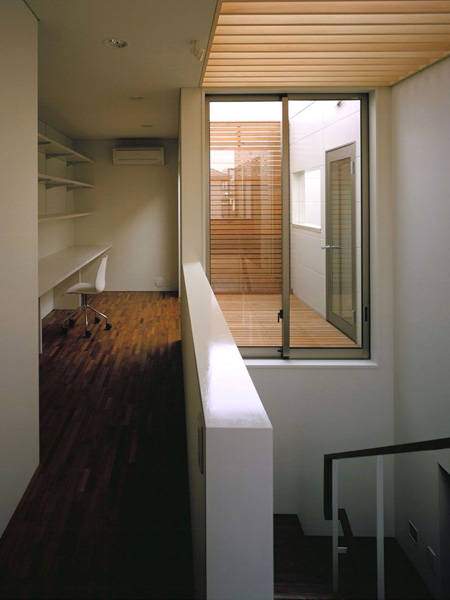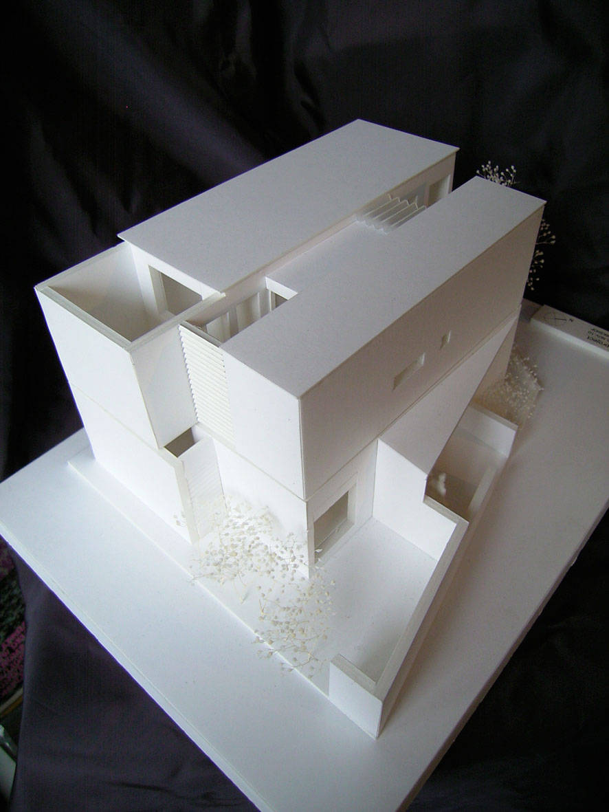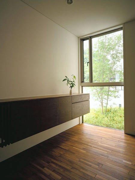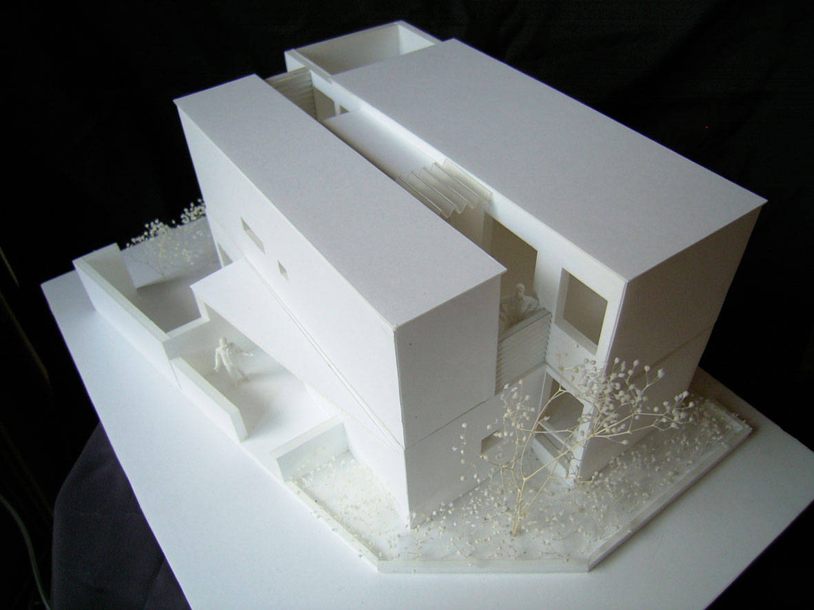 解決策として、南側マンションからの視線を遮りつつ充分な採光と通風を確保する為に建物の断面形状を凹形とし、その1,2階の3つのテラスに向かって各個室が開く様に計画しています。また、建物が街路に圧迫感を与えない様に小規模に分割し、交差点に面して「小さな緑地」を街路に開くことで見通しと安全性が高い魅力的な街路空間となる様に貢献しています。