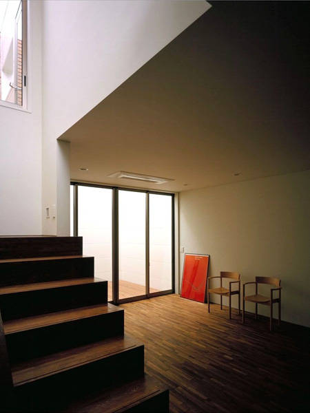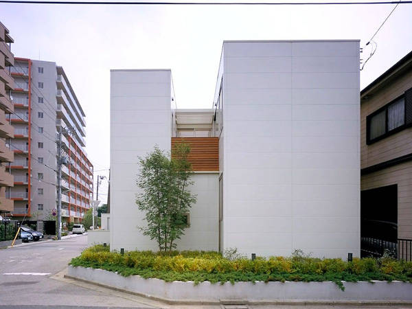 計画地は、郊外の住宅地の角地という一見恵まれた計画地でしたが前面道路の向かいには全住戸が計画地を見下ろす10階建てマンションが建っていました。その為、南側マンションからの視線を遮り、施主が飼う小型犬が屋内外で伸び伸び過ごせることが計画の与件となりました。