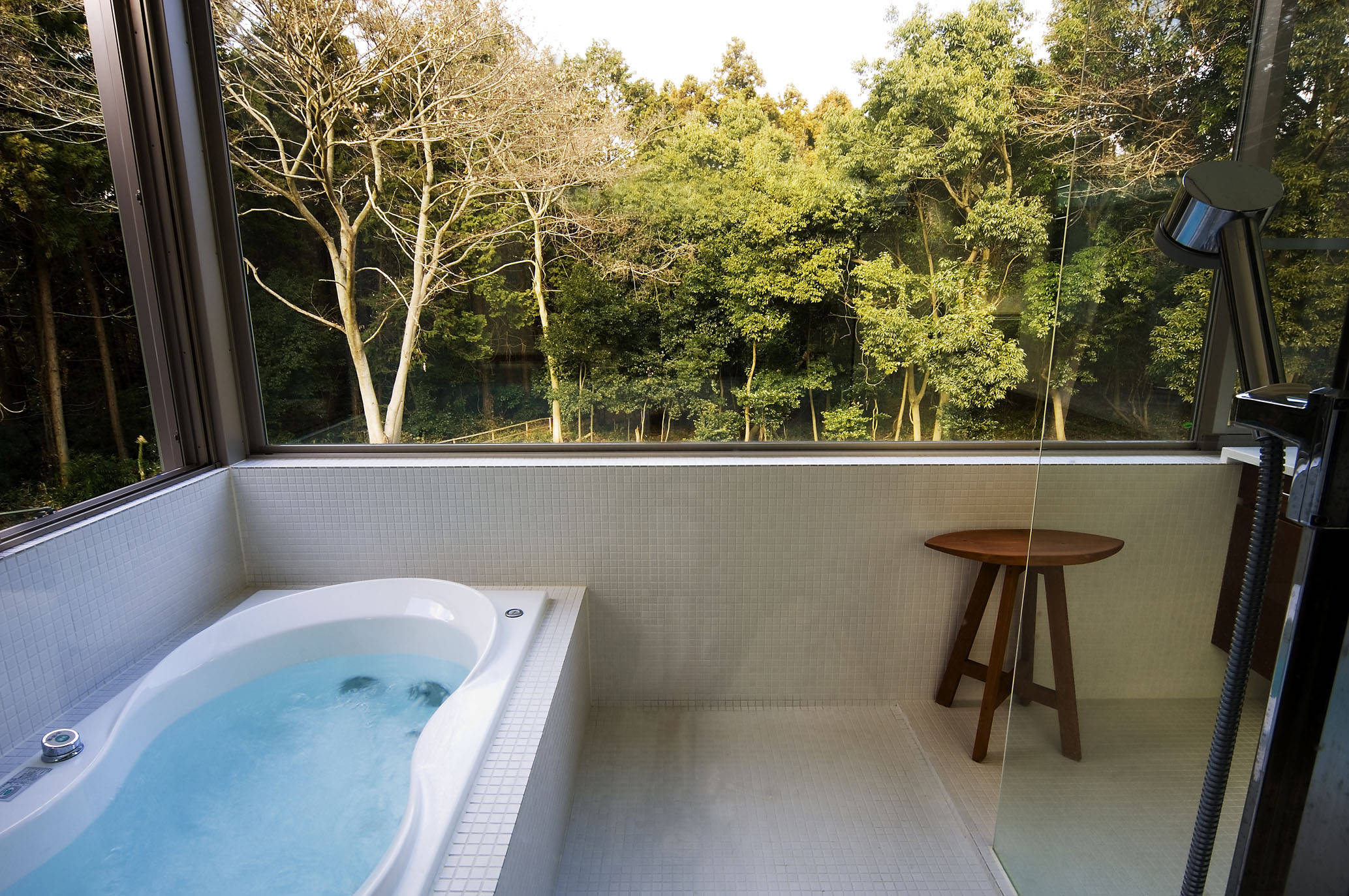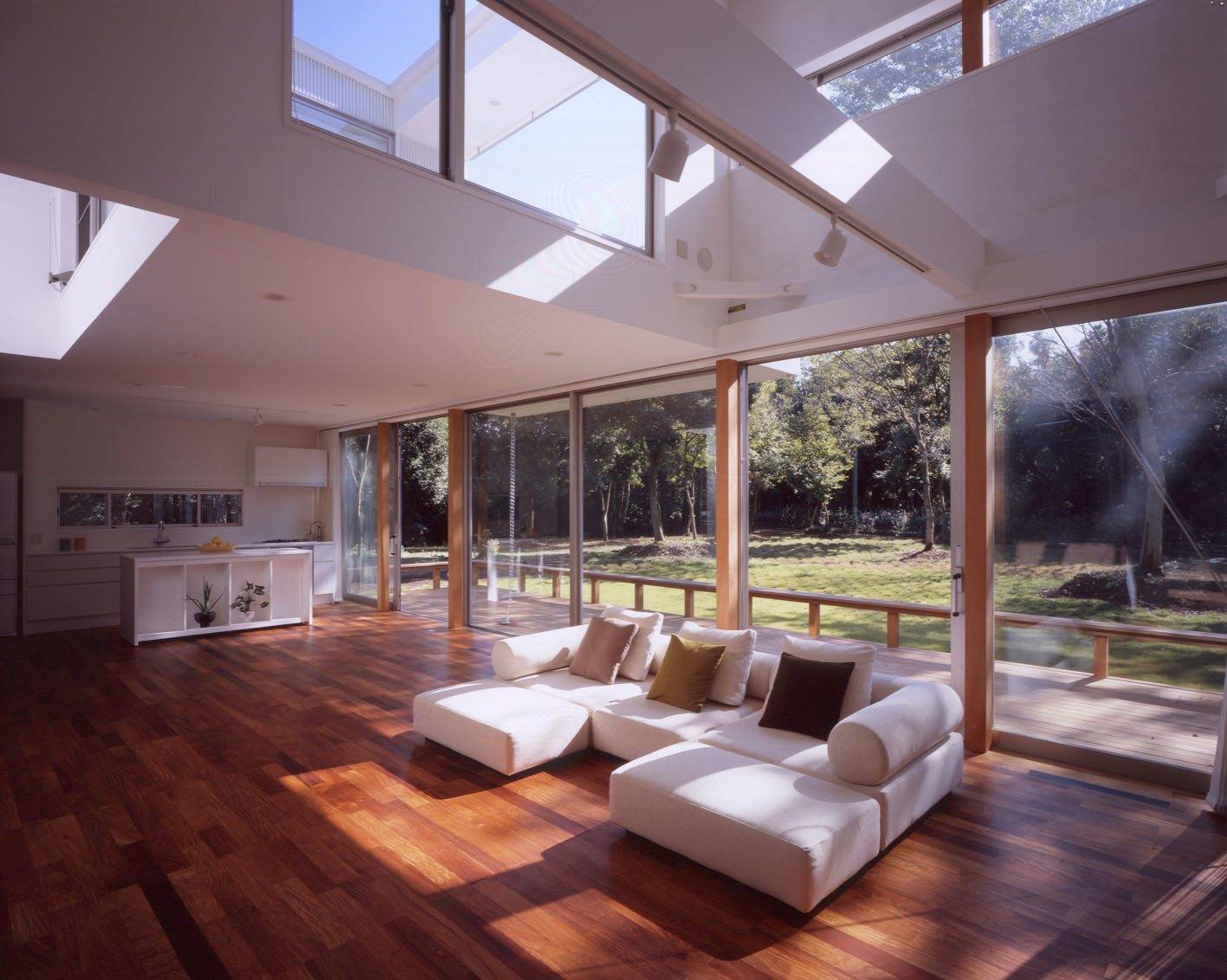 森へと続くデッキテラスとリビング。森と空を一望するバスルーム。空を切りとるルーフテラス、、、。生活の様々なシーンの背景として森と空がある。