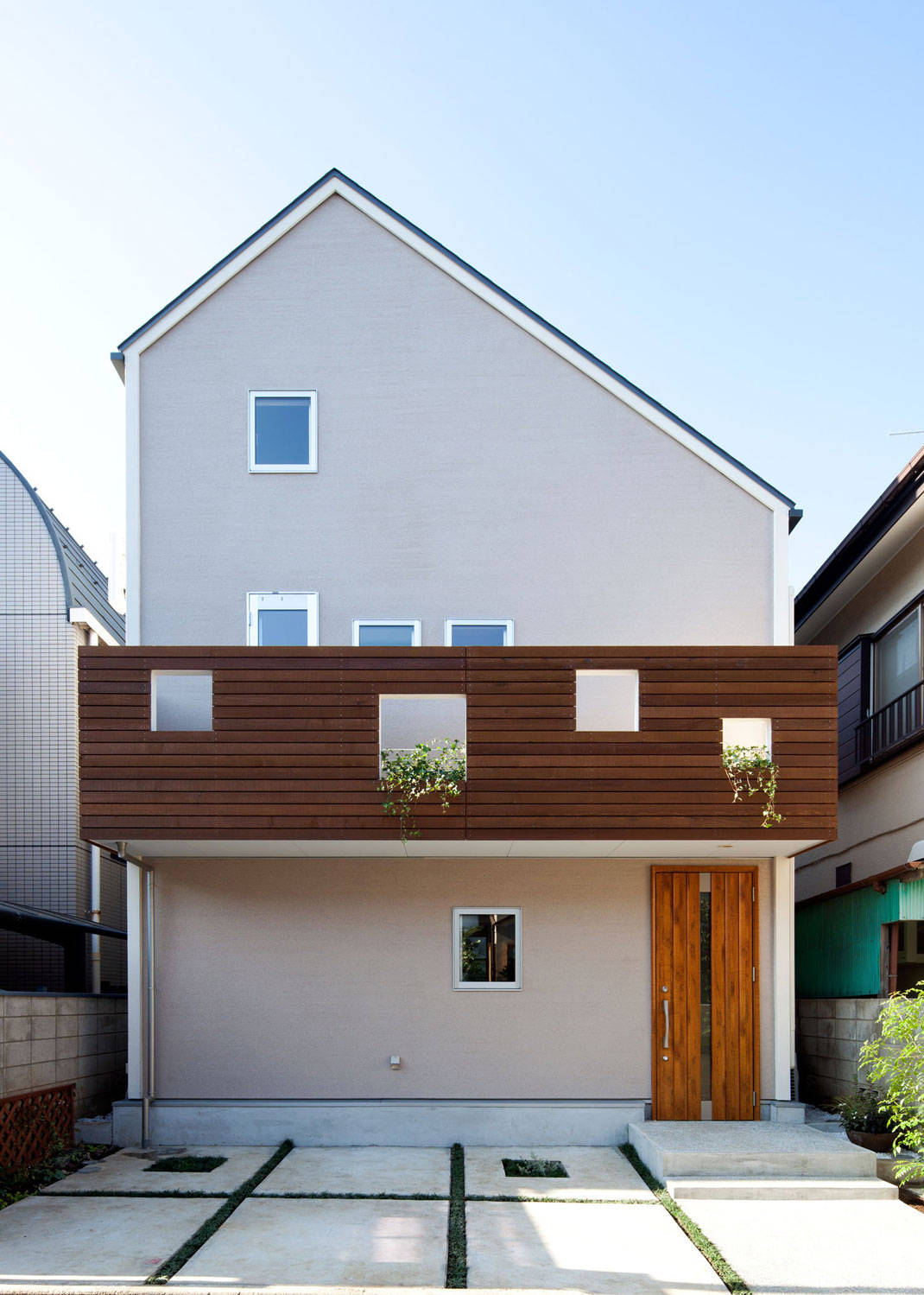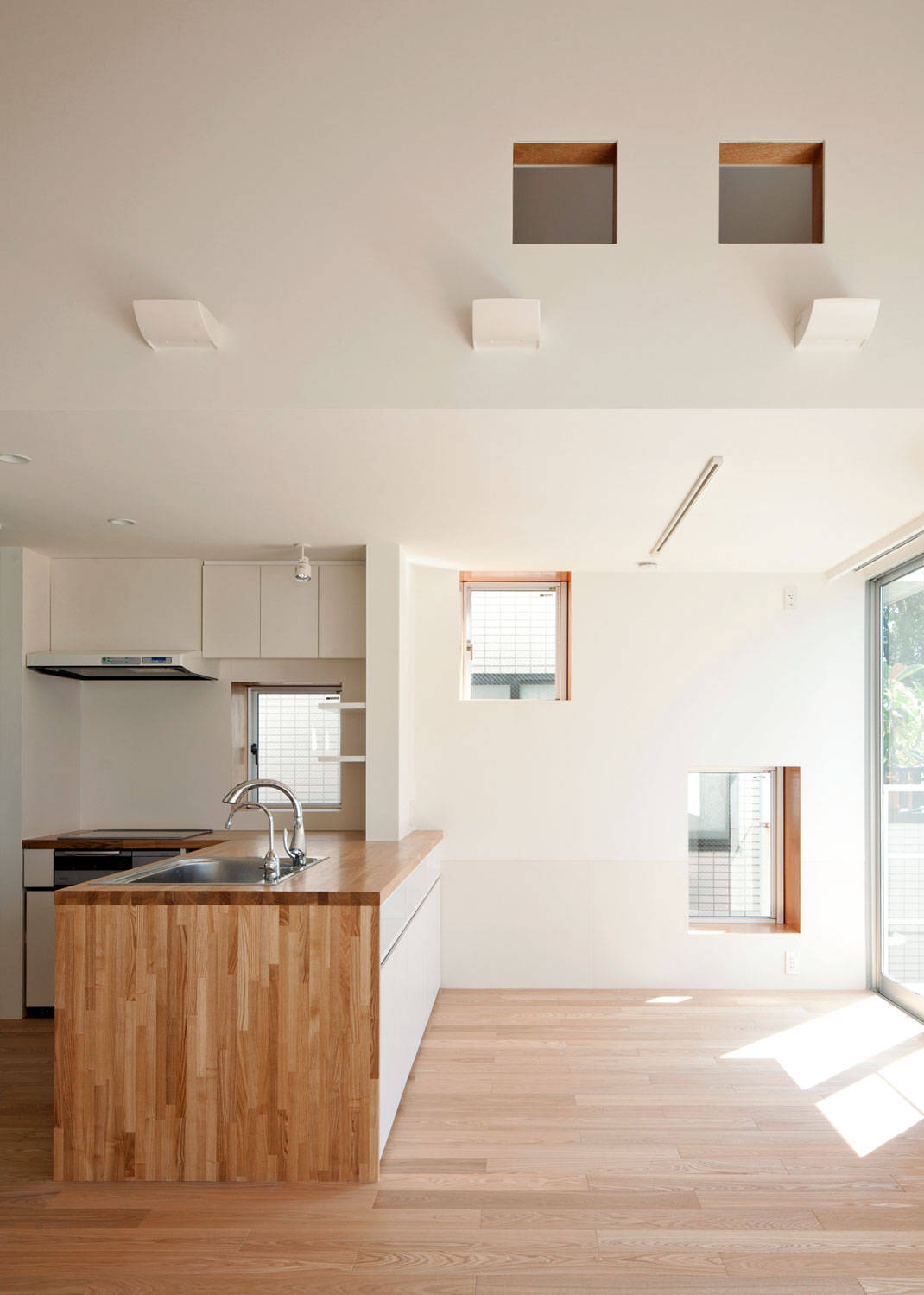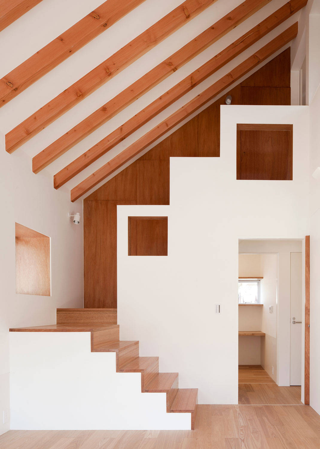 夫婦と母、猫3匹が住まう、狭小地に建つ住宅。世代交代による建替えは、庭と木を残すことでかつて育った家の記憶をつないでいます。赤味のあるラワン材を使った木のぬくもりのあるリビング空間は、出窓の奥行きで空間に広がりをもたせると同時に、猫の『居場所』に。階段や、穴のあいた壁なども猫の遊び場となります。また、各室を引戸により開閉することで、南北の抜け、風の通り道をつくり、自然の力による室内環境に配慮しています。