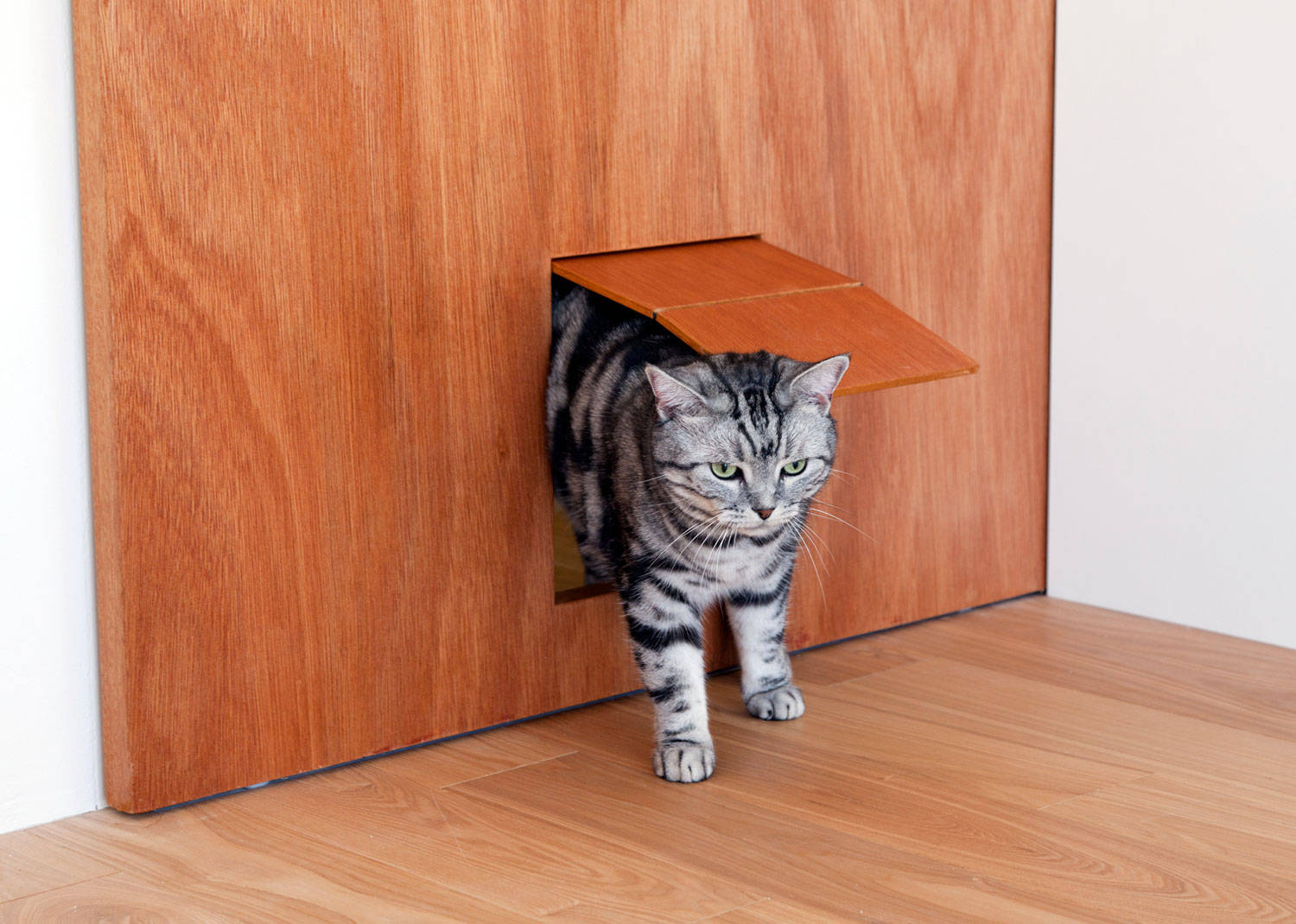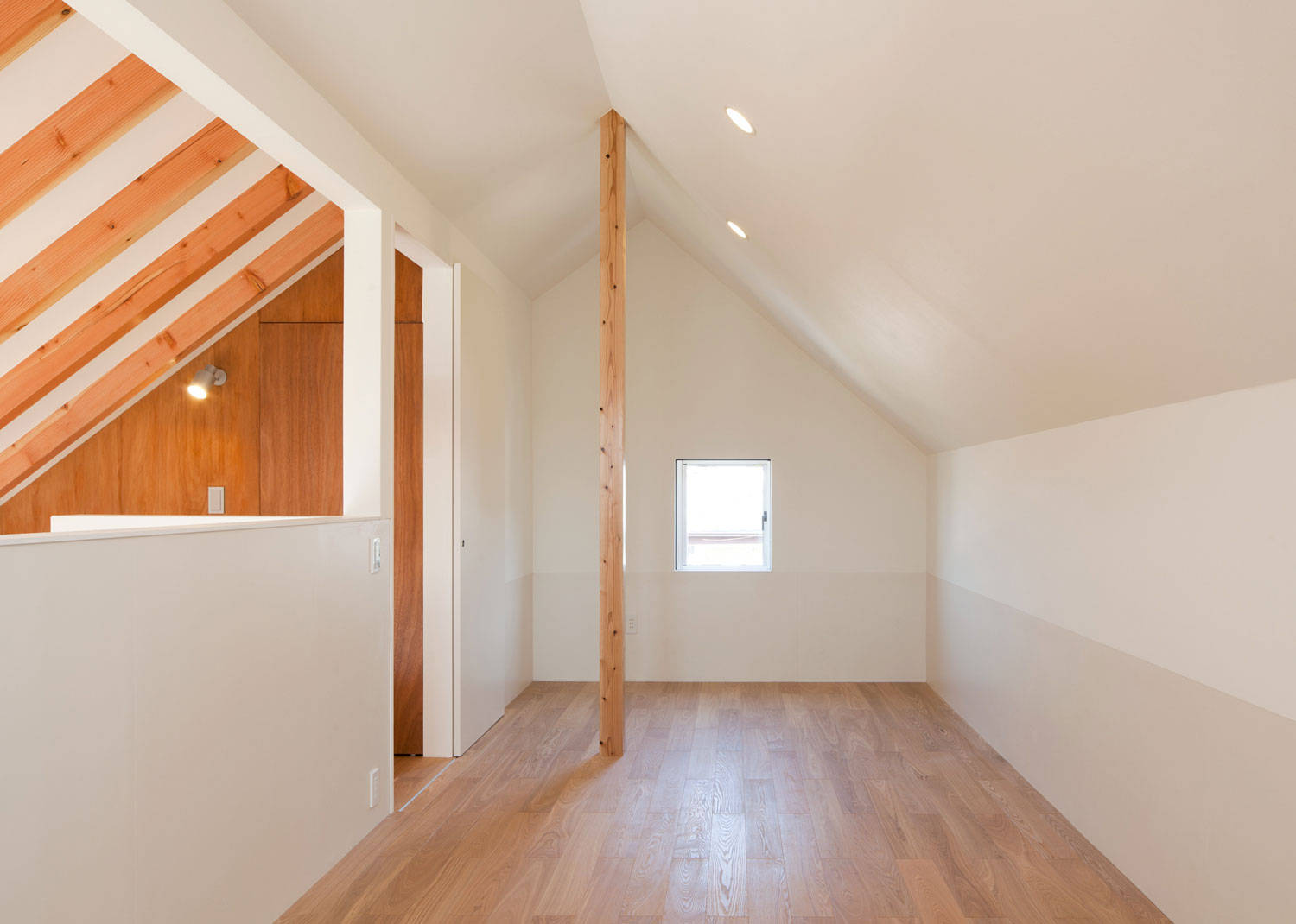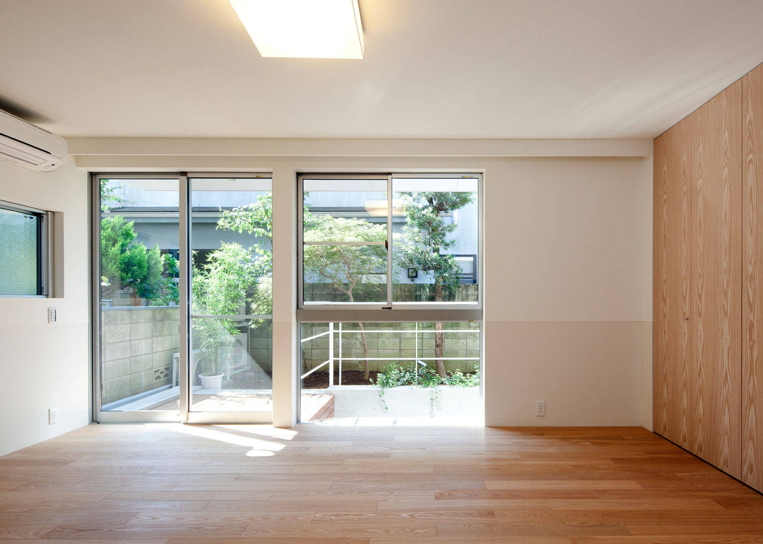 夫婦と母、猫3匹が住まう、狭小地に建つ住宅。世代交代による建替えは、庭と木を残すことでかつて育った家の記憶をつないでいます。赤味のあるラワン材を使った木のぬくもりのあるリビング空間は、出窓の奥行きで空間に広がりをもたせると同時に、猫の『居場所』に。階段や、穴のあいた壁なども猫の遊び場となります。また、各室を引戸により開閉することで、南北の抜け、風の通り道をつくり、自然の力による室内環境に配慮しています。