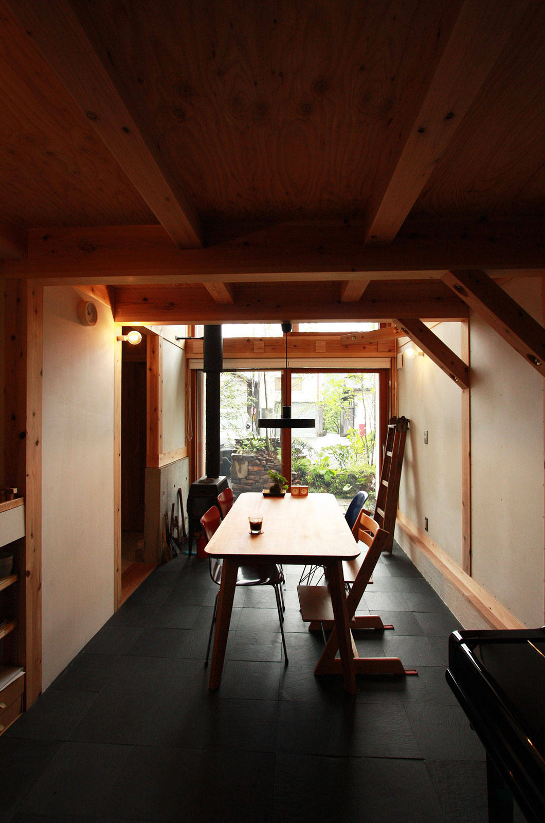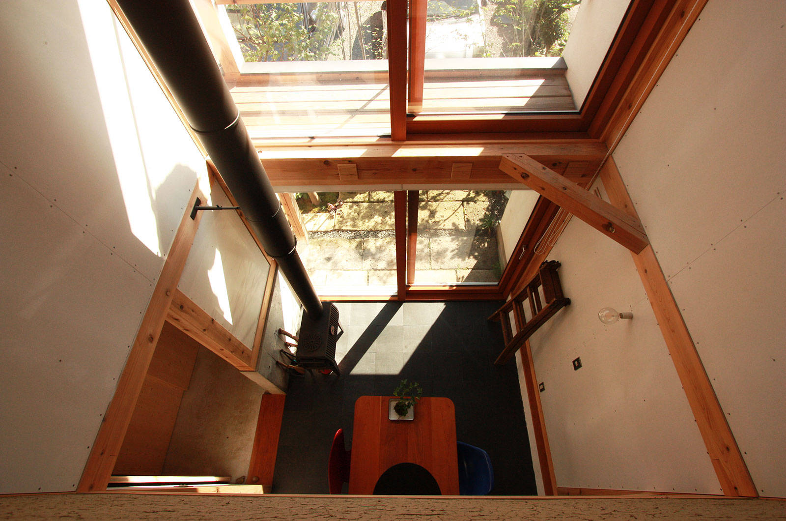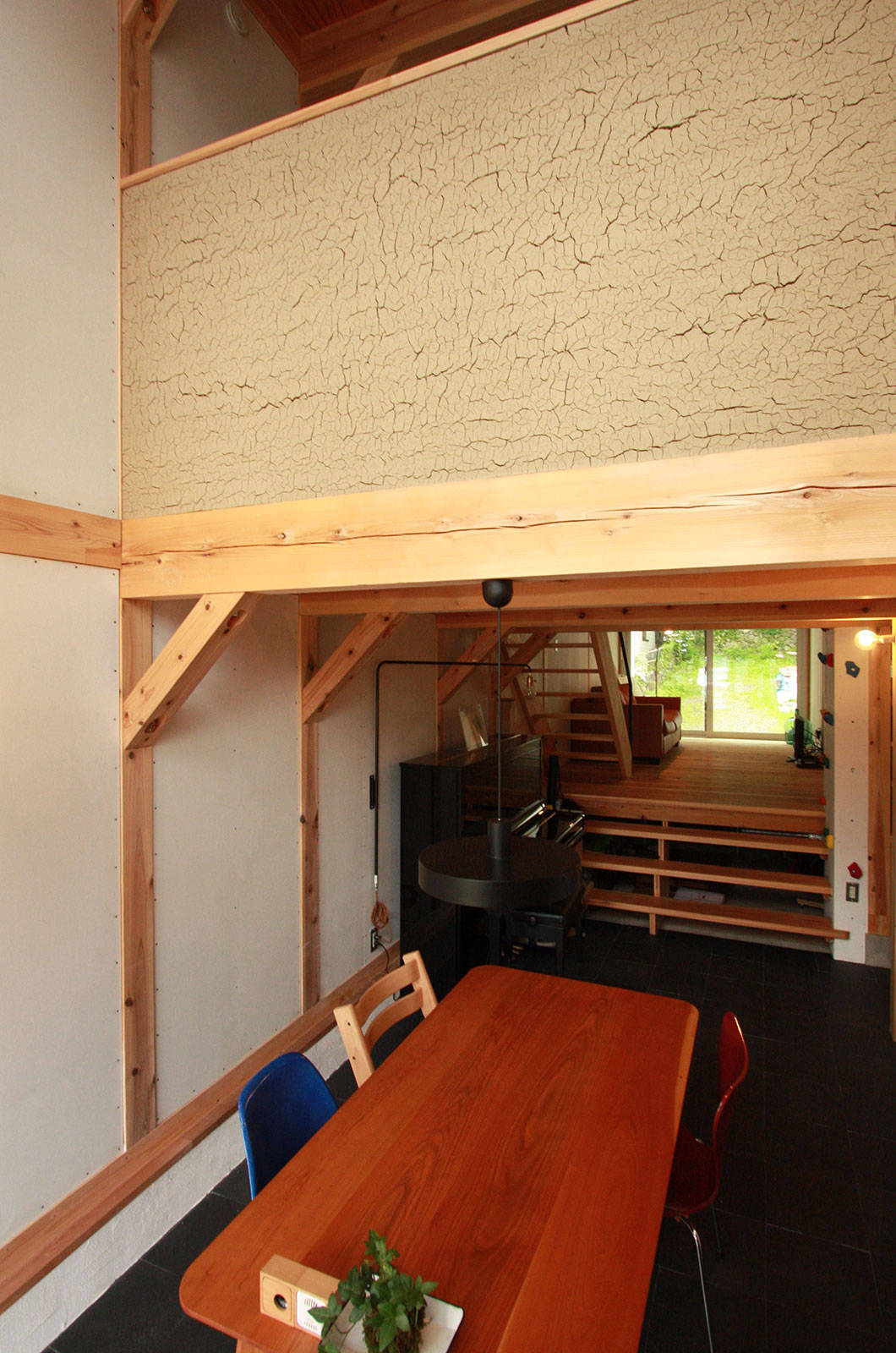 敷地は間口6mの鰻の寝床。狭い間口で南面からの日射取得を最大限化するために、ほぼ建物の幅いっぱいを開口とした。南北面が抜けたトンネル状の空間を夏は川風が通り抜ける。一方、冬は取り込んだ日射熱を逃がさないため、エアコン1台で家中を快適な温度にできるほどの高い外皮性能(Q=1.4,U=0.4)を持つ。内部の空間は2つの吹抜けを持つスキップフロアで、自然素材を多用している。