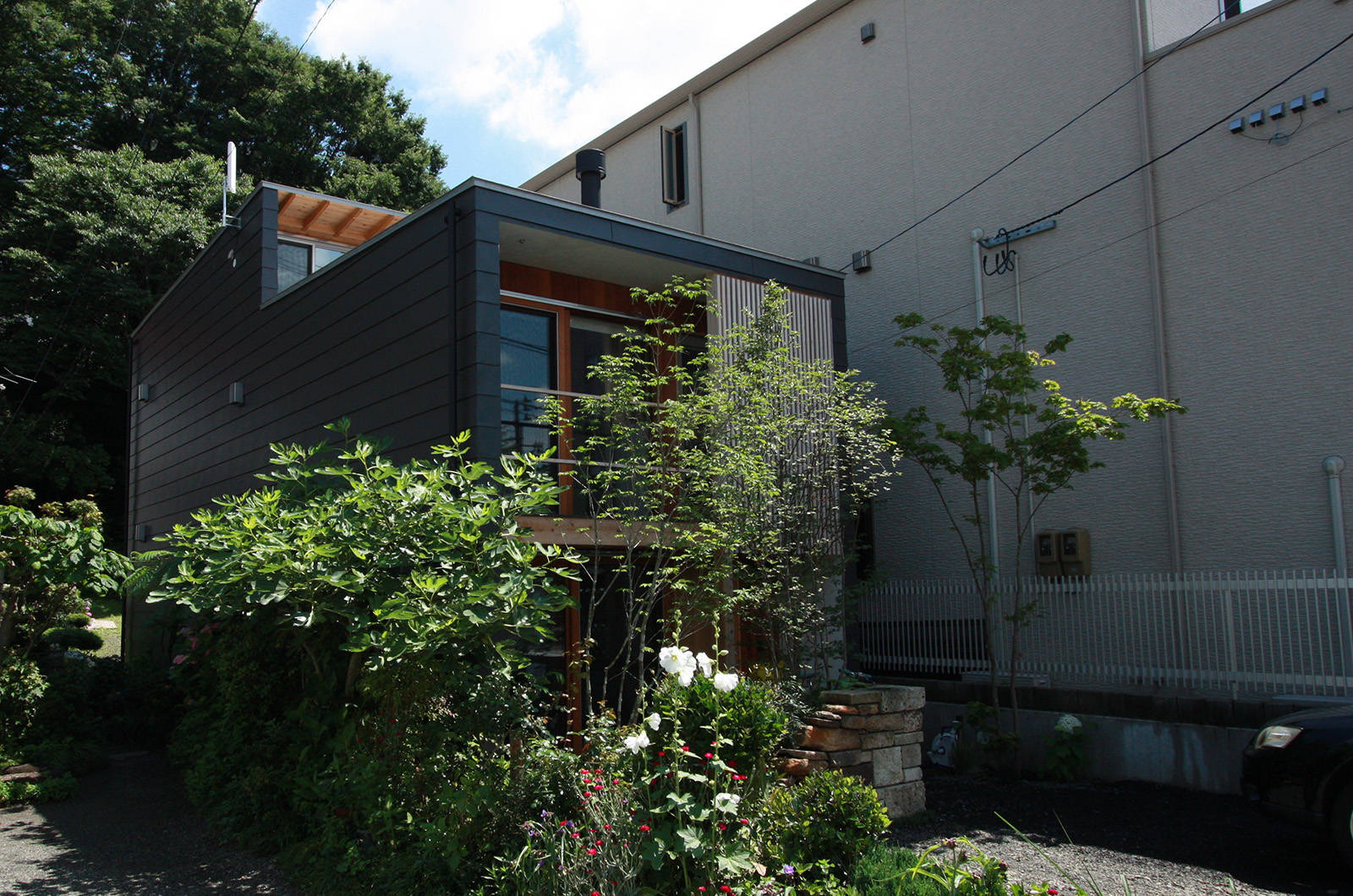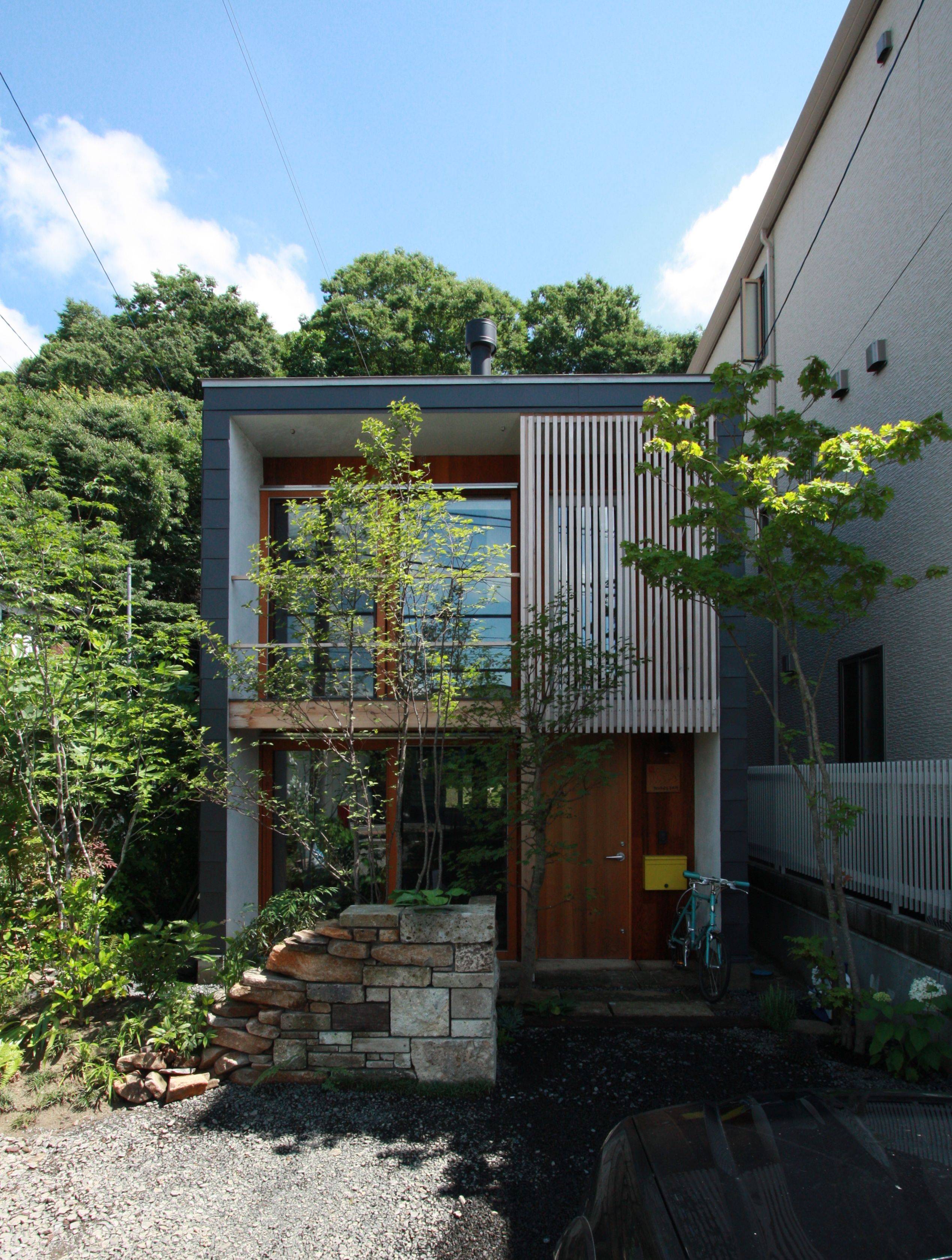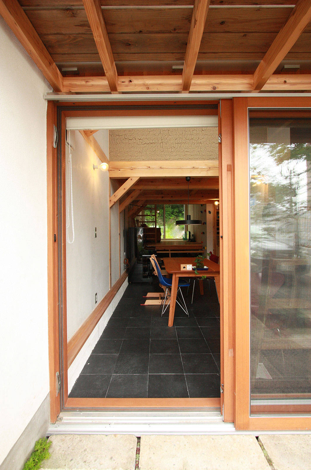 敷地は間口6mの鰻の寝床。狭い間口で南面からの日射取得を最大限化するために、ほぼ建物の幅いっぱいを開口とした。南北面が抜けたトンネル状の空間を夏は川風が通り抜ける。一方、冬は取り込んだ日射熱を逃がさないため、エアコン1台で家中を快適な温度にできるほどの高い外皮性能(Q=1.4,U=0.4)を持つ。内部の空間は2つの吹抜けを持つスキップフロアで、自然素材を多用している。