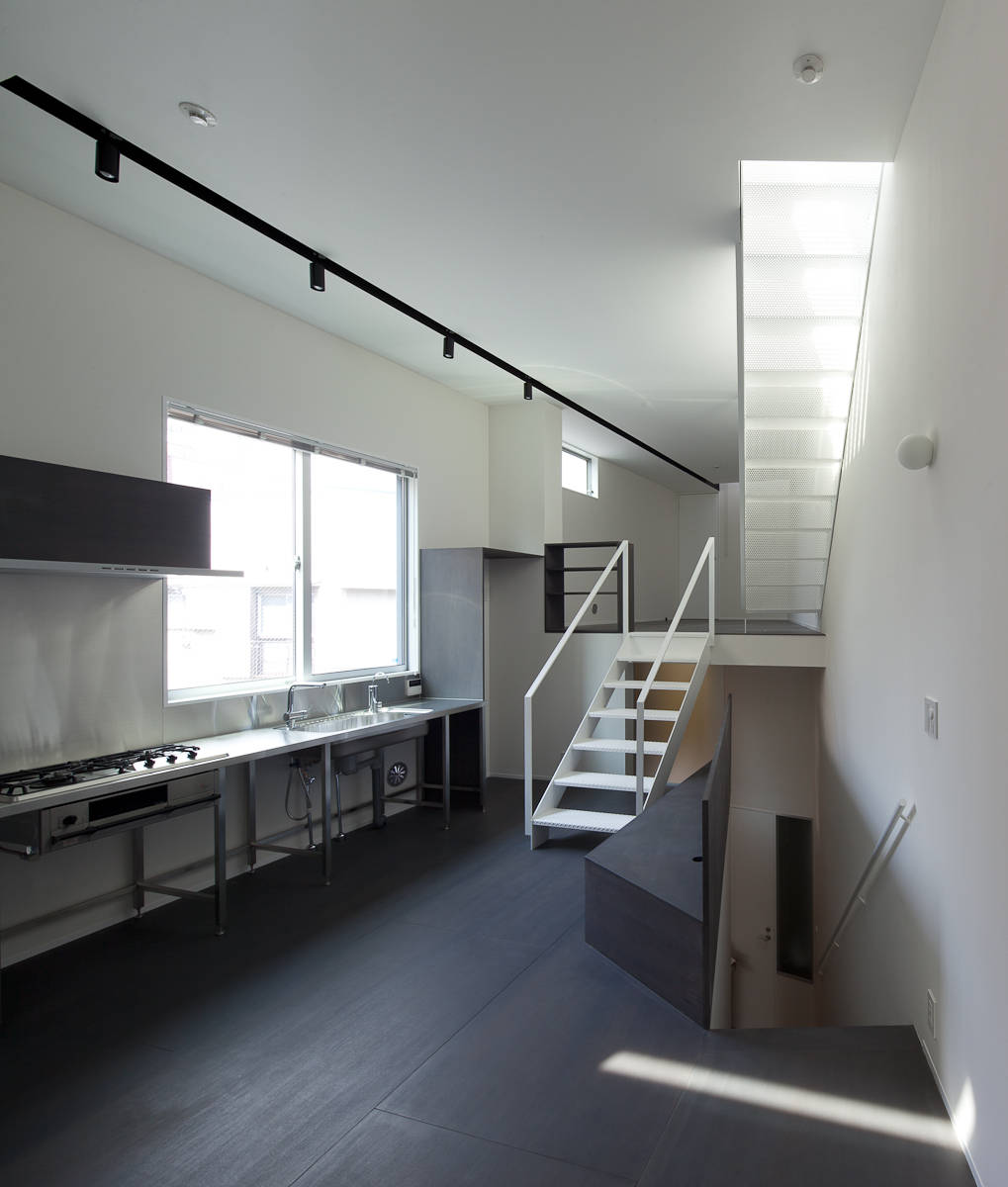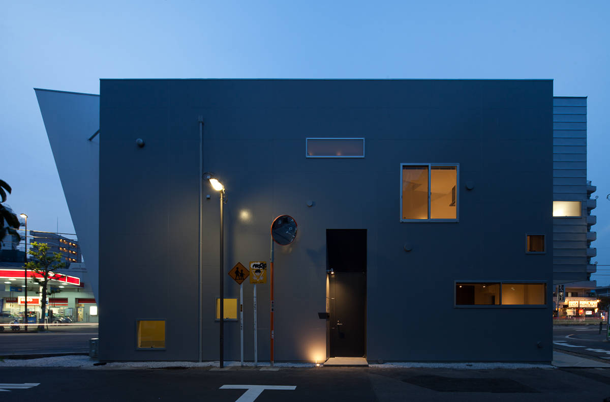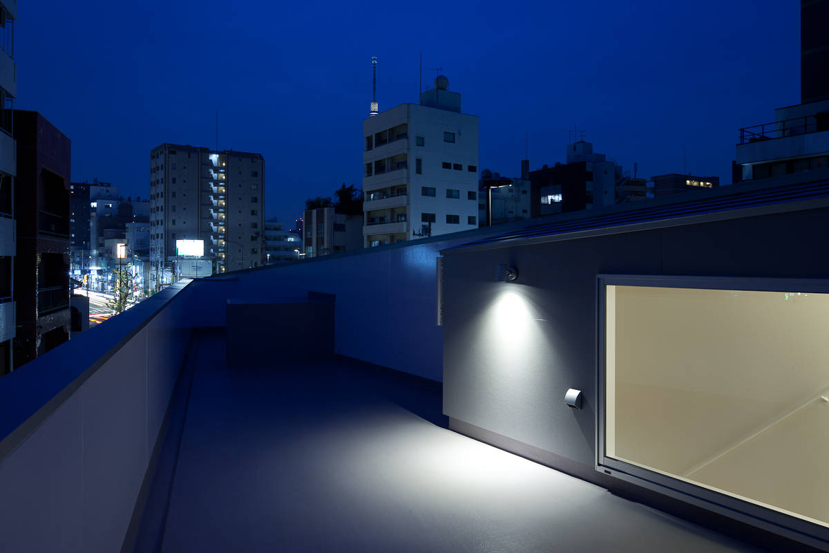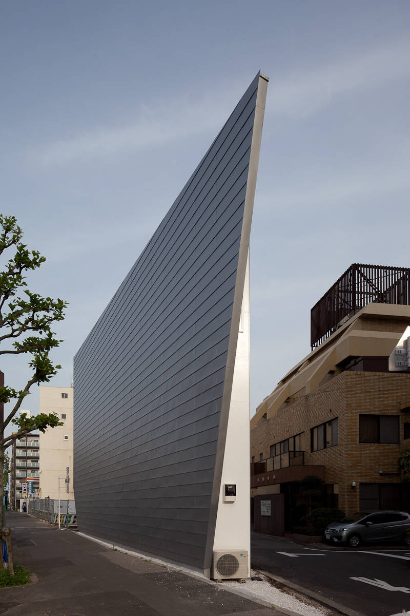 敷地は三角形で全ての辺が道路に面しています。抽象的でエアポケットのような形態を与え、北側の道幅28mの蔵前橋通りに対峙しています。南側はヒューマンスケールの下町の風情で、必要に応じて開口が設けられています(ペット用の床に近い窓)。内部はスキップする床やハイサイドライトにより立体的な構成になっています。