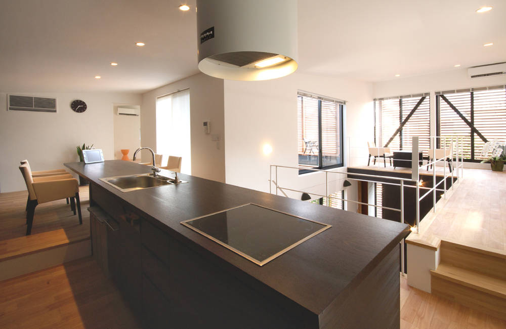 次に、内部空間について説明すると、東棟の内部は吹抜となった階段ホールを挟んで"3段のスキップフロアー"が続いている。このため"床面積以上の広がり"を感じることができる。A世帯(親世帯)のリビングでは吹抜を介してB世帯のオープンスペース(子供用)と一体の空間となっている。B世帯のリビングは小上がりになった畳の間から滑らかにキッチン、ダイニングへと繋がる。ここでも"5段のスキップフロアー"とし、家族の営みにおける"広がり感や繋がり感"を丁寧に扱うことを心掛けた。