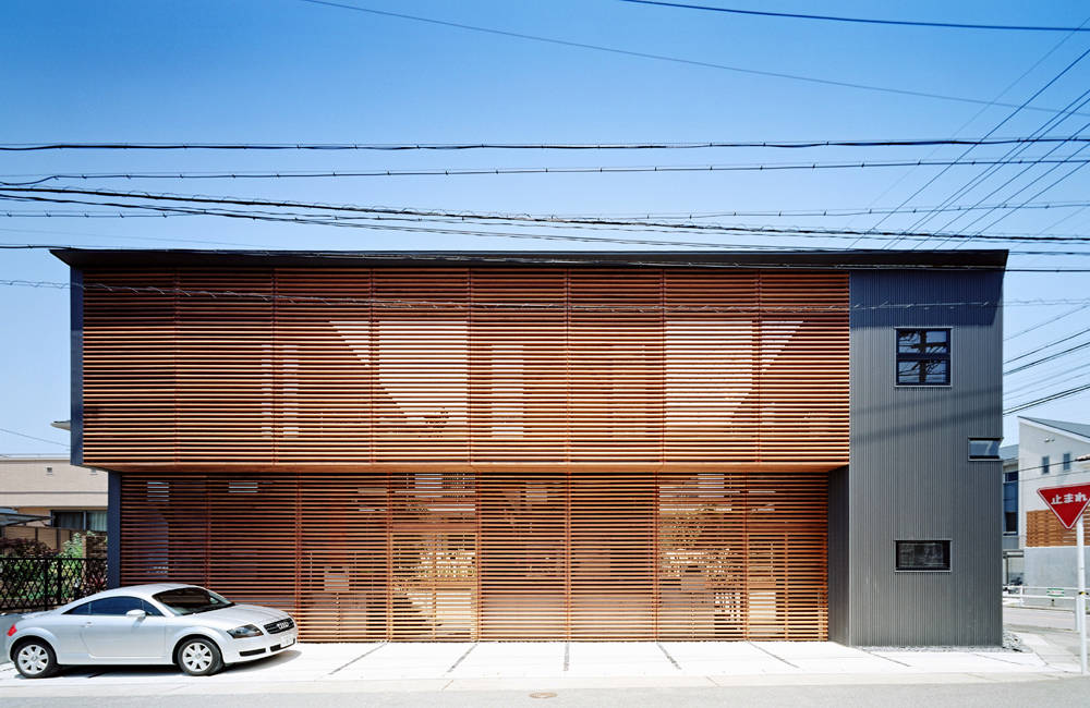 南面を覆う"木製の格子"は、住宅全体に纏まりを持たせると同時に、冬の日光を受け入れつつ夏の日差しを遮ること、通風を保ちつつ外からの視線を和らげることを意図している。