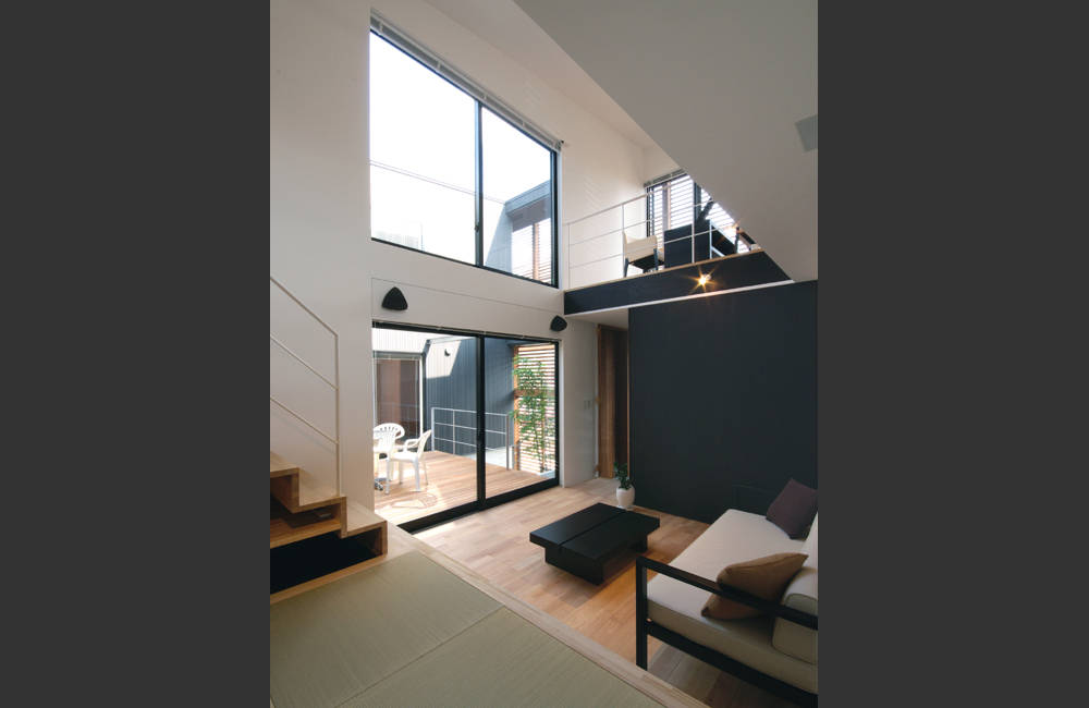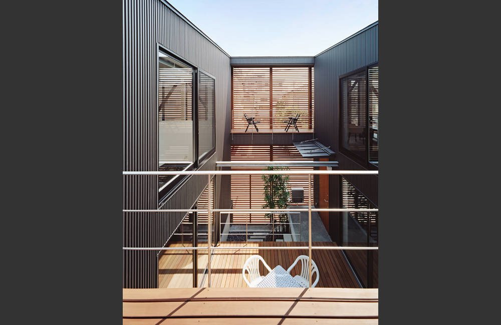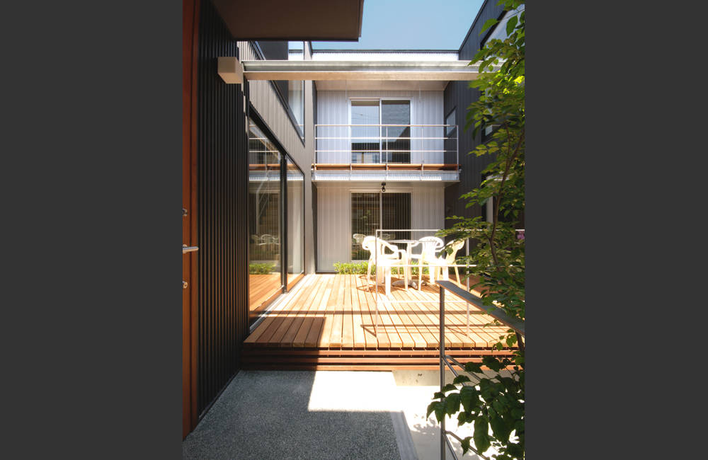 中庭は各世帯のアプローチ、デッキ、庭として機能する。パーティーなどイベントの際にはサッシを開放し、この二つの中庭デッキと二つの吹抜リビングさらに東棟のエントランスが繋がり東西方向に"ボイド空間が連結"することで、静かなプランに躍動感を与えることを狙っている。