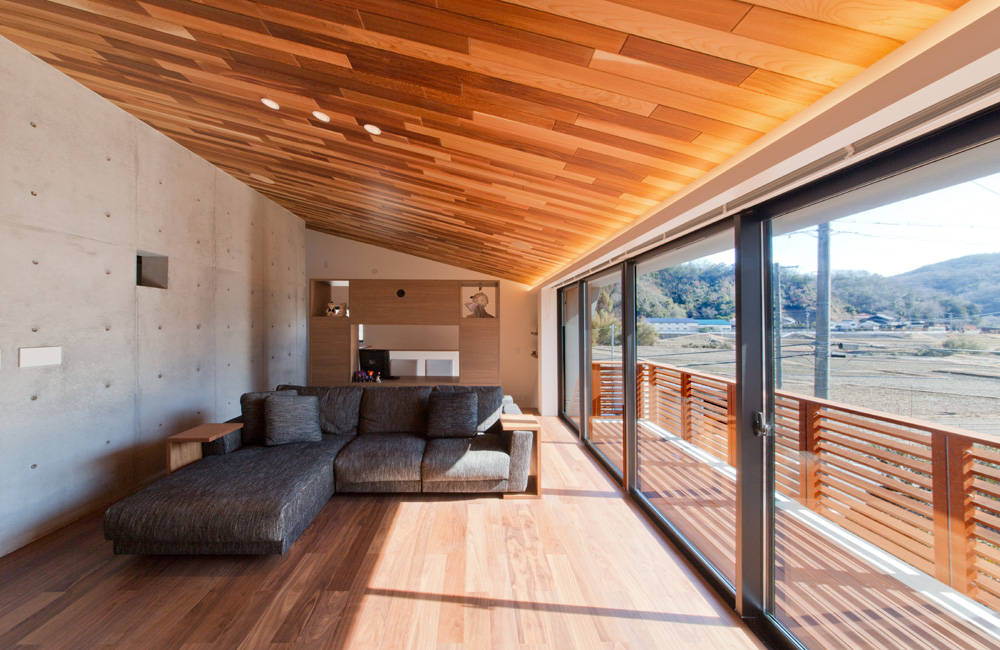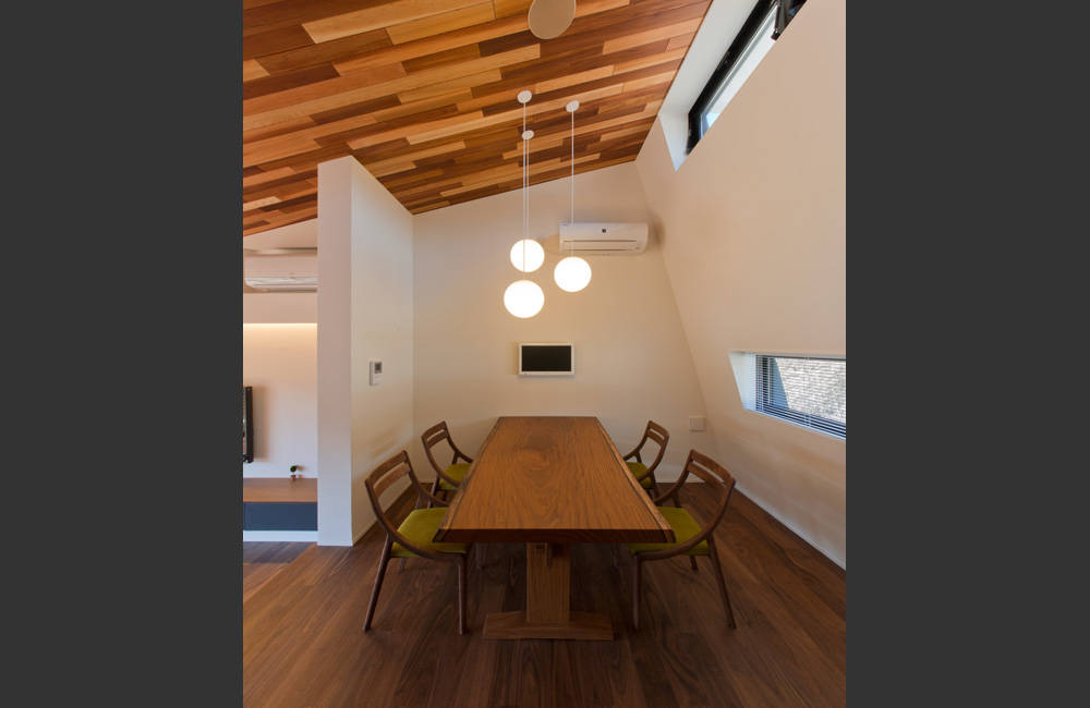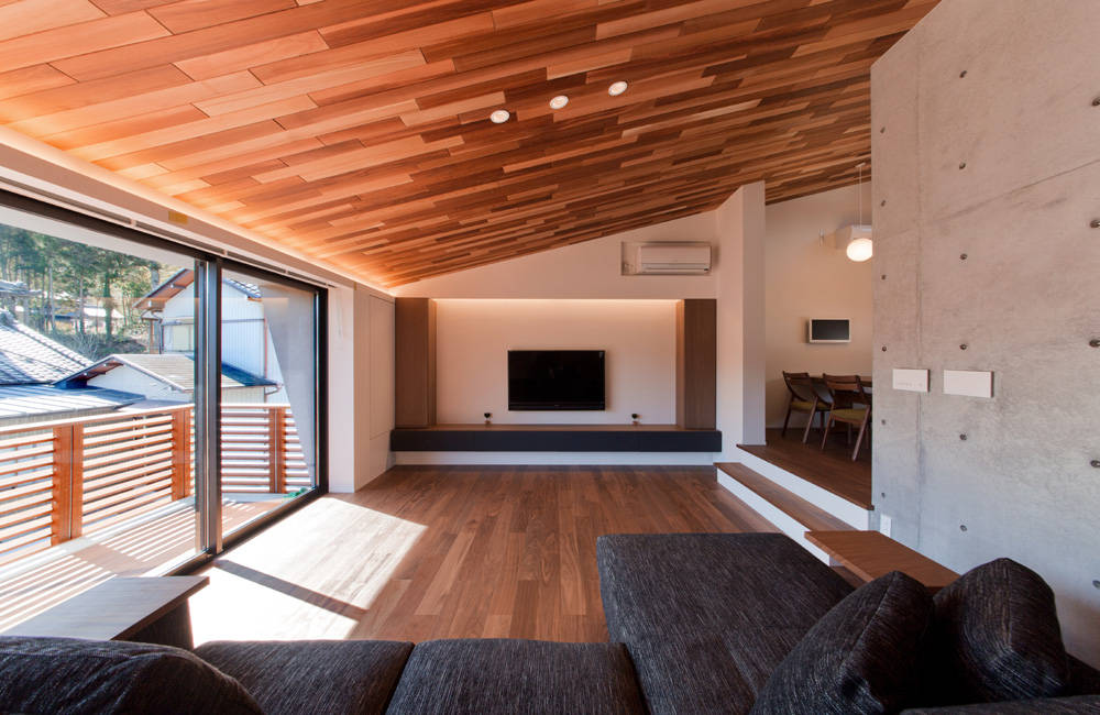 大きな開口に面したリビングと天井の高いダイニングは、打放しコンクリートの壁と、 40cmの床の段差でゆるやかに仕切られていますが、屋根と同じ勾配に傾いた天井は南の大開口まで連続し、 伸びやかで開放的な印象をつくります。