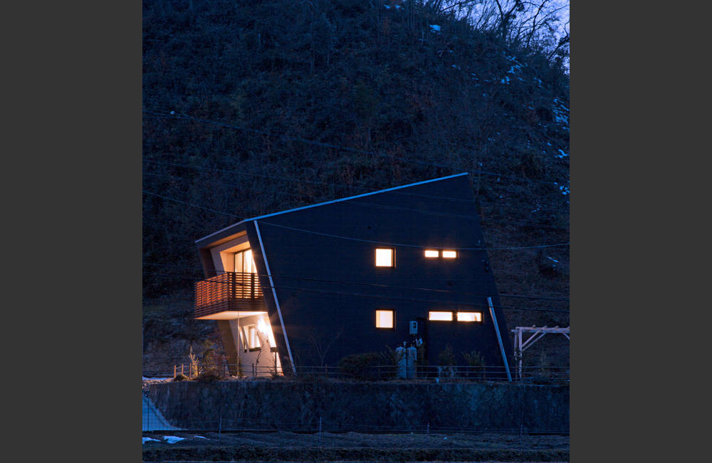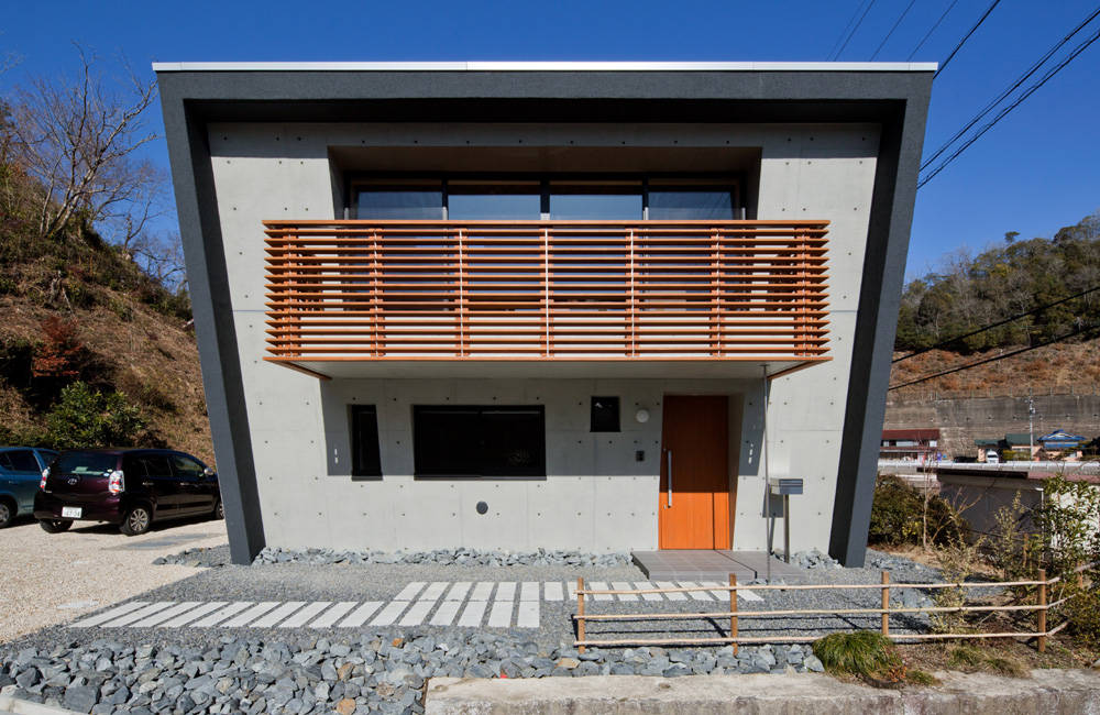 外観は2階建ての四角い箱を15度傾けています。傾いたハコは将来設置予定の太陽光発電パネルに対して合理的な屋根勾配を得られるだけでなく、南に大きな軒を生みだし、暮らしやすさに貢献しています。