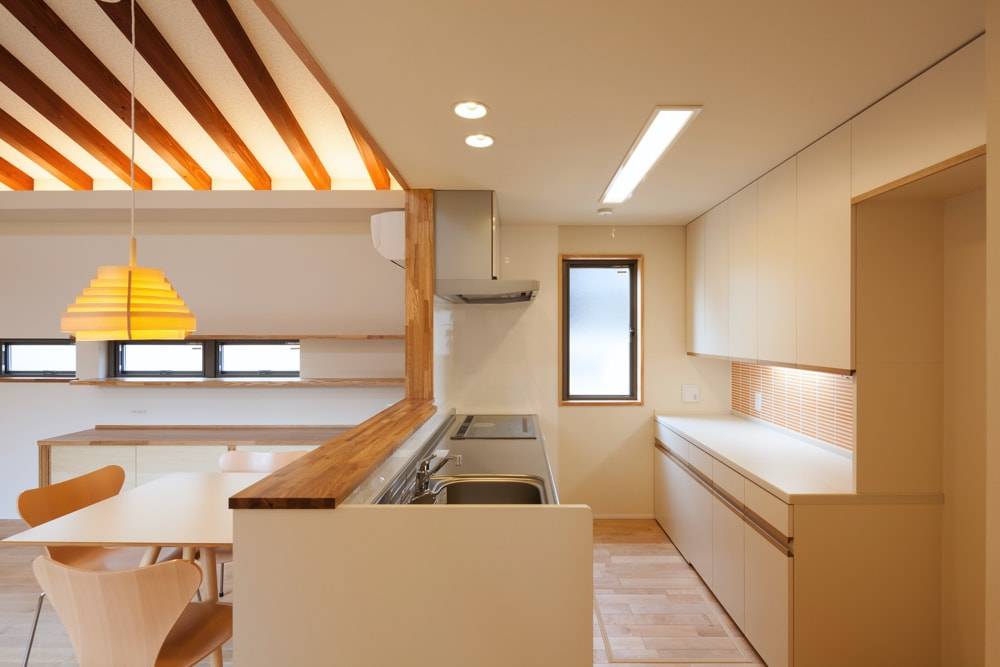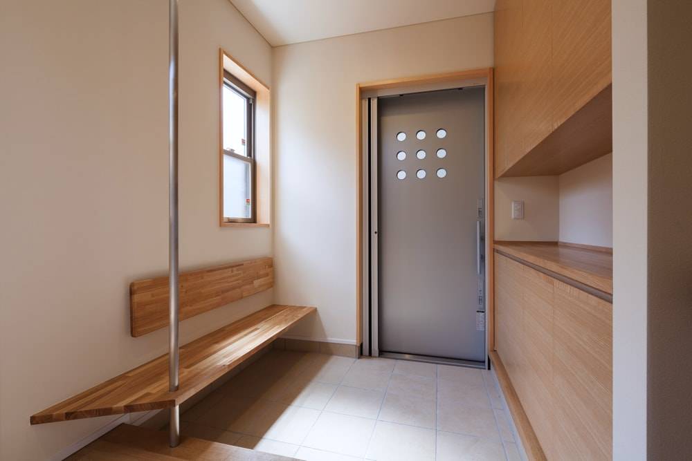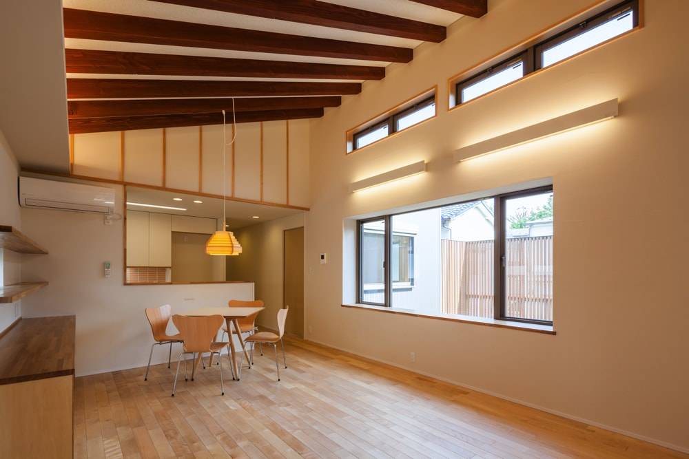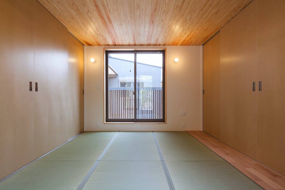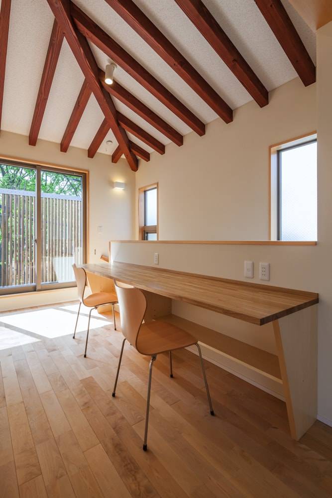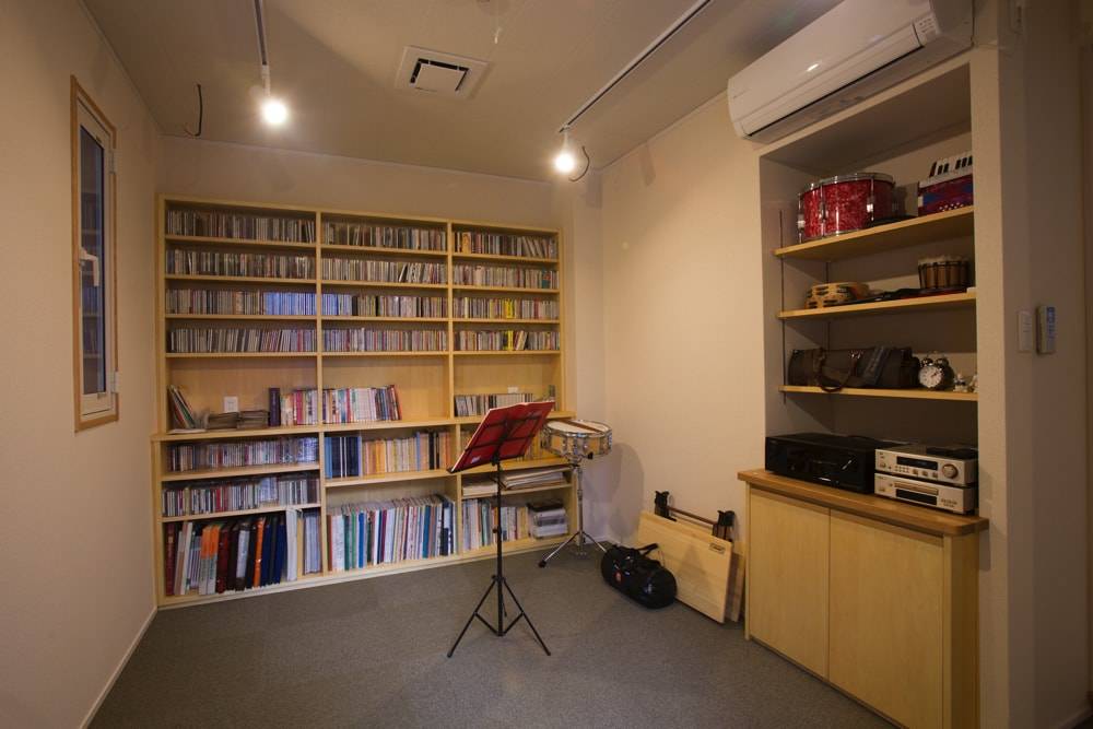 1階にご両親、2階の息子さんご夫妻が暮らす 2世帯住宅。生活空間は上下に分かれつつも、光や風を共有しお互いの気配が感じられる中庭型の住宅です。1階にはアマチュアオーケストラの楽団員であるご夫妻のために特殊防音が施された音楽室を造りました。木の雰囲気が全体と柔らかく調和する空間となりました。