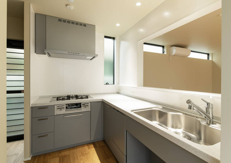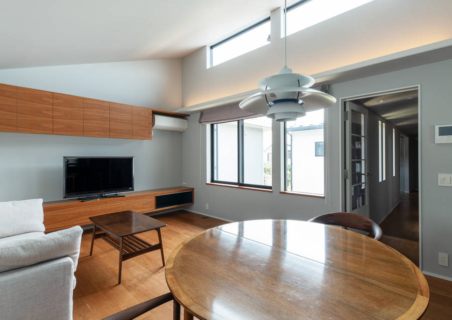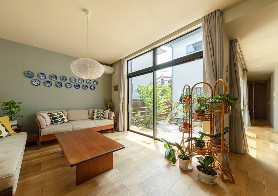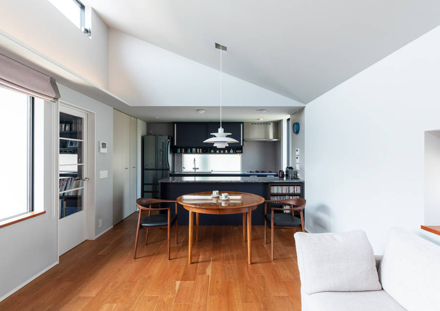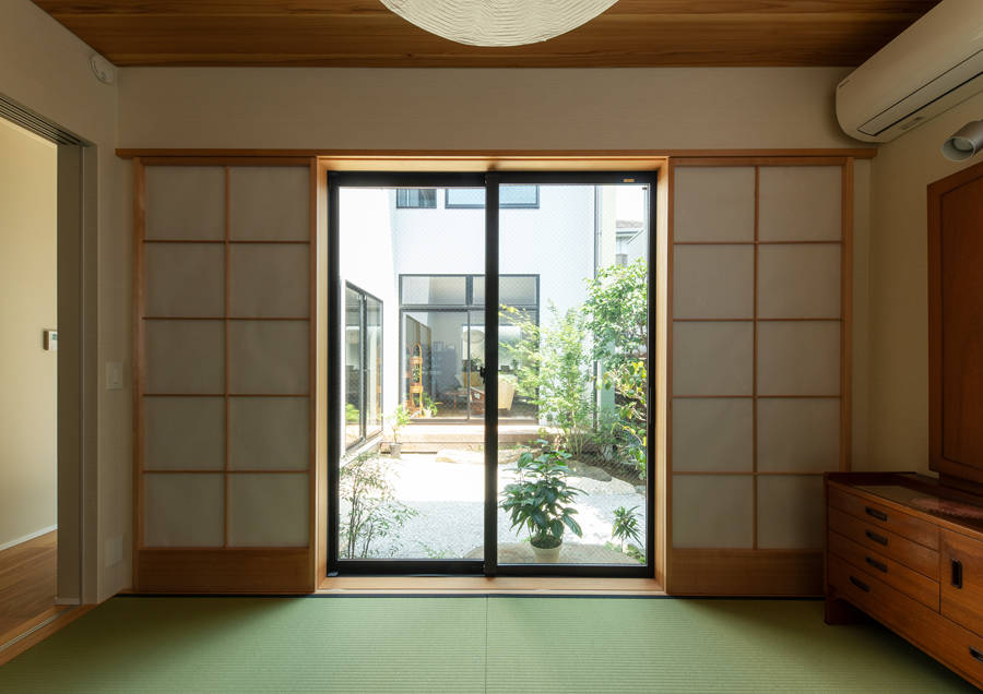 デンマークでのご経験をもとに、今回の家づくりは感性のあう方にお願いしたいという丁寧なお申し出をいただいたのを覚えています。奥様や同居される息子さんご夫妻にも快く賛同いただくことができました。ご要望の中で特に重視されたことは、1階にいかに光を取り入れて明るい空間ができるかということでした。1階は親世帯、2階は子世帯とした場合に1階の親世帯が暗くなってしまうことへの改善策として、「中庭」を利用して室内に反射光を取り入れることをご提案しました。日本の伝統建築の中には白い壁や庭に敷かれた白い砂利などその反射光を利用して間接的に光を取り入れているものが多くあります。更には中庭は外部からのプライバシーを守る効果や、台風などの強風を避け、住宅内部の音環境を安定させる効果など、その利点を最大限活かせるプランとしました。ソフト面ではそれぞれの世帯の暮らしの現状を伺いながら、同居することで起こりうる様々な問題や場面を想定することで、同居のシナリオを丁寧に組み立てていきました。性能面では耐震性能+制震性能を取り入れ、高い断熱性と気密性、機械換気を採用することで、温熱環境と空気環境の安定化を図りました。外観はモスグリーンの落ち着きのある色彩とし、緑豊かな住宅地への配慮と環境調和のかたちを目指しました。