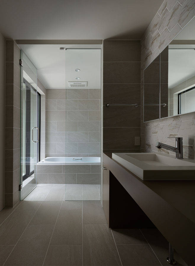 2つの直方体を水平方向に交差させ、その隙間に生まれる空間を中庭として室内とのつながりをもたせた。これによりプライバシーの守られた外部空間を確保することができた、