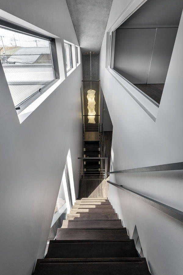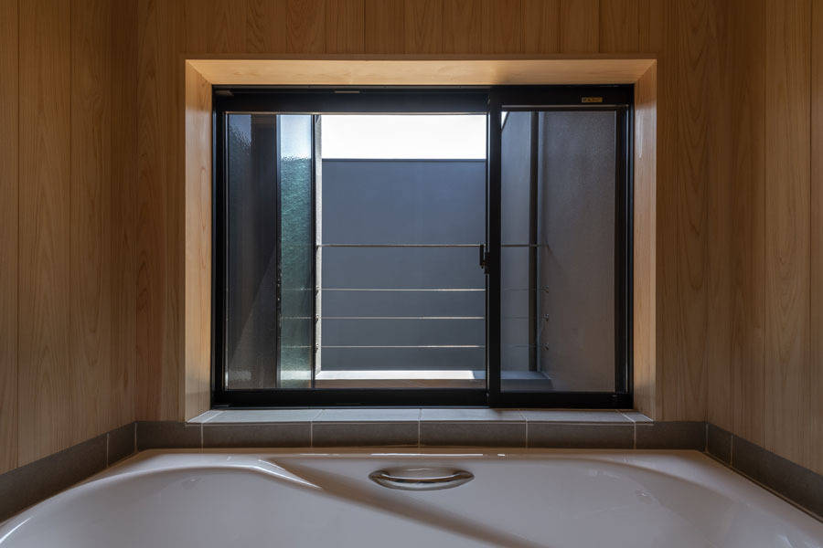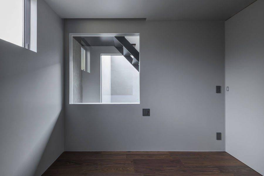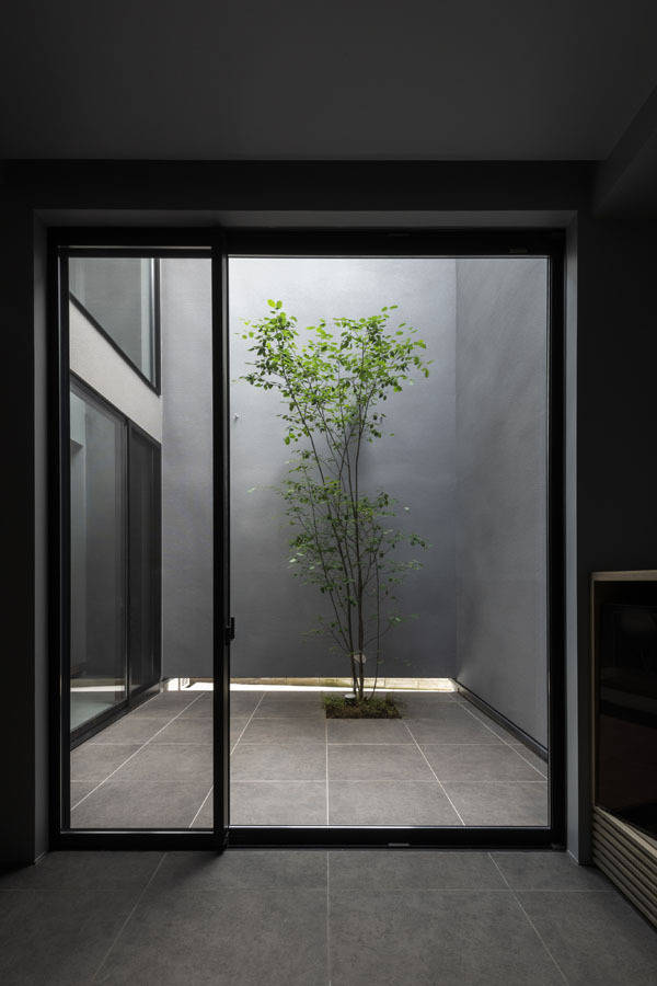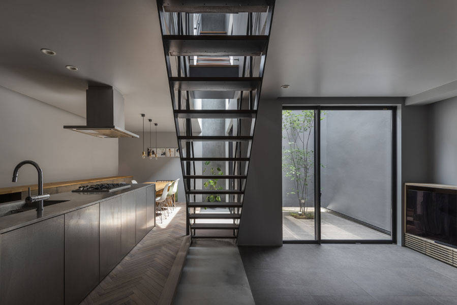 二つの外層で覆われてできた空間は一方では「ダイニングキッチン」→「階段吹抜」と縦方向へ広がっていき、もう一方では「リビング」→「中庭」と横方向へ広がっていき、それぞれの方向性をもって奥行きを造り出していく。