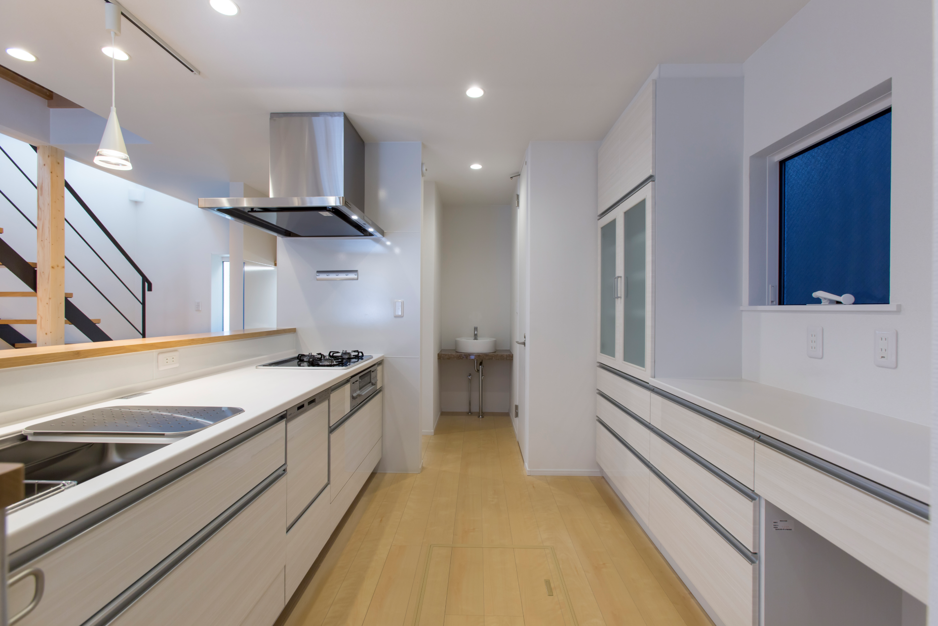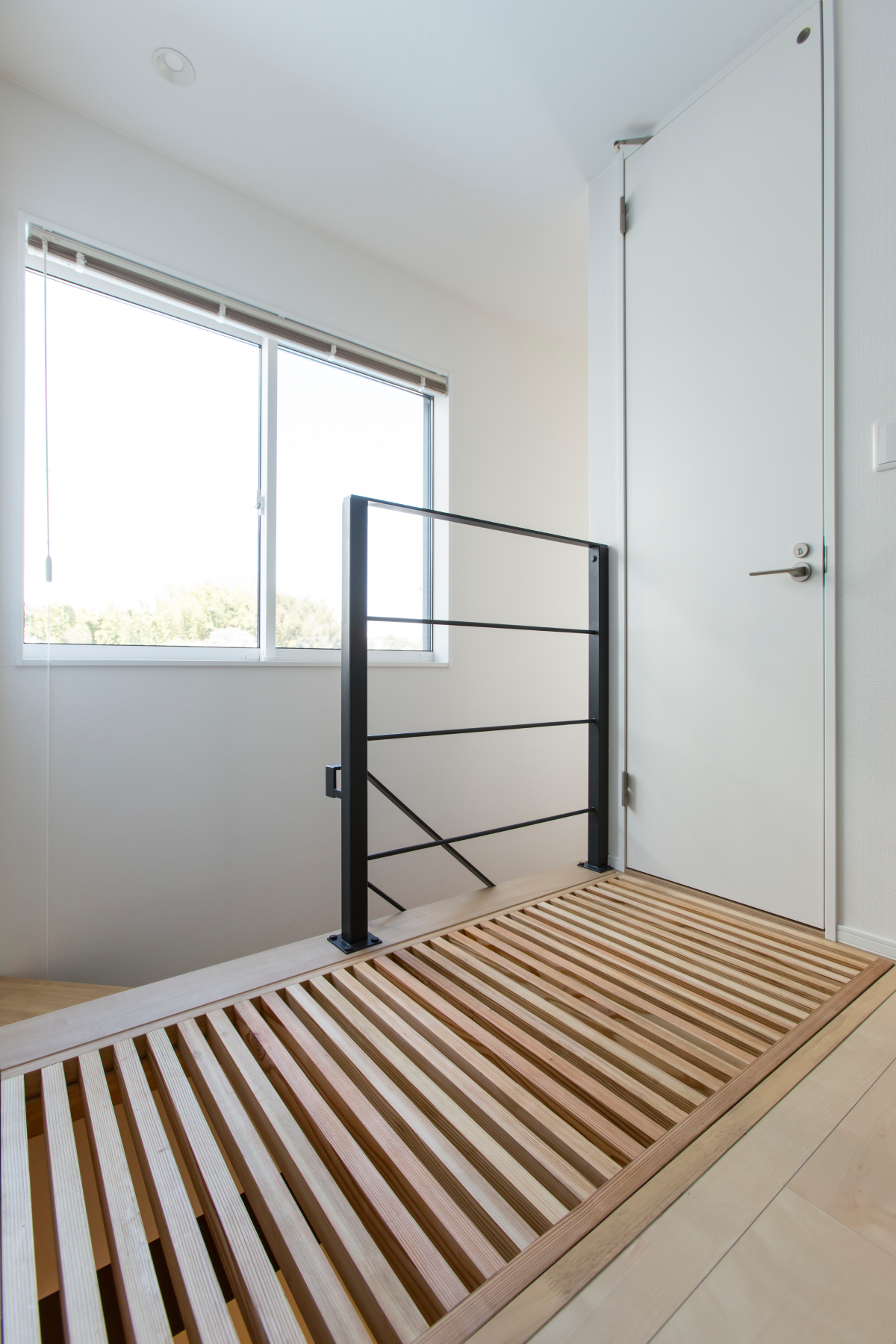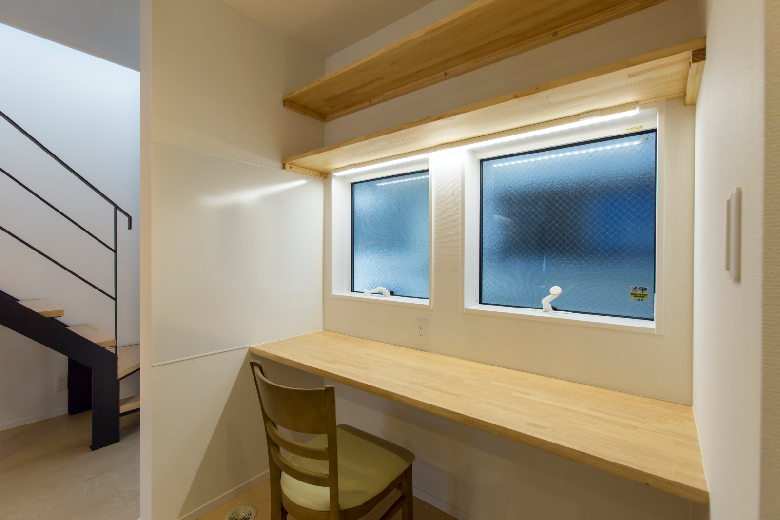 敷地環境は住宅密集地で間口が狭い敷地。 道路側は採光を確保できるが、建物の1階奥部分の採光が困難である。 建物規模に余裕があれば様々な方法もあるが、厳しい条件の中、トップライトは使わず、大きなハイサイド窓から光を入れ、階段室・スノコ床を通して1階奥部分を明るく、居心地の良い場所としている。