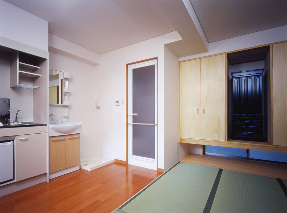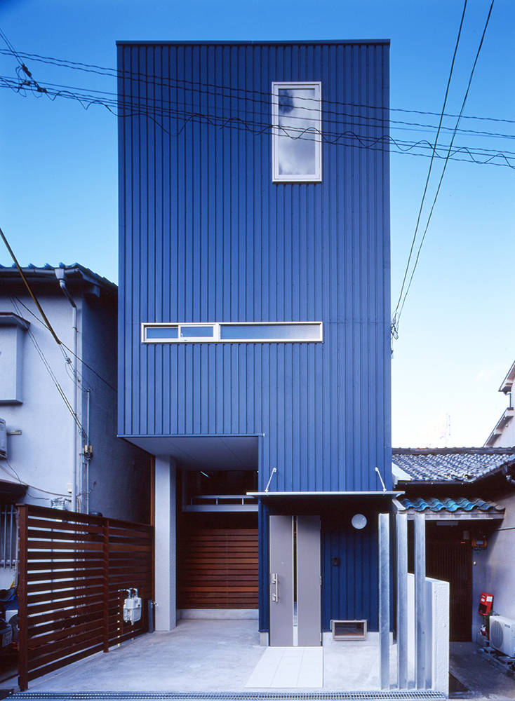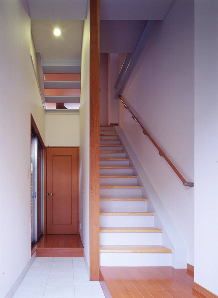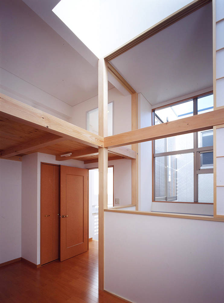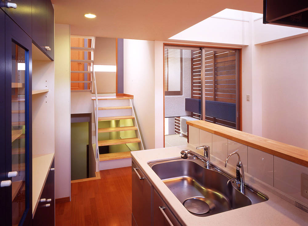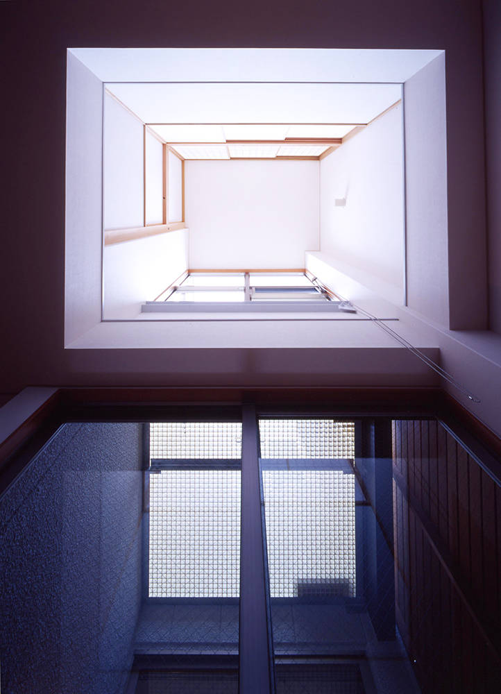 快適な生活をするため閉鎖的な建物をふたつに分け、スキップ階段で繋ぎ、中間部で天空から光を取り入れ、各部屋や中庭に光を導いています。閉鎖的な外観からは想像できない程、内部空間は光が豊かで居心地の良い住宅です。