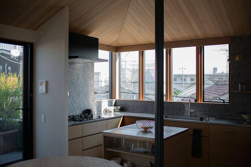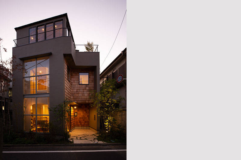 西荻窪の骨董通りを抜けた先20坪の土地に 建坪12坪の3階建て染織り作家である妻のアトリエを1階に2階3階は 家族3人の住まいとして貫く大きな窓 道にこぼれる緑は 家と町をつなぐ連なる屋根並みの上に 浮かび過ごす時は刻々と変わる空の光に 染まり 満ちてゆく織りなす日々 手触りのある暮らしその向こうに