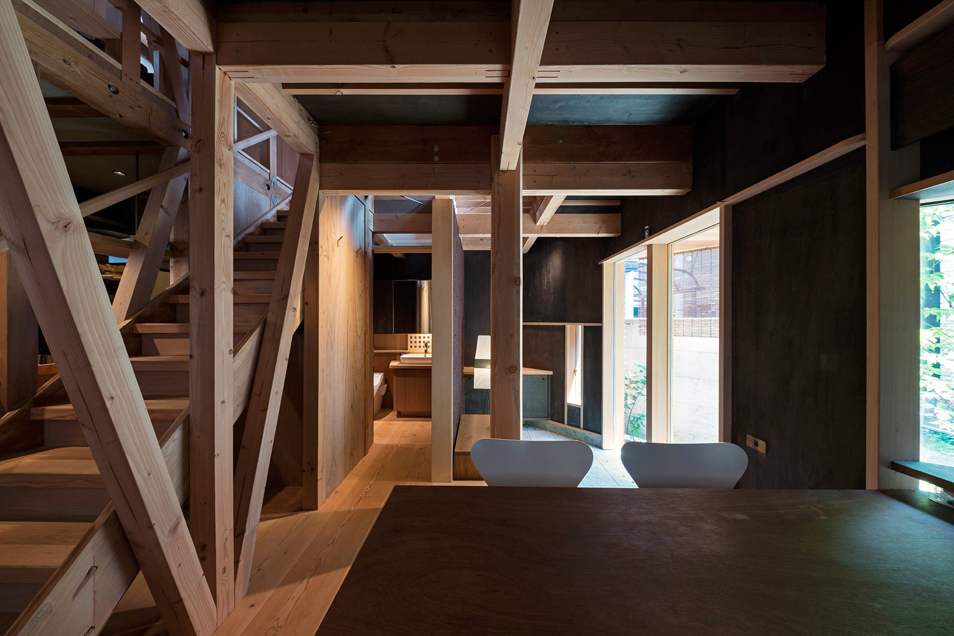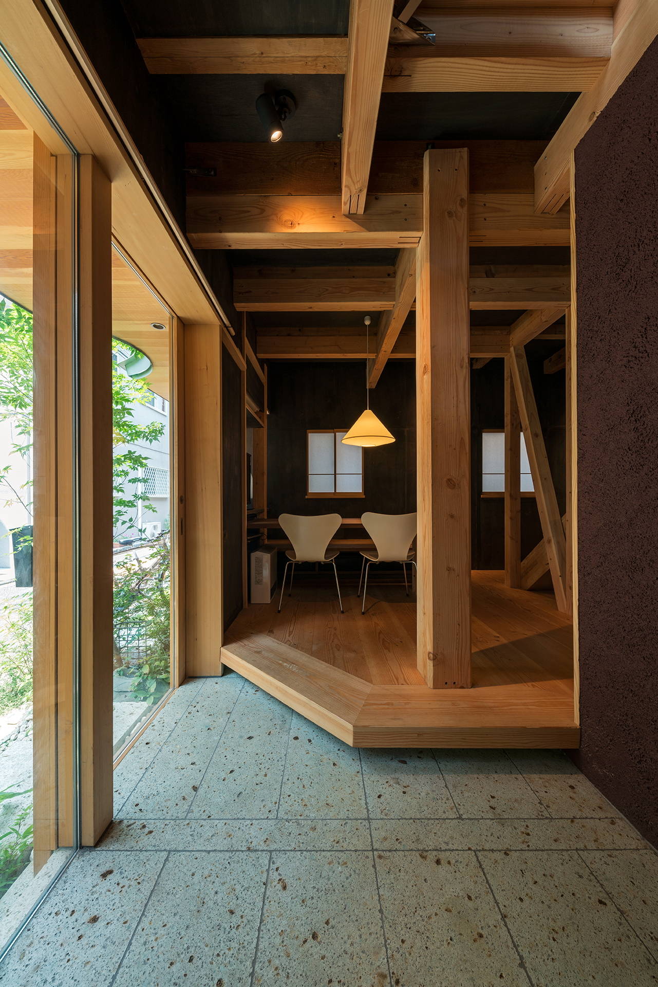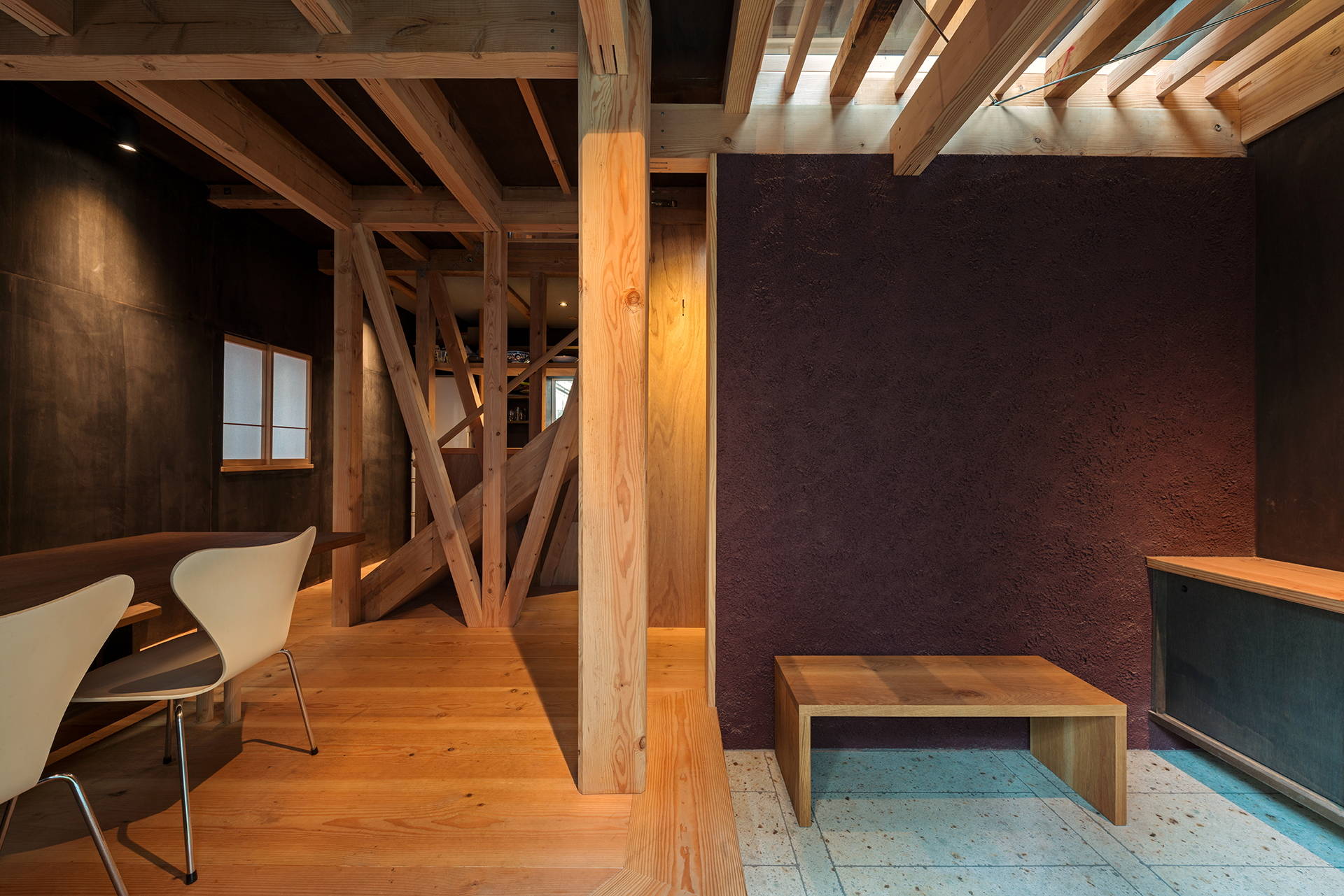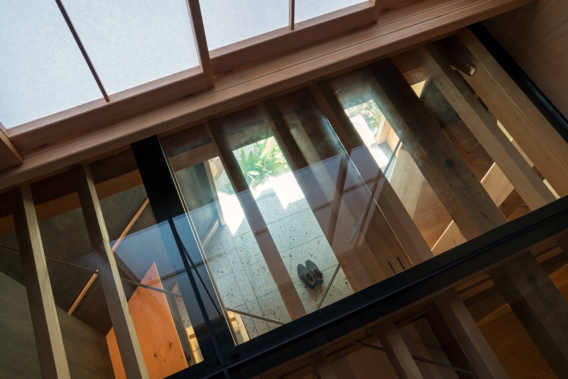 同時に、家族構成の変化に合わせ各階の不要な床や壁を取り払い、木架構を現わし、土間上部はガラス床とし、柱と同サイズの筋かいで開放的に耐震補強を行っている。