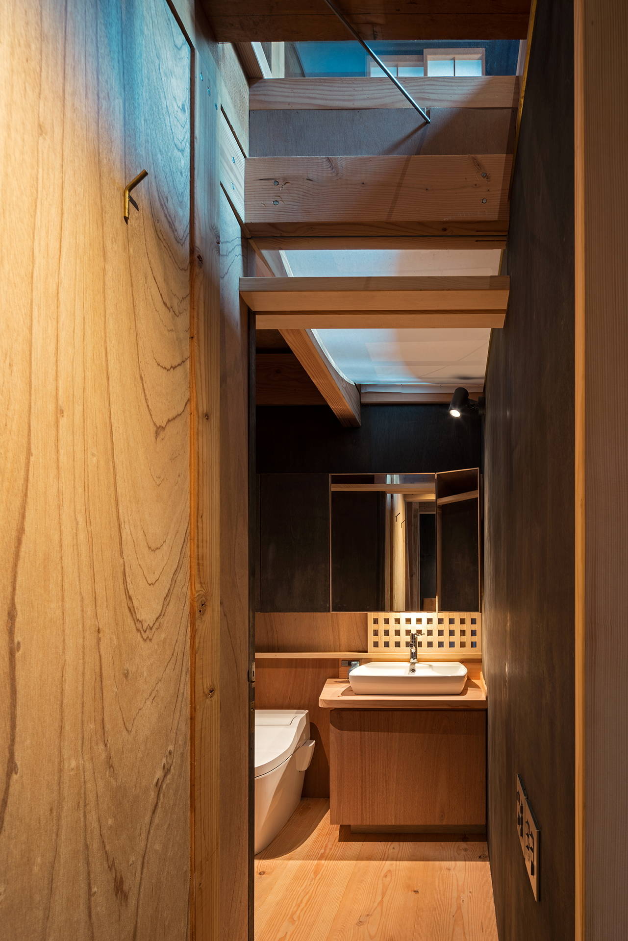 密集市街地では光の届きにくい1階へも、ホワイエやガラス床、開放された架構を通し陽光を溜め、階ごとに分断されていた家全体へも光や風が通っていく。