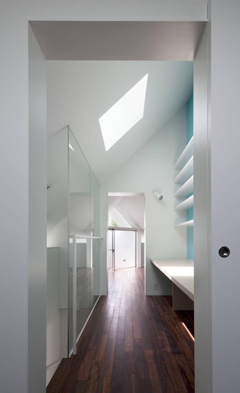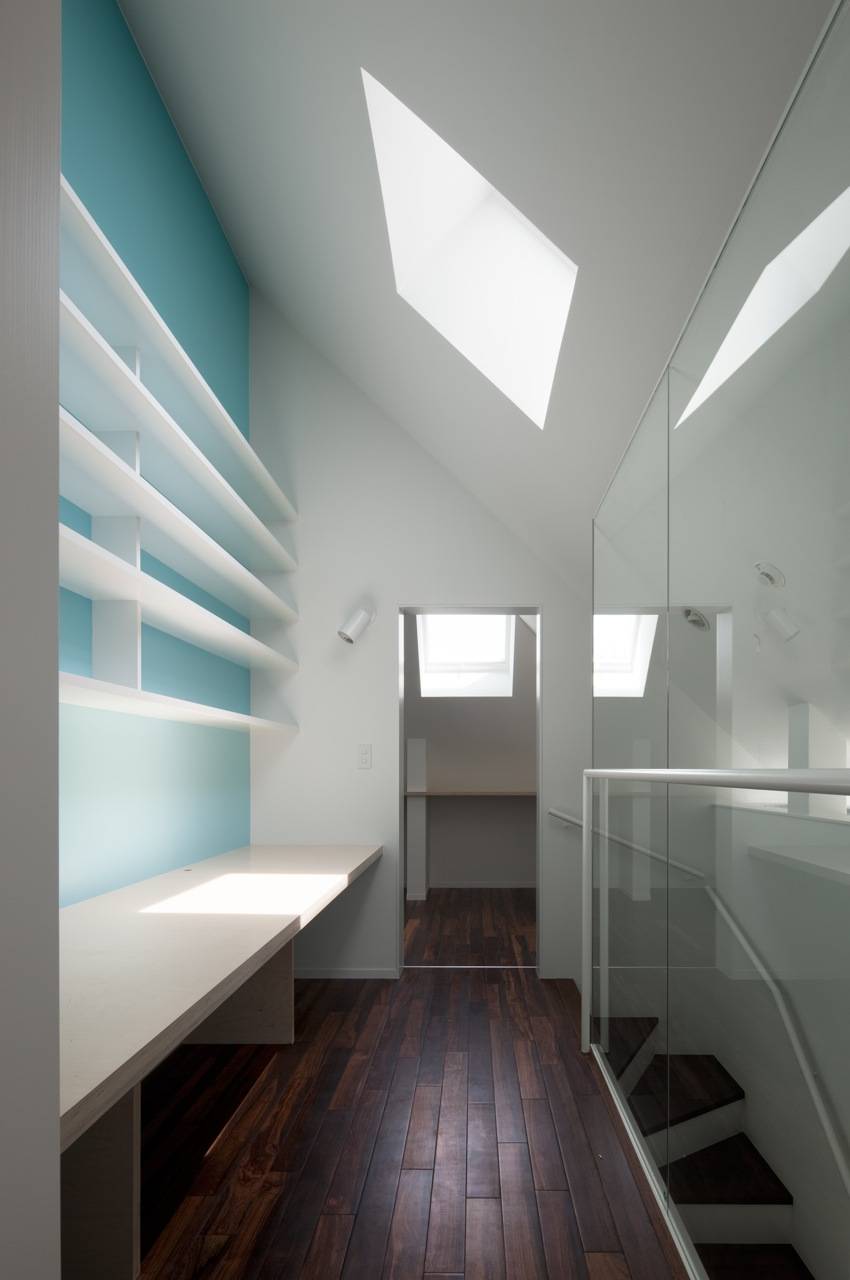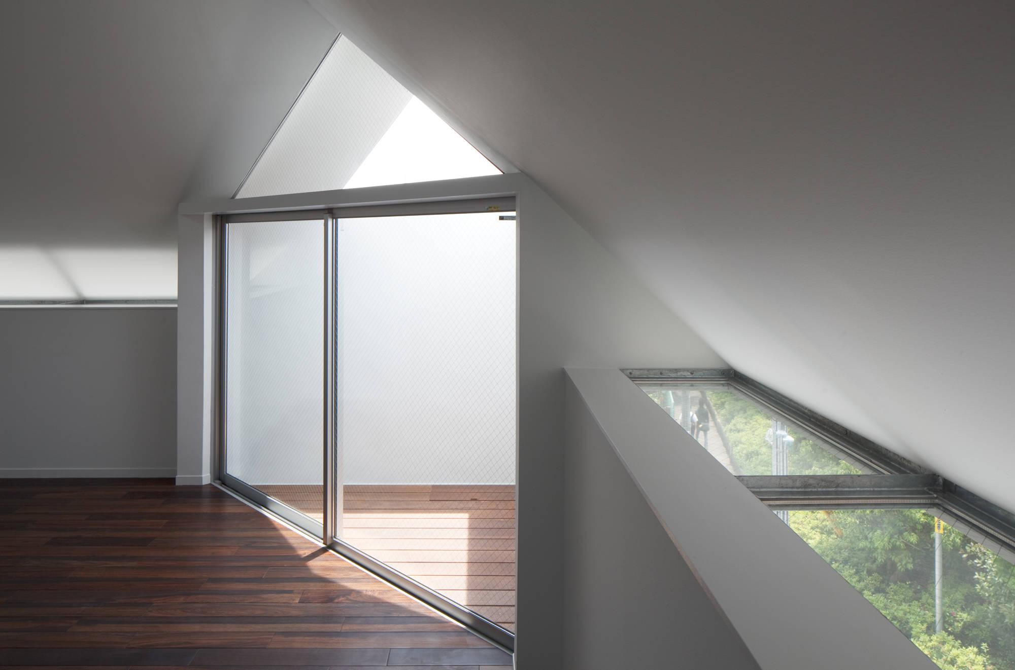 建物の四周に十分な隙間をとった上で、トップライト・庇裏の窓・小さなバルコニーなど、いろいろな開口部を設けたことで、1~3階のどの部屋にも明るく風の通る快適な住宅となった。