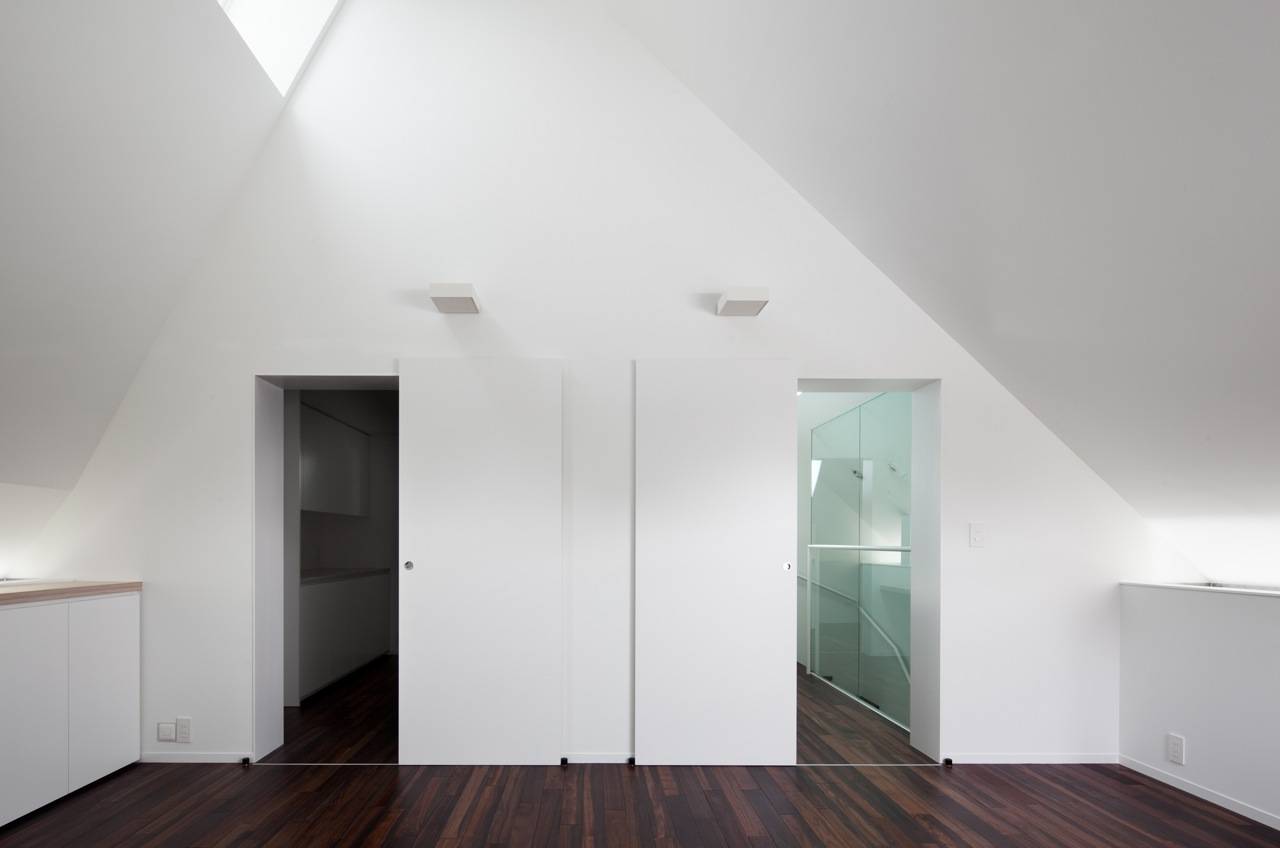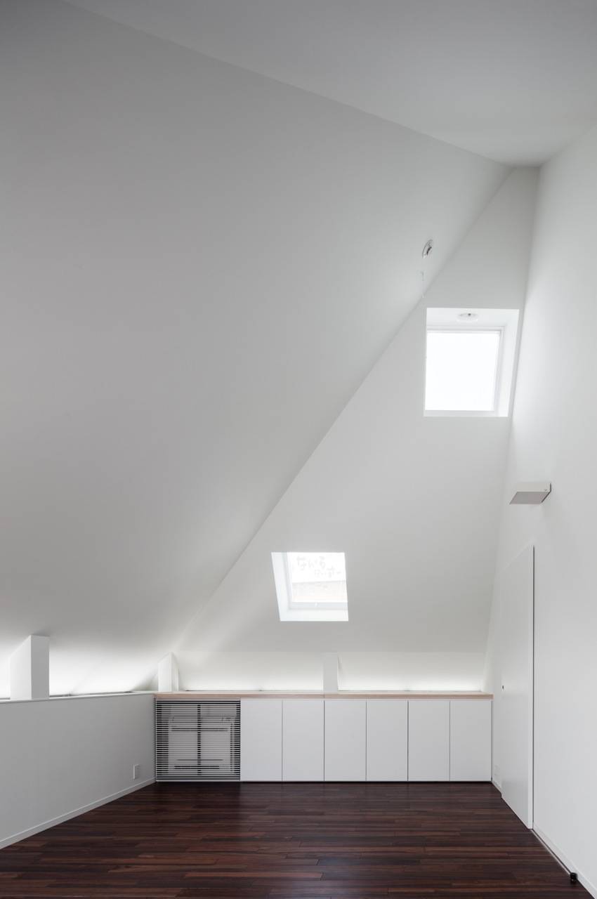 しかし、3階建てのヴォリュームは、周辺の建物との関係を見ると似つかわしくない。そこで庇のラインを2階建てのレベルにキープしたまま、屋根を肥大化させることで、3層目の空間を生み出す計画とした。これにより、外部からは一見2階建てのようだけど、実は3階建てという住宅がうまれた。