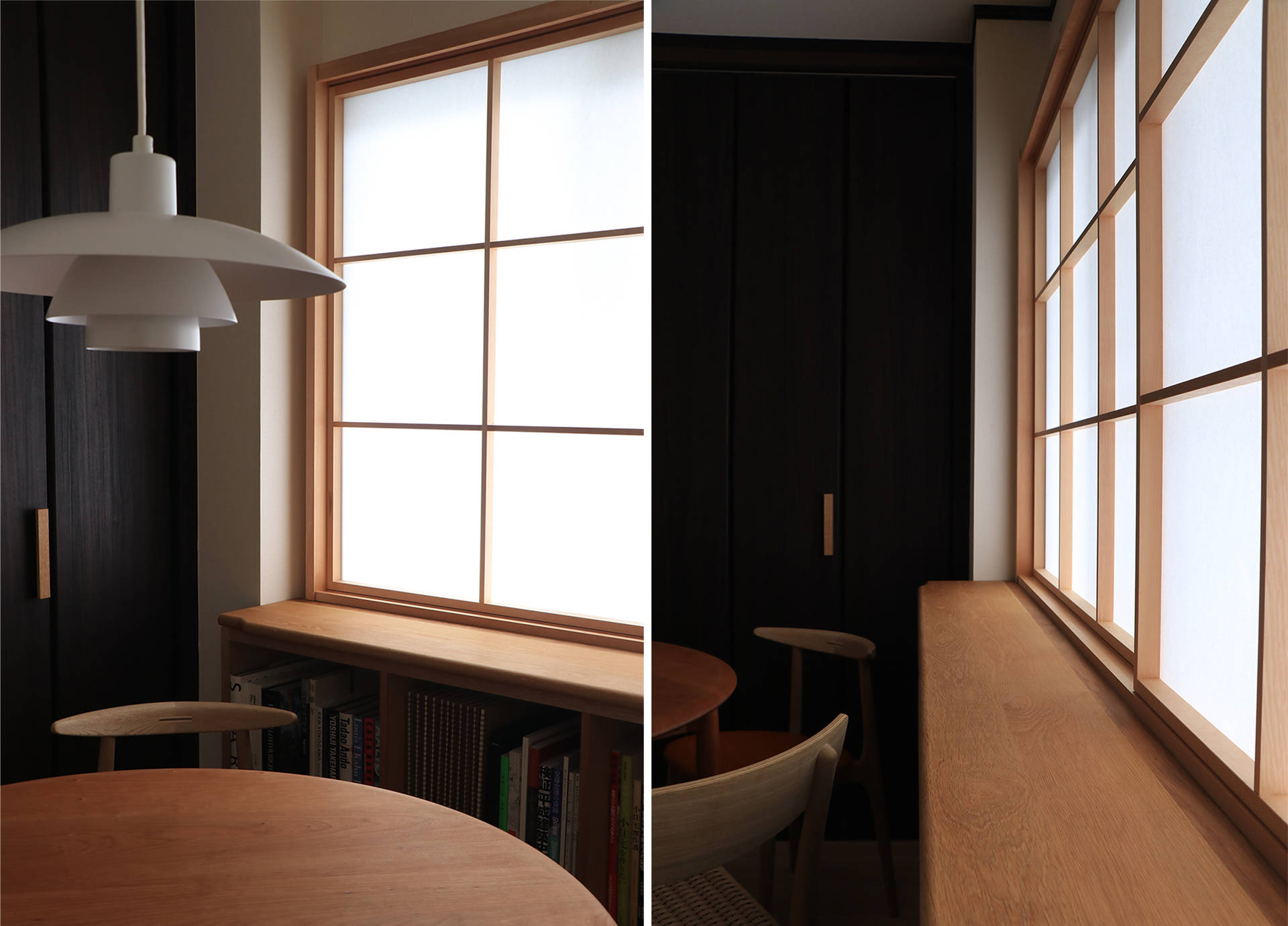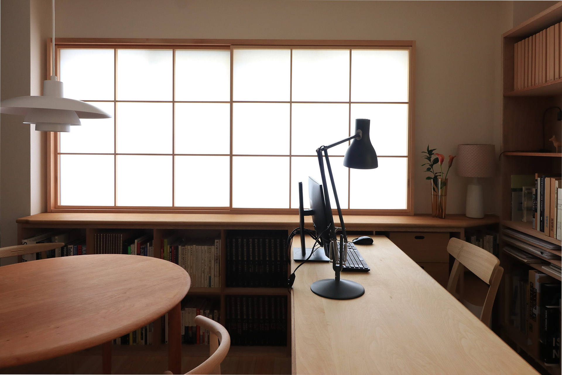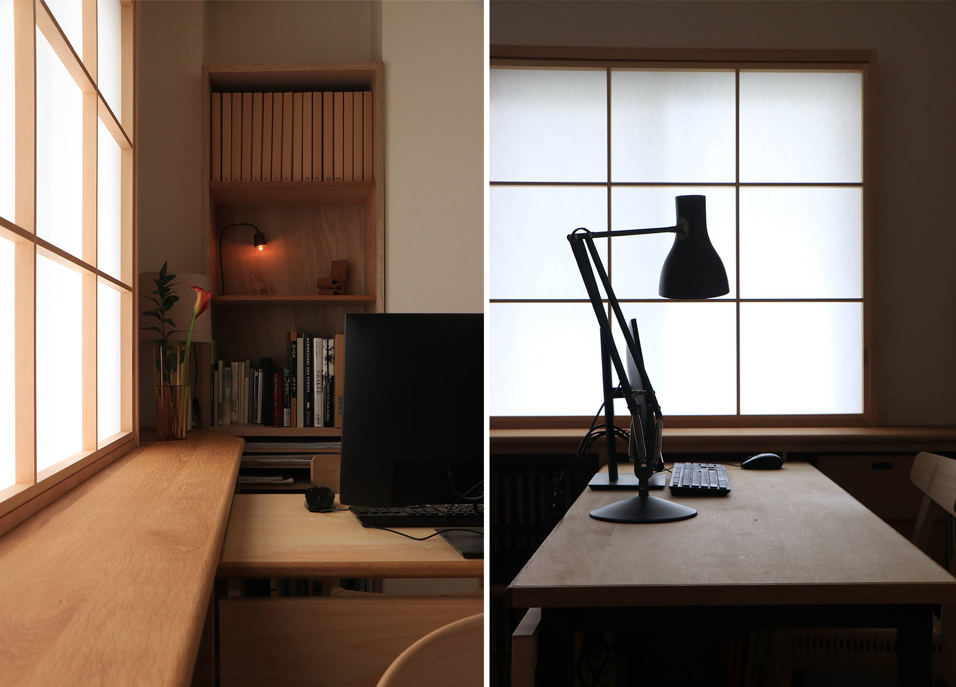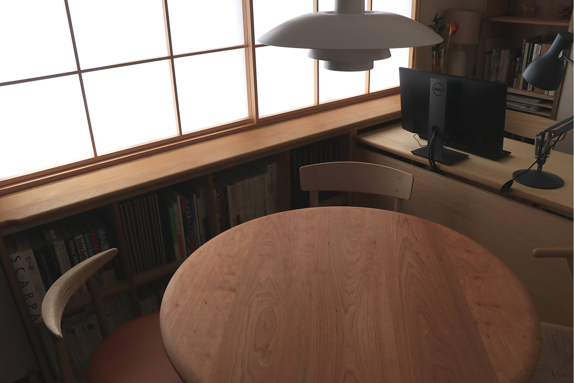 事務所はお客様と打合せをする場所にもなっています。私の肌感覚に合う素材や寸法を使って建具や本棚、机をつくっています。大工さんを呼ばず自分で作っている部分が多いので、精度は少し落ちますが、ものづくりの楽しさを少しでもお伝えできればと思います。円卓、椅子、照明は私の好きな名作と呼ばれる昔から在るものを中心に置いています。座り心地や肌触り、馴染み感、愛されている理由、造形の美しさやあかりの美しさ、本物の良さを少しでも感じて頂ければと思いますあまり期待値を上げるとがっかりされるかもしれません。とてもちいさな部屋ですので、ご了承ください。