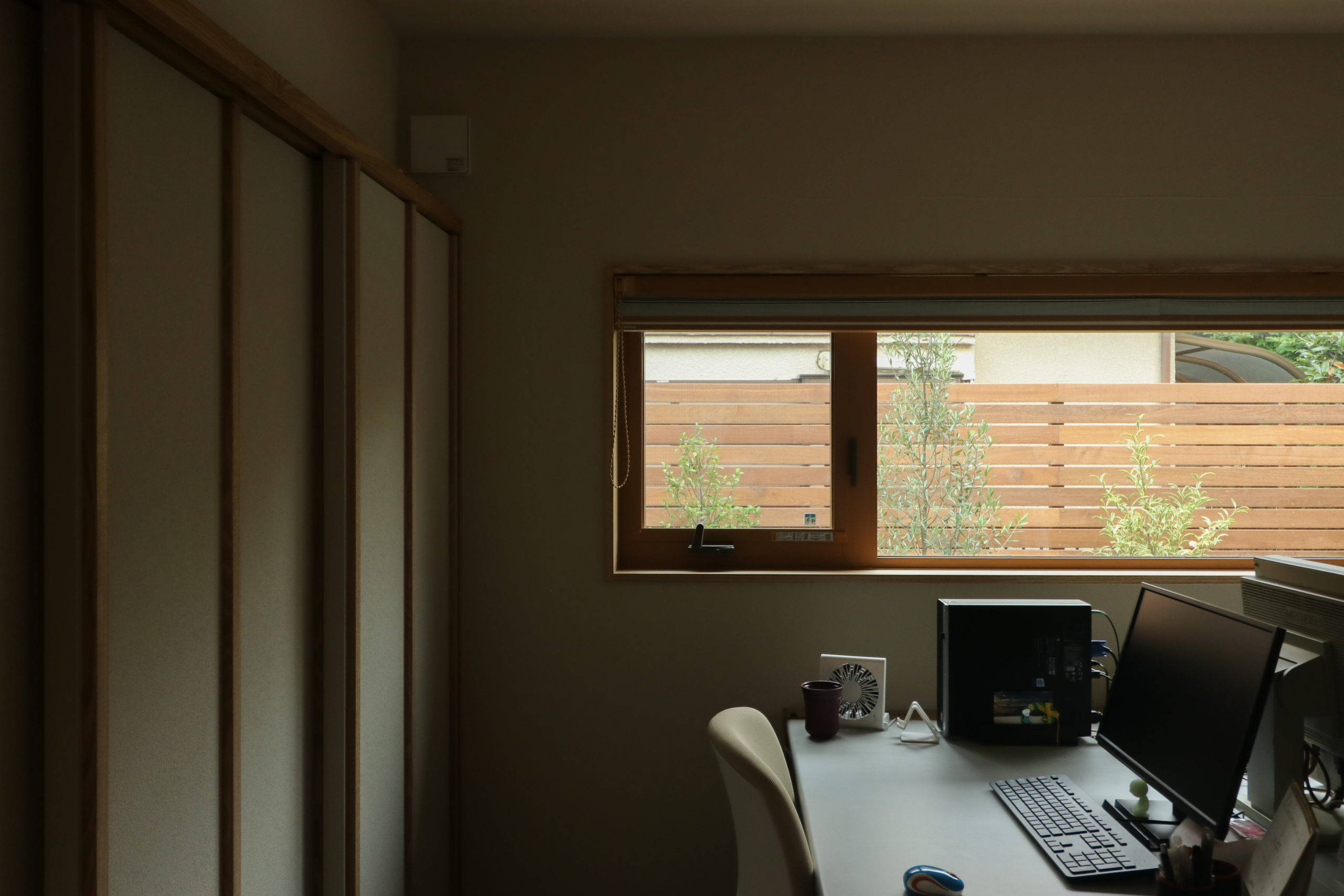 そしてこの一番良い場所に庭をつくりました。周囲からは見えない囲まれた庭。中庭のように室内に入らないと存在すら知る事のない庭です。来客はソファーに腰掛け庭を見ます。働く人は事務宝から椅子に座り庭を見る。季節や時間の変化を感じます。空の様子を伺ったり、木々の変化を感じたり、小鳥が囀ったり、平和で落ち着いた日常を想像して。この事務所の主役は室内ではなく、この庭にあります。この庭との関係を考える事が大切だと考えました。どう外とつながりどう外と遮断するか、それが人の居場所をつくるという事だと思います。この事務所を介して、人と外(自然)が番良い状態でつながるように。