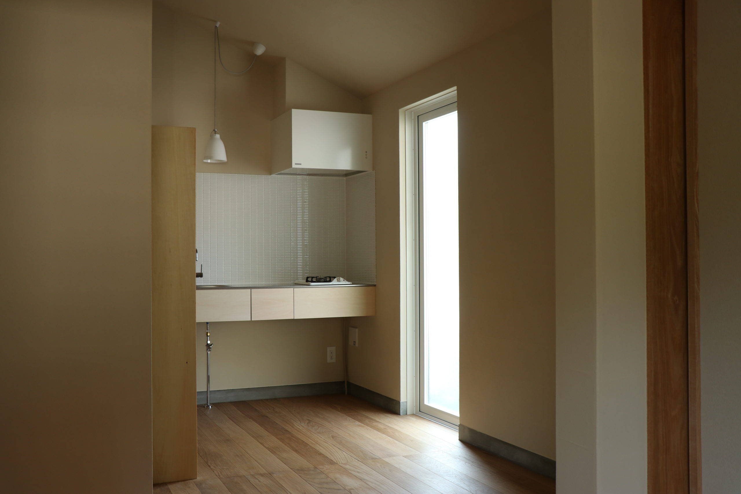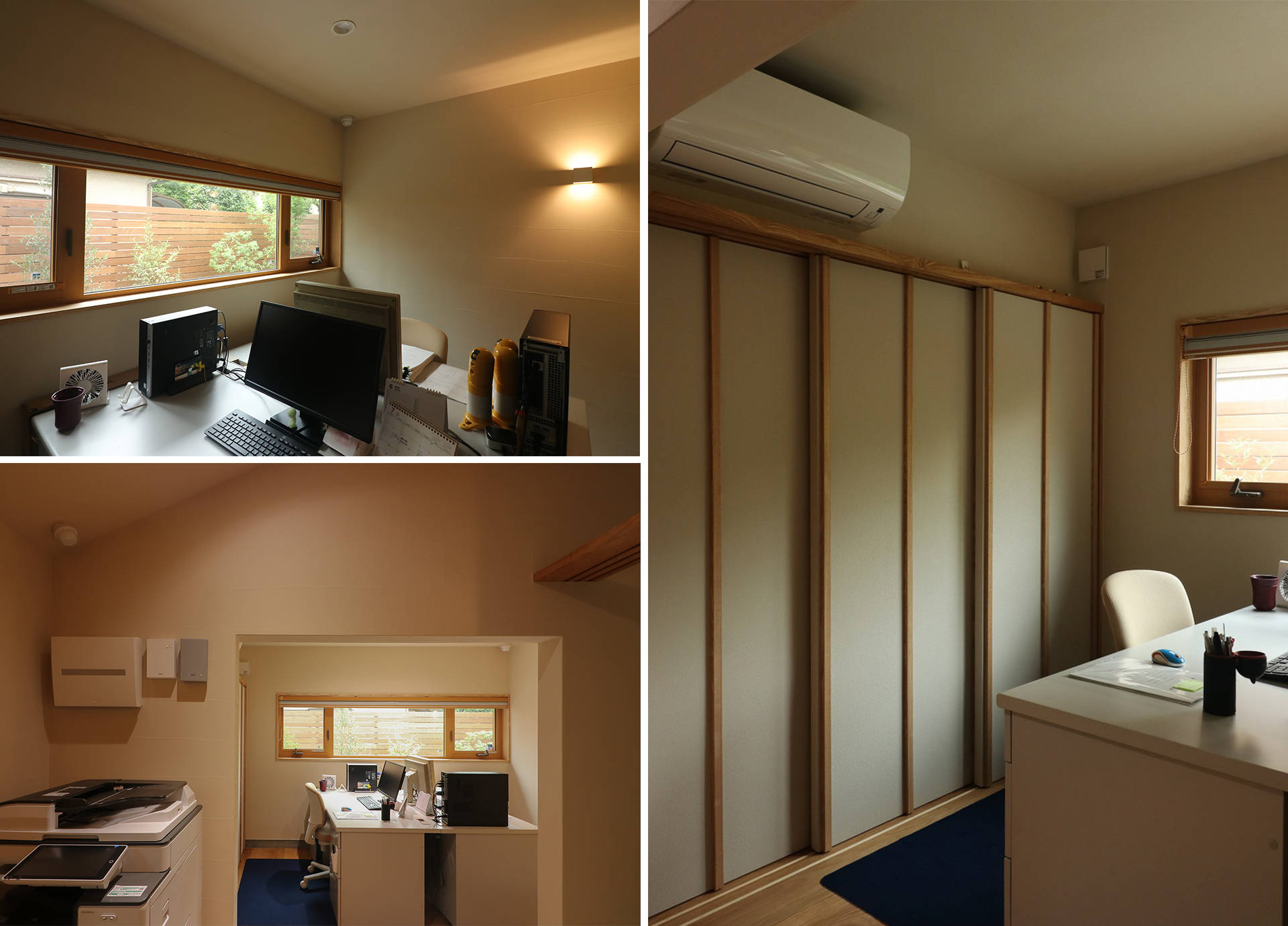内装には自然素材を多用しています。床は土足でも安心な傷にも強く丈夫なオーク無垢材。手が触れる所には無垢の木を使った引き戸や家具を。壁や天井には珪藻土を用い、表情豊かで空気感の良い場所になっています。また自然光が美しく感じられるようノイズの少ないピュアな壁や天井をつくるよう努めました。応接室と事務室、給湯室は引き戸で分け隔てられていますが、上部が開放され曲面の天井でつながります。視線を遮り、光や気配がつながる、そういう様子が美しい場所になりました。事務室のデスクが置かれた位置からは応接室の様子を程よく見る事ができます。反対に応接室からは事務室のデスクの様子がわからないよう適度な距離で斜めにつながっています。事務室と給湯率とは直線でつながり、応接宝からは給湯室は見えず、引き戸上部の気配でつながる。使われ方を想像し、機能的で動線の良い配置計画としました。