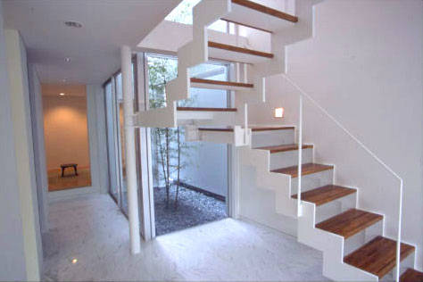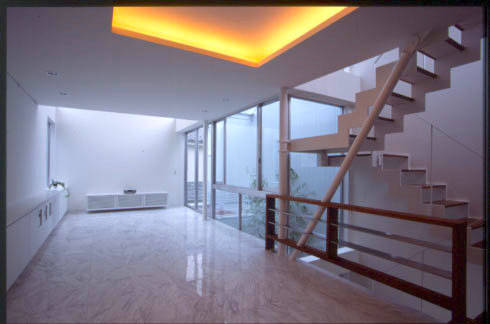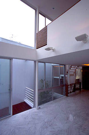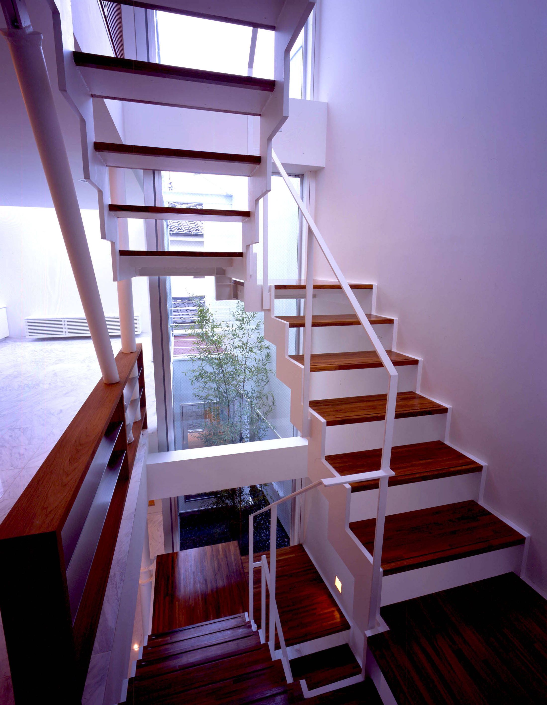 閉塞感のあるこの敷地で、いかに光と風を導き心地よい住まいを実現するかを課題とし、計画は、三層の長方形平面と斜めの敷地境界線に沿った大壁の2つの要素が基本的な要素となっている。その2つの要素の間に生まれた南北に細いスペースに、光庭、テラス、吹抜、スケルトン階段、トップライト、といった上下移動や屋内外の風と光を導く仕掛けを立体的にちりばめることで、多様でメリハリの効いた豊かな光景が連続する住まいとなっている。
