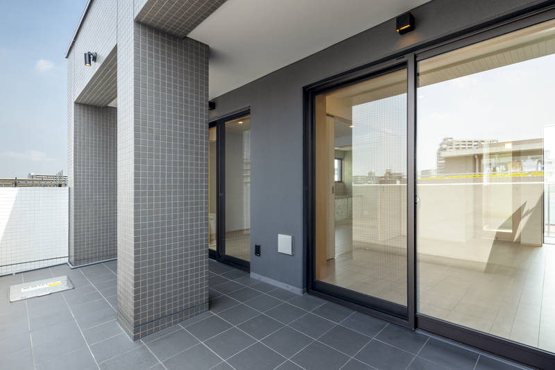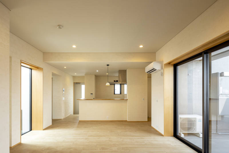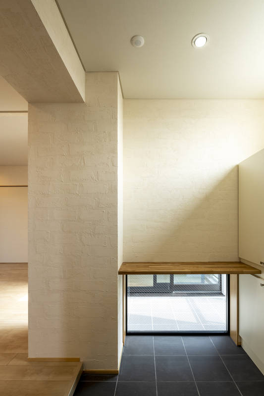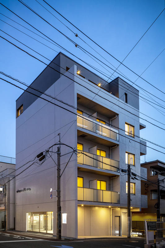 下町情緒が残る、都内の商店街に面した敷地に建つ、複合用途の建築です。1階に店舗、2~4階は賃貸住宅。最上階のオーナー住戸は、ワンフロア全て専有部となっているので、4面に開口部を設けることが出来、それほど広くない敷地でありながら、開放的で明るい空間をもたらしています。